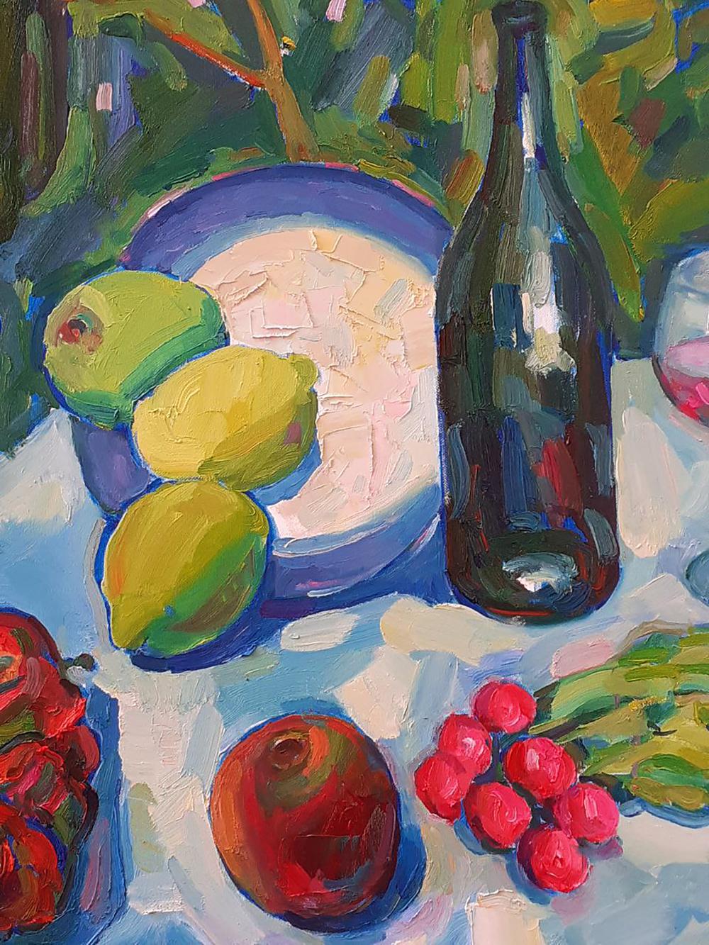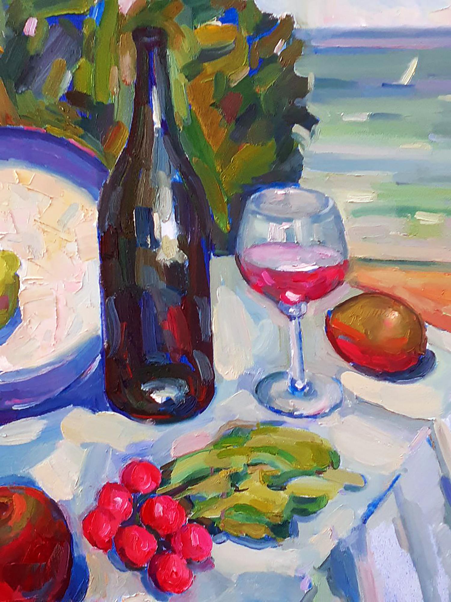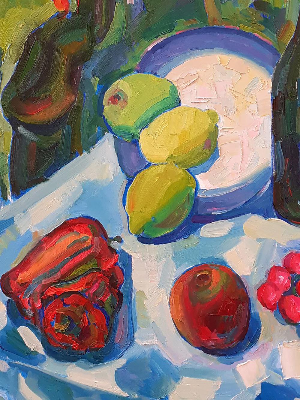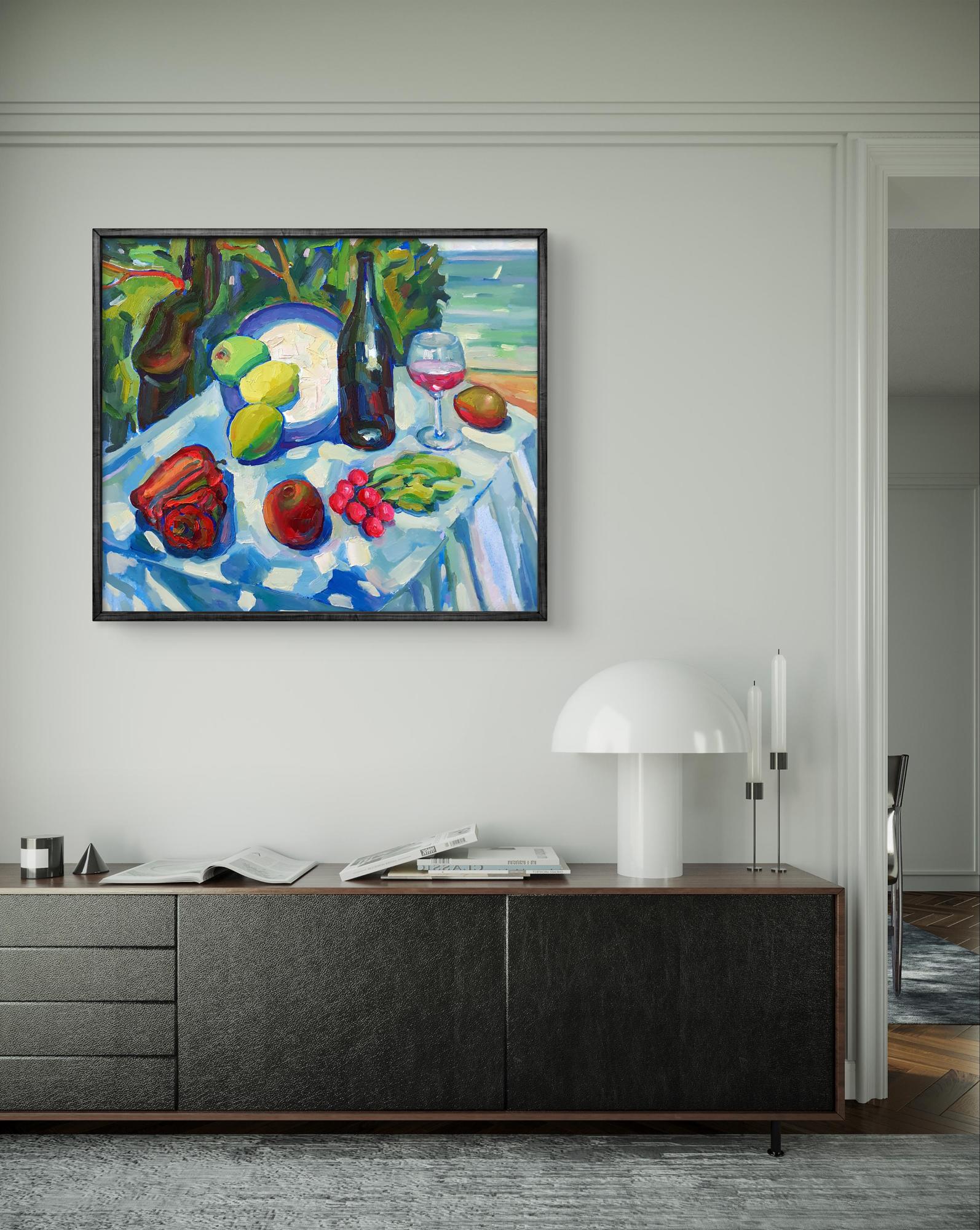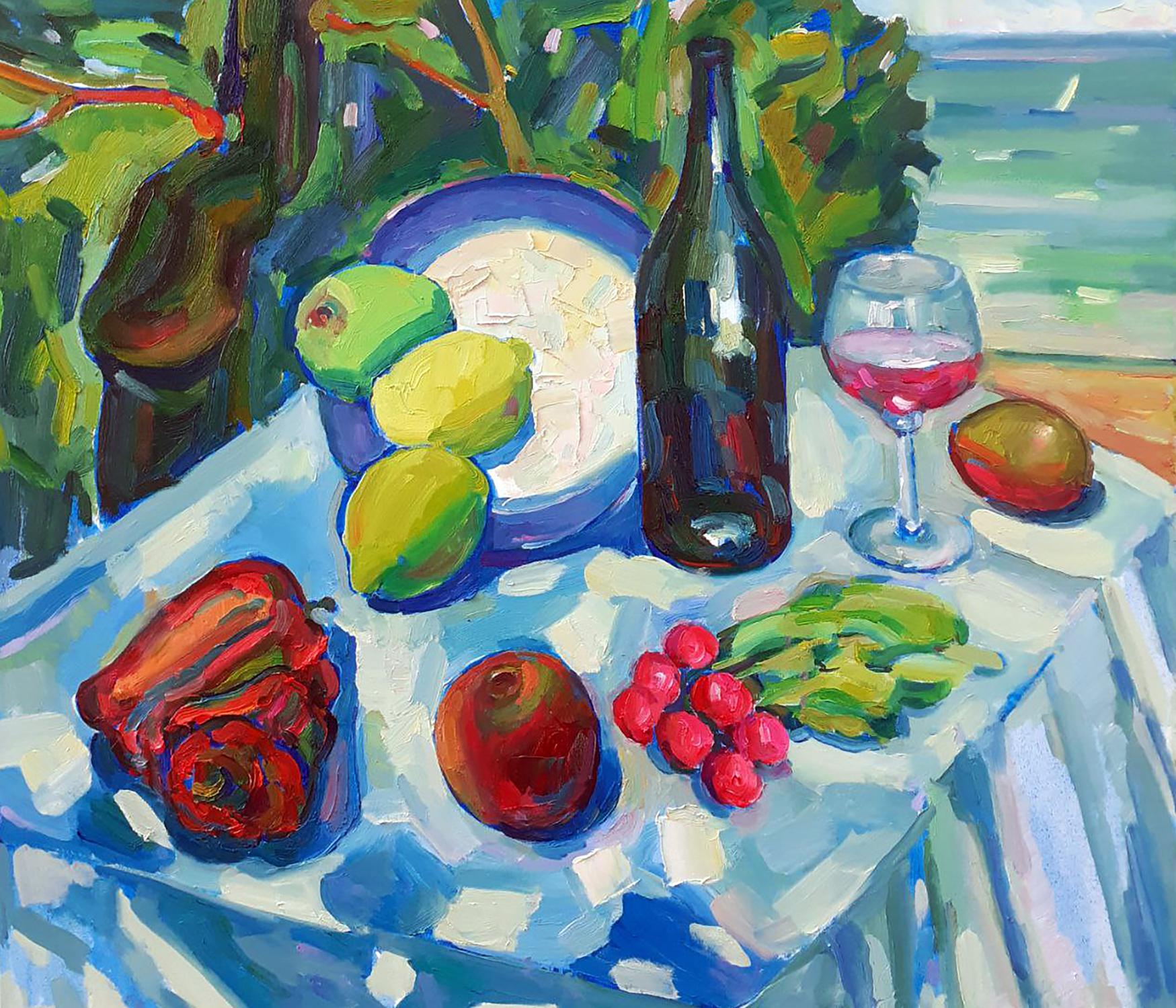 "Summer Day by the Sea" is a vibrant and evocative oil painting that captures the essence of a leisurely summer afternoon by the ocean. The composition features a colorful still life set against a lush backdrop of greenery and the serene expanse of the sea, creating a harmonious blend of nature and human enjoyment. In the foreground, a table is laden with an array of fresh fruits and a bottle of wine, inviting viewers to imagine a delightful picnic by the sea. A blue-rimmed plate holds a green apple, two bright yellow lemons, and a lime, their colors rendered with bold and expressive brushstrokes. The vivid hues of the fruits contrast beautifully with the cool blues and whites of the tablecloth. To the right of the plate, a dark wine bottle stands tall, its reflective surface capturing the surrounding colors and adding depth to the scene. Beside the bottle, a glass of rosé wine catches the light, its pink liquid glowing warmly. The glass, with its delicate reflections and transparency, adds a touch of elegance to the composition. Scattered across the table are other fruits and vegetables: a ripe red bell pepper, a shiny red apple, a cluster of bright red radishes, and a small bunch of green beans. Each item is painted with thick, textured brushstrokes that convey their freshness and vitality. In the background, the lush green foliage frames the scene, enhancing the sense of an idyllic, natural setting. The sea beyond is depicted with broad, sweeping strokes in shades of blue and green, evoking the gentle movement of the waves. A sailboat can be seen in the distance, adding a sense of scale and tranquility to the scene. The tablecloth, painted with a mosaic of blue and white patches, mirrors the colors of the sea and sky, creating a sense of unity and harmony throughout the composition. The interplay of light and shadow on the tablecloth adds depth and dimension, enhancing the overall realism and vibrancy of the painting. "Summer Day by the Sea" celebrates the simple pleasures of life and the beauty of nature. The vibrant colors and dynamic composition evoke a sense of joy, relaxation, and the carefree spirit of summer. The painting invites viewers to appreciate the abundance and richness of the natural world and to savor the moments of leisure and enjoyment that life offers. The juxtaposition of the fresh fruits and the serene seascape highlights the harmonious relationship between human enjoyment and the natural environment. The painting captures the essence of a perfect summer day, filled with warmth, color, and the soothing presence of the sea. This oil painting masterfully combines vibrant colors, dynamic brushstrokes, and a harmonious composition to create a lively and joyful scene. "Summer Day by the Sea" captures the viewer's attention with its bold visual impact and invites them to immerse themselves in the warmth and beauty of a leisurely summer afternoon by the ocean. It is a delightful and uplifting piece that resonates with the joy and abundance of nature and the seaside lifestyle.