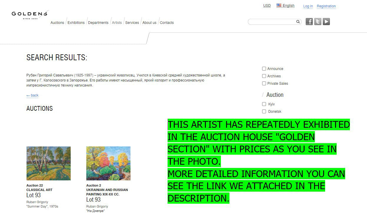 About the artists: Ruban Grigory Savelyevich (1925-1997) - Ukrainian painter. He studied at the Kyiv secondary art school, and then with G. Kolosovsky in Zaporozhye. His works have a rich, bright color and a professional impressionistic technique of writing.