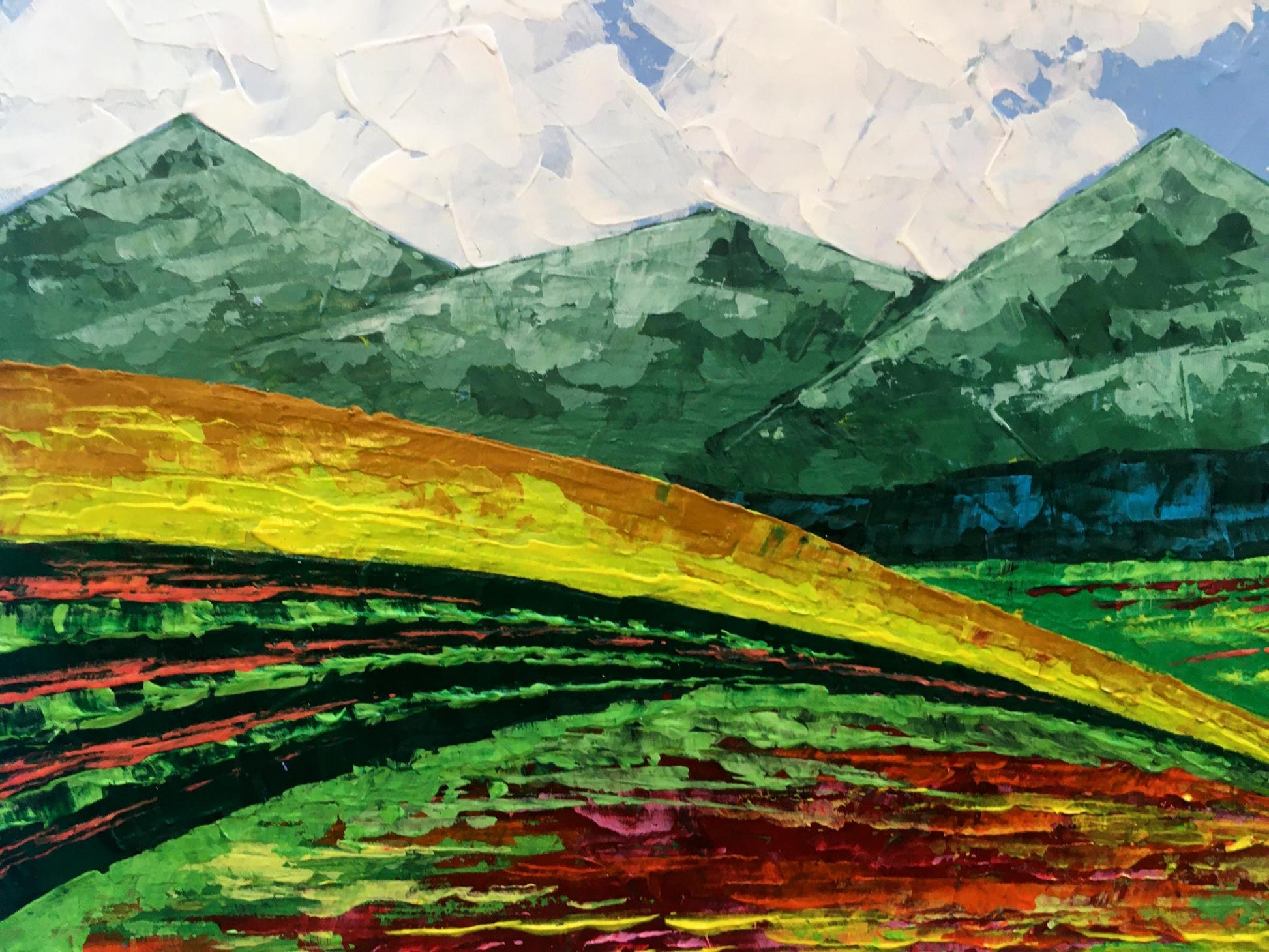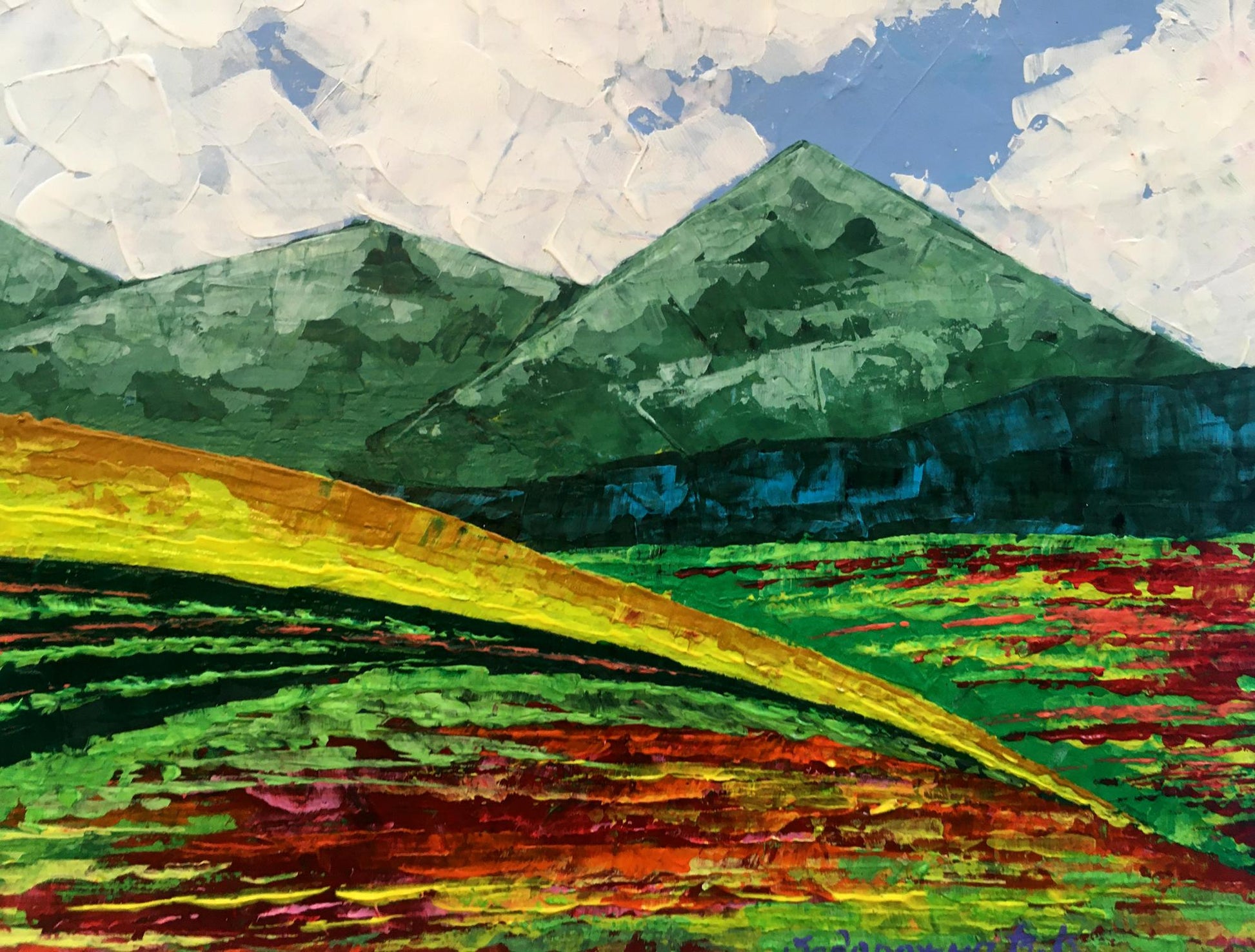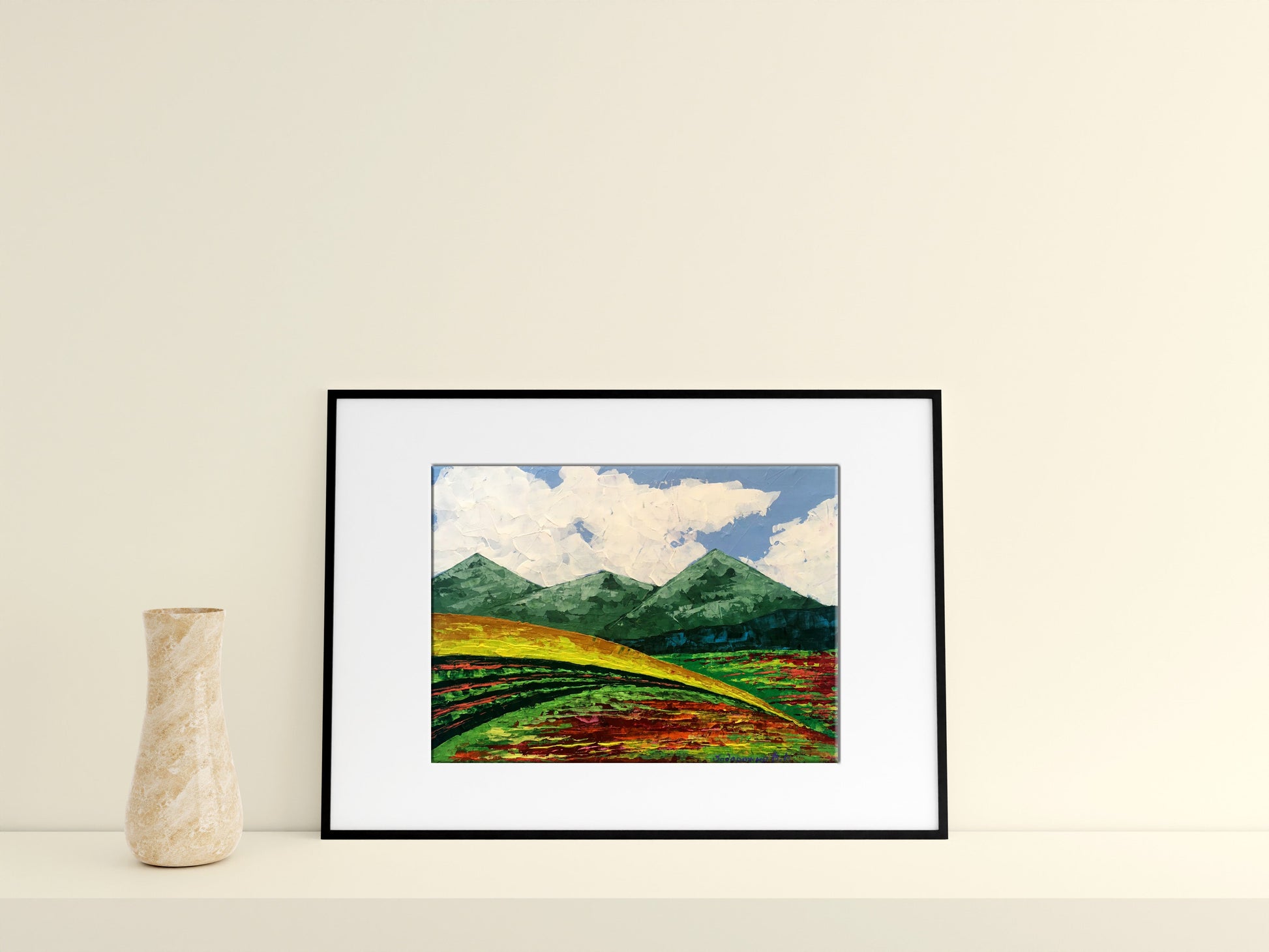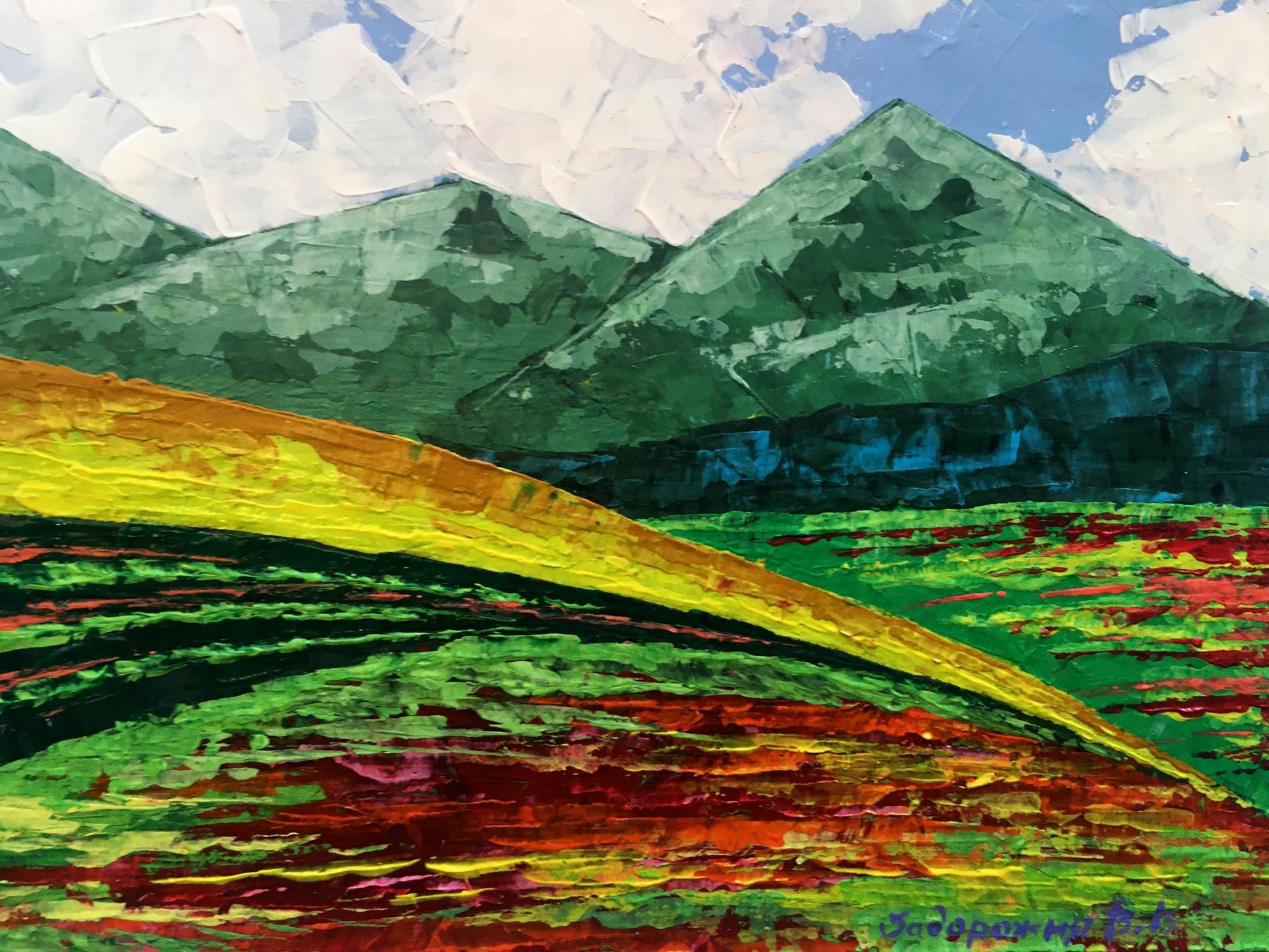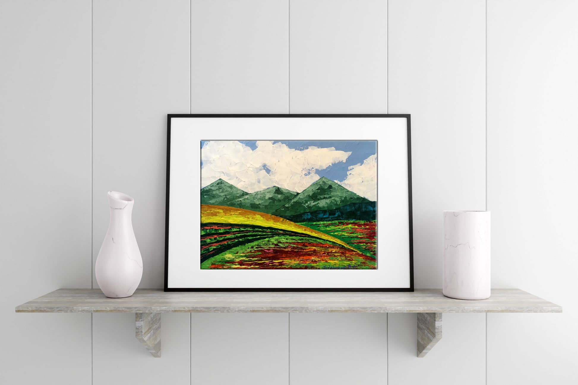 This oil painting depicts a stunning landscape of big, verdant green mountains in the background, which are majestically towering over the horizon. The sky above the mountains is adorned with soft, fluffy clouds that create a sense of depth and distance. In the foreground of the painting, a lush field takes center stage. The field is richly colored in warm and vibrant hues of yellow, red, and green, symbolizing the summer season. The colors of the field contrast beautifully with the cool greens and blues of the mountain range. The painting captures the essence of a bright and warm summer day, with the sun shining down on the idyllic scene. The field looks as if it's bursting with life, with flowers blooming, and trees swaying in the gentle breeze. The mountains, with their rocky and rugged terrain, appear immovable and steadfast. Overall, the painting is a beautiful celebration of nature's majesty and beauty, with its vibrant colors and breathtaking landscapes. It invites the viewer to step into a peaceful and serene world, where the mountains and the fields coexist in perfect harmony.