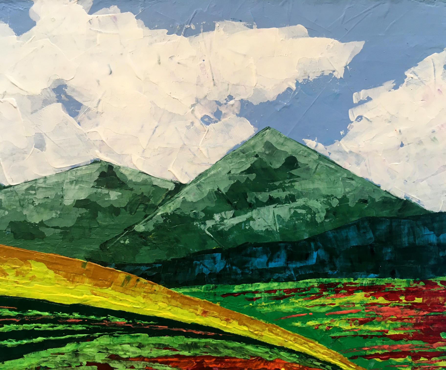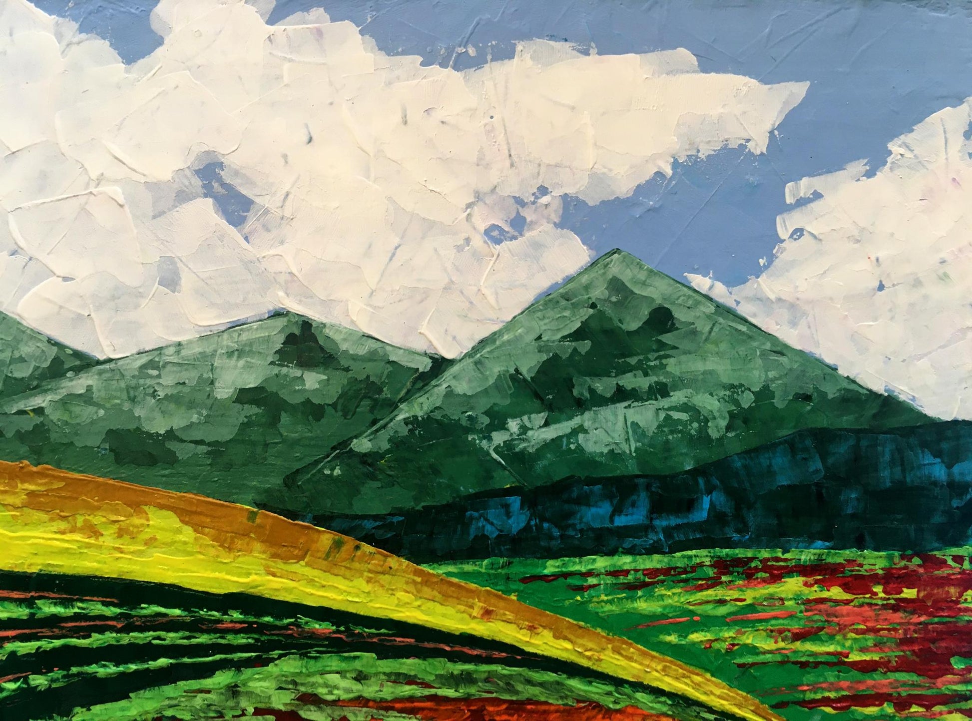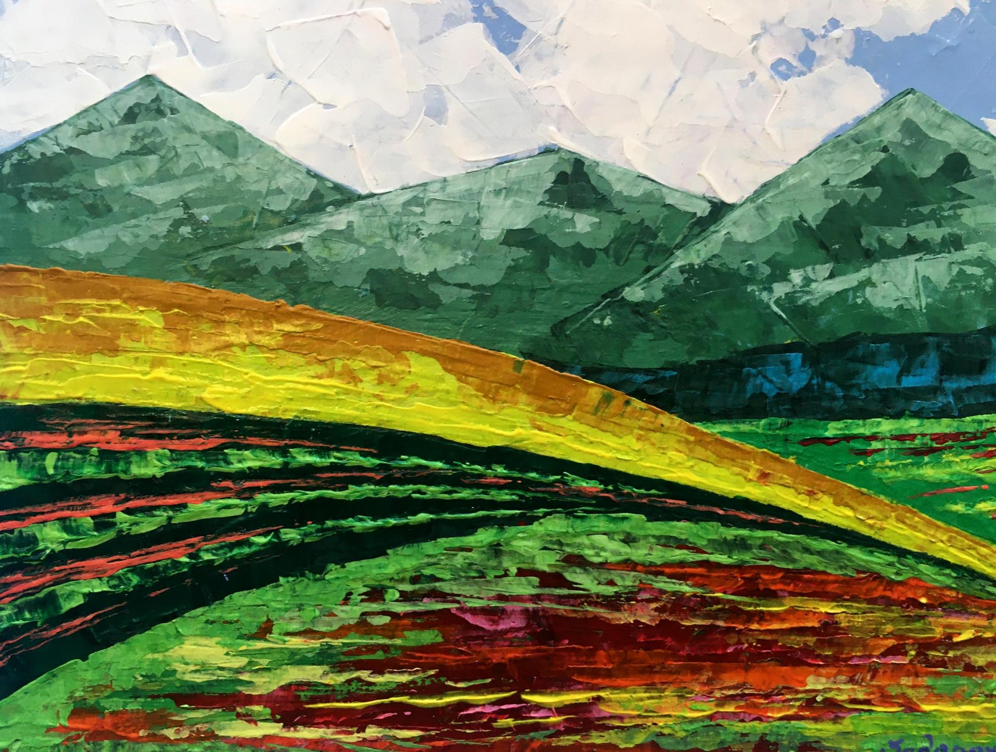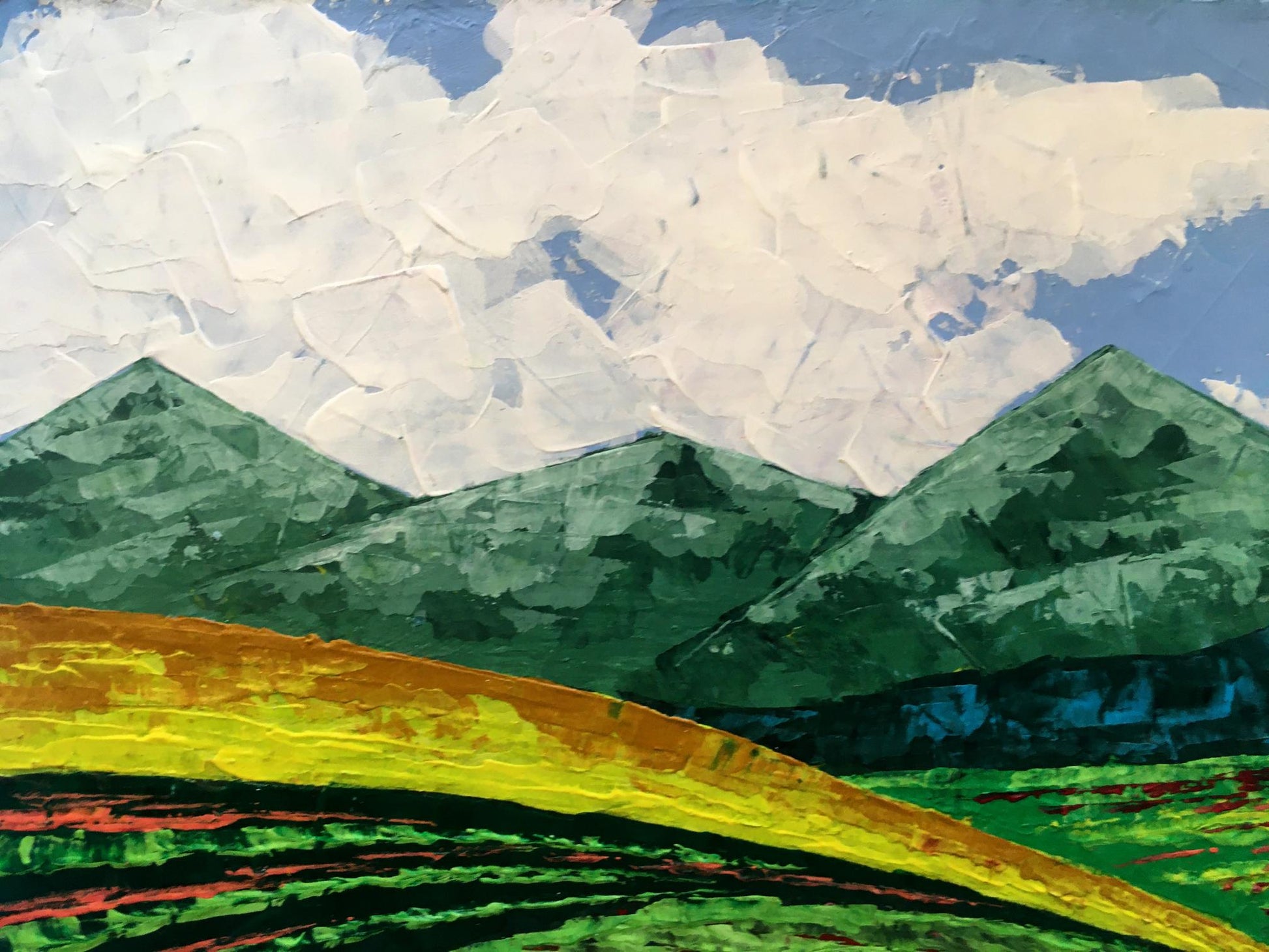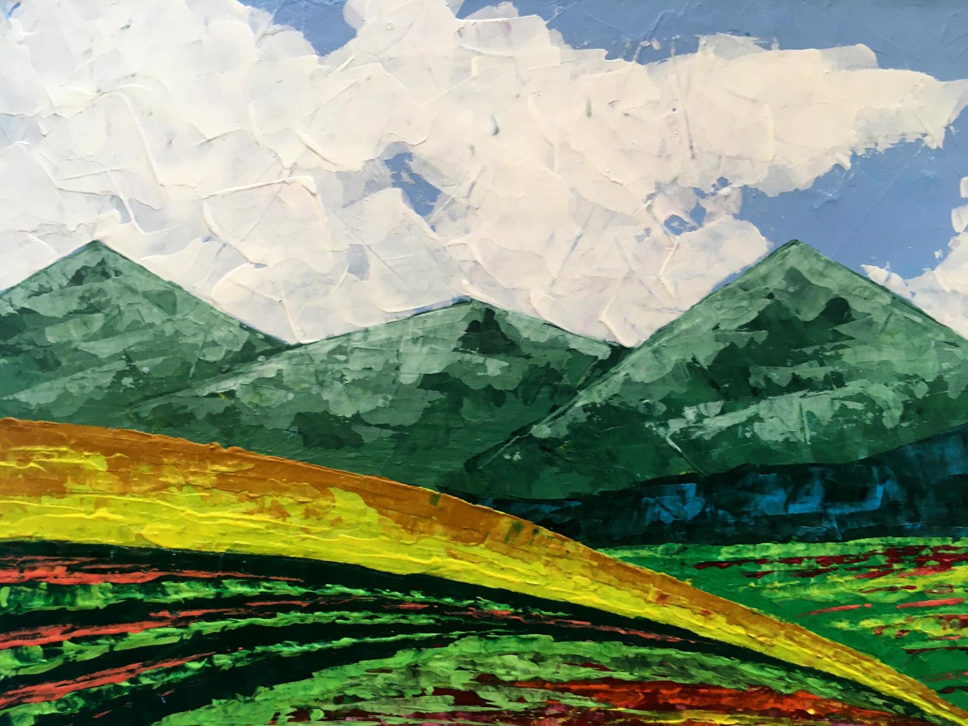 This oil painting depicts a stunning landscape of big, verdant green mountains in the background, which are majestically towering over the horizon. The sky above the mountains is adorned with soft, fluffy clouds that create a sense of depth and distance. In the foreground of the painting, a lush field takes center stage. The field is richly colored in warm and vibrant hues of yellow, red, and green, symbolizing the summer season. The colors of the field contrast beautifully with the cool greens and blues of the mountain range. The painting captures the essence of a bright and warm summer day, with the sun shining down on the idyllic scene. The field looks as if it's bursting with life, with flowers blooming, and trees swaying in the gentle breeze. The mountains, with their rocky and rugged terrain, appear immovable and steadfast. Overall, the painting is a beautiful celebration of nature's majesty and beauty, with its vibrant colors and breathtaking landscapes. It invites the viewer to step into a peaceful and serene world, where the mountains and the fields coexist in perfect harmony.