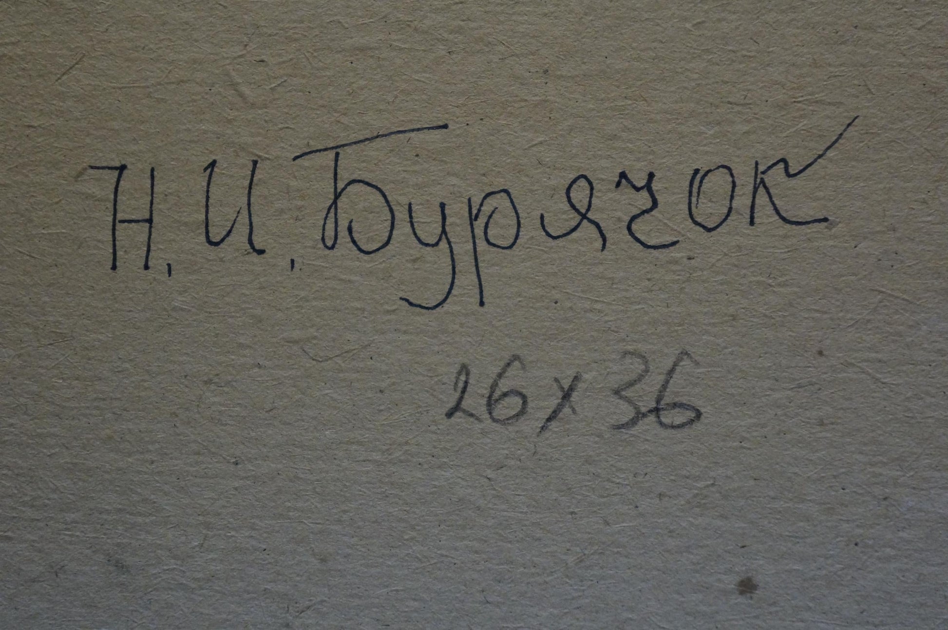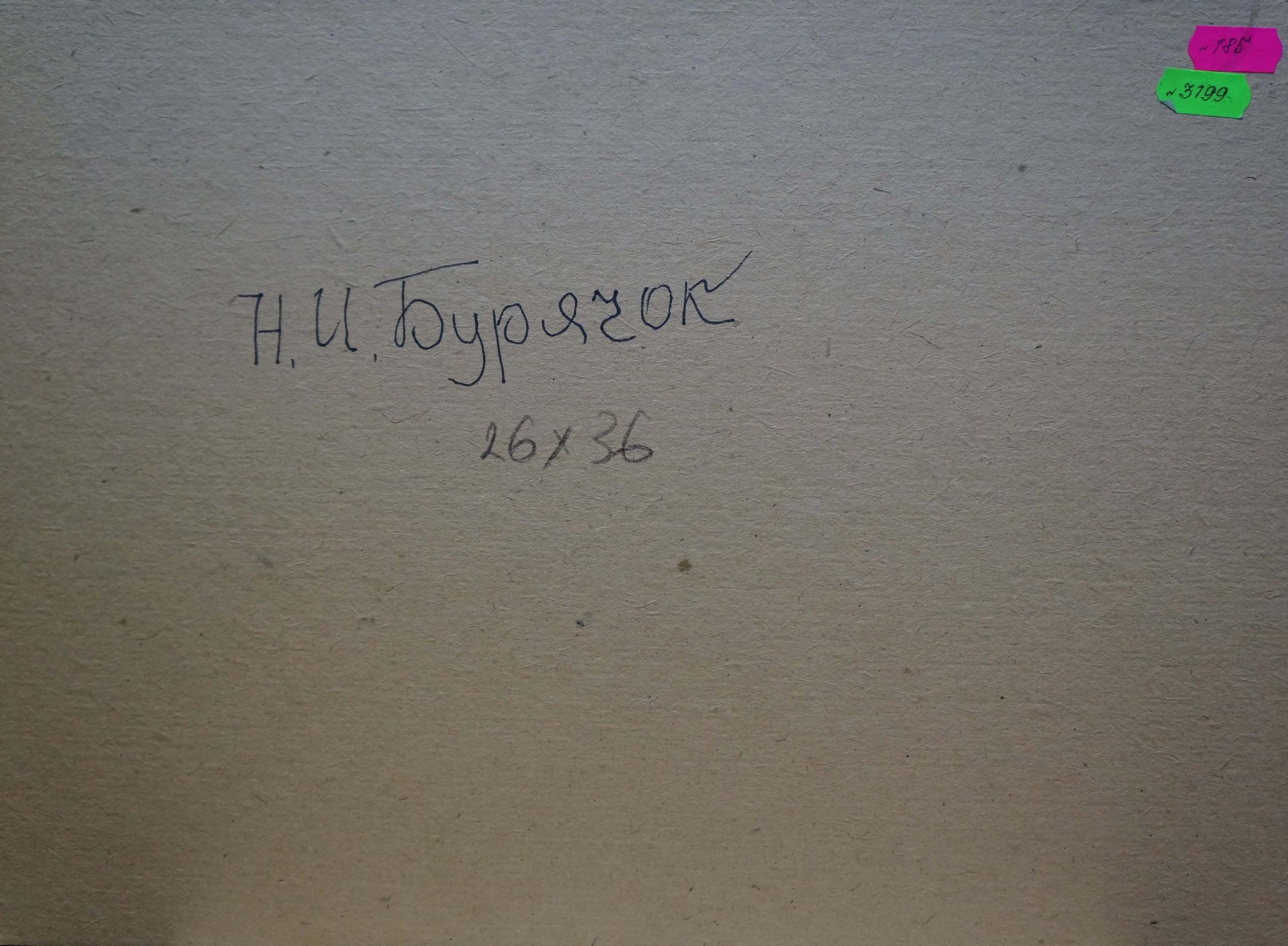 About the artist: Born on August 05 (18?), 1911, in Kiev. Son of I. Buryachka. Studied at the Kiev Art Institute (1940), at the Academy of Arts in Latvia (1945-50). Teachers in the specialty: L. Svemp and V. Skulme. Architect, painter, restorer, art critic. He used subjects of folk arts and crafts, expanding the boundaries of the genre, as well as landscape works, in which he synthesized the traditions of Russian painting. His work is characterized by laconicism. He worked as an artist in the House of Culture at the Bolshevik plant (1933-1935). As a decorator, he took part in the design of the performances of the Kiev Opera, the Kiev Theater of Musical Comedy and the Youth Theater. Major works - "Self-portrait", "Courtyard of St. Sophia of Kiev" (1957), "Summer", "View of the Hem" (1958), "Dahlias" (1959), "Sea Waves" (1960), "Flowers on the Window", “House in Sednev” (1962), “Winter Landscape in the Crimea” (1963). Participated in the painting of ceiling lamps in the Palace of Culture of the Koksokhimsky Combine in the city of Horlivka, Donetsk region (1951), in the development of the project of the Triumphal Arch of the reunification of Russia and Ukraine in Kiev, completed a panel (sketch and its embodiment) in the House of Culture in Novaya Kakhovka, Kherson region (1956) ... Participated in the restoration of frescoes in St. Sophia Cathedral and the restoration of the Bakhchisarai Palace in the Crimea (1957-1963). He created a number of mosaic panels in various cities of Ukraine: school number 22 in the city of Kremenchug, Poltava region (1965); front wall of the restaurant of the airport "Zhulyany" in Kiev (1970). Lived and worked in Kiev, died on January 13, 1977.