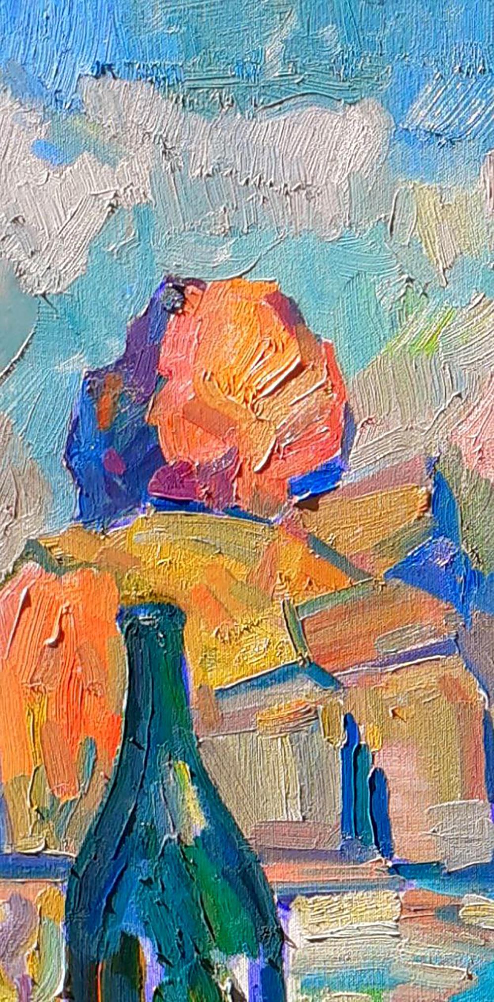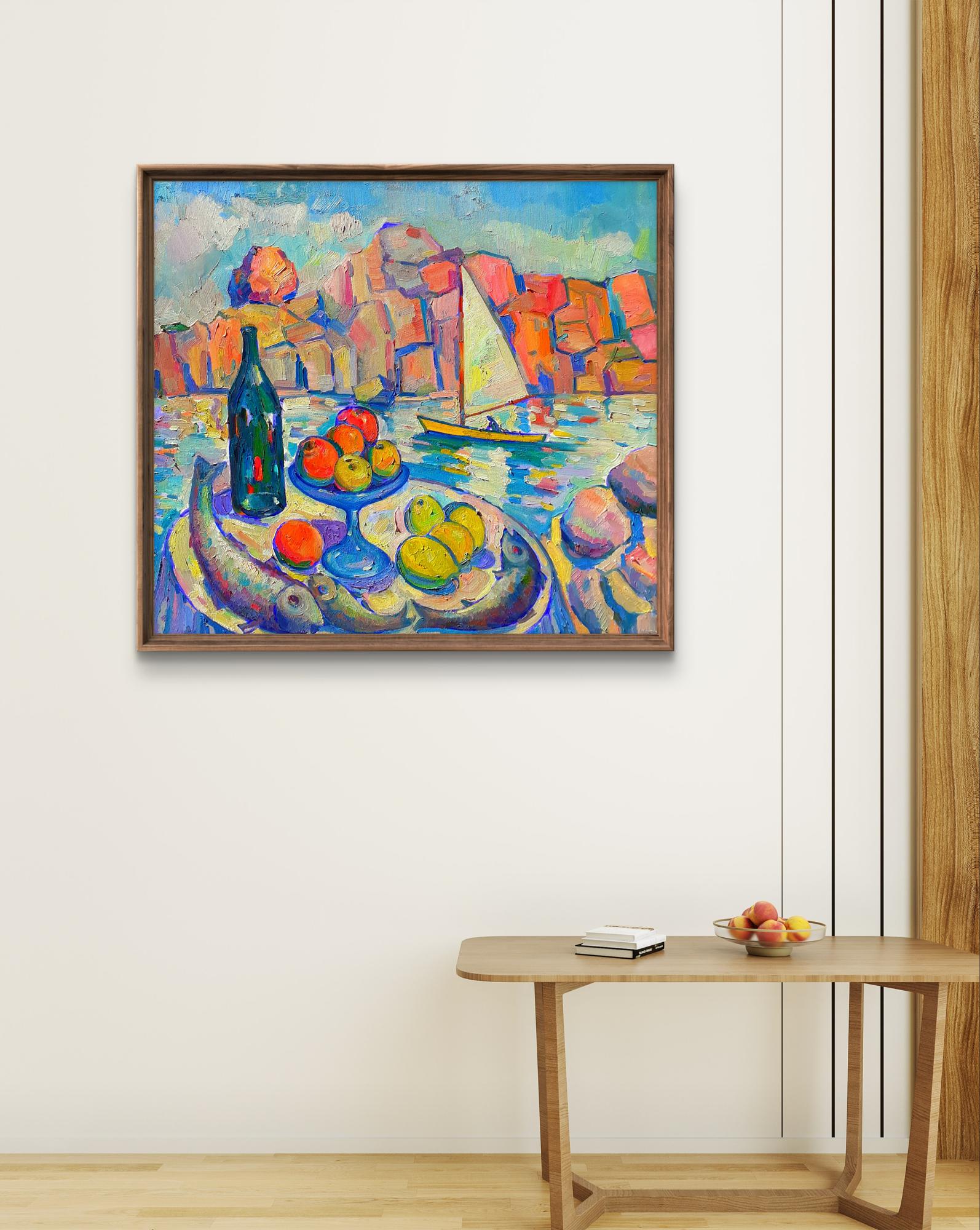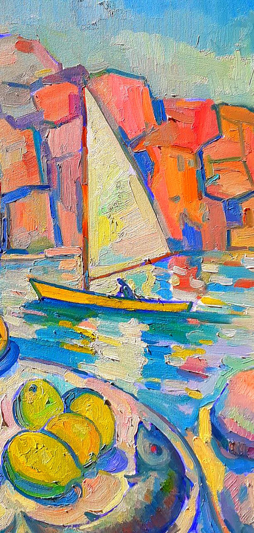 "Sunday Afternoon on the Shore" is a vibrant and colorful oil painting that captures the essence of a leisurely day by the sea. The composition is filled with lively hues and dynamic brushstrokes, creating an atmosphere of joy and relaxation. The foreground of the painting features a table laden with an assortment of fresh produce and a bottle of wine. A pedestal dish holds a variety of fruits, including bright red apples, yellow lemons, and green pears, their colors rendered with bold and expressive strokes. The fruit's rich tones add a sense of abundance and vitality to the scene. To the left of the pedestal dish, a dark green wine bottle stands tall, its reflective surface capturing glimpses of the surrounding colors. Below the bottle, a fresh fish is laid out on the table, its silvery scales depicted with a mix of blues and purples, suggesting the play of light on its surface. The inclusion of the fish emphasizes the connection to the sea and the fresh bounty it provides. In the background, the seascape is painted with a harmonious blend of blues, greens, and pinks, evoking the serene beauty of the ocean. Sailboats with white sails dot the water, adding a sense of movement and activity. The shoreline is depicted with colorful, abstract shapes that suggest buildings or cliffs, painted in warm hues of orange, pink, and yellow. These shapes create a vibrant contrast with the cooler tones of the sea and sky. The use of thick, textured brushstrokes throughout the painting adds depth and dimension, making the objects appear almost tangible. The overall composition is balanced and harmonious, with the elements of the still life in the foreground seamlessly blending into the lively seascape in the background. "Sunday Afternoon on the Shore" celebrates the simple pleasures of life and the beauty of a day spent by the sea. The vibrant colors and dynamic composition evoke a sense of joy and relaxation, inviting viewers to imagine themselves in this idyllic setting. The painting emphasizes the connection between nature and human enjoyment, highlighting the abundance and richness of the seaside lifestyle. The use of bold, expressive brushstrokes and bright colors suggests a spontaneous and carefree approach, reflecting the artist's joy in capturing the scene. The presence of both fresh produce and a fresh catch of fish symbolizes the harmony between land and sea, and the bounty that both provide. This oil painting masterfully combines vibrant colors, dynamic brushstrokes, and a harmonious composition to create a lively and joyful scene. "Sunday Afternoon on the Shore" captures the viewer's attention with its bold visual impact and invites them to immerse themselves in the warmth and beauty of a leisurely day by the sea. It is a delightful and uplifting piece that resonates with the joy and abundance of nature and the seaside lifestyle.