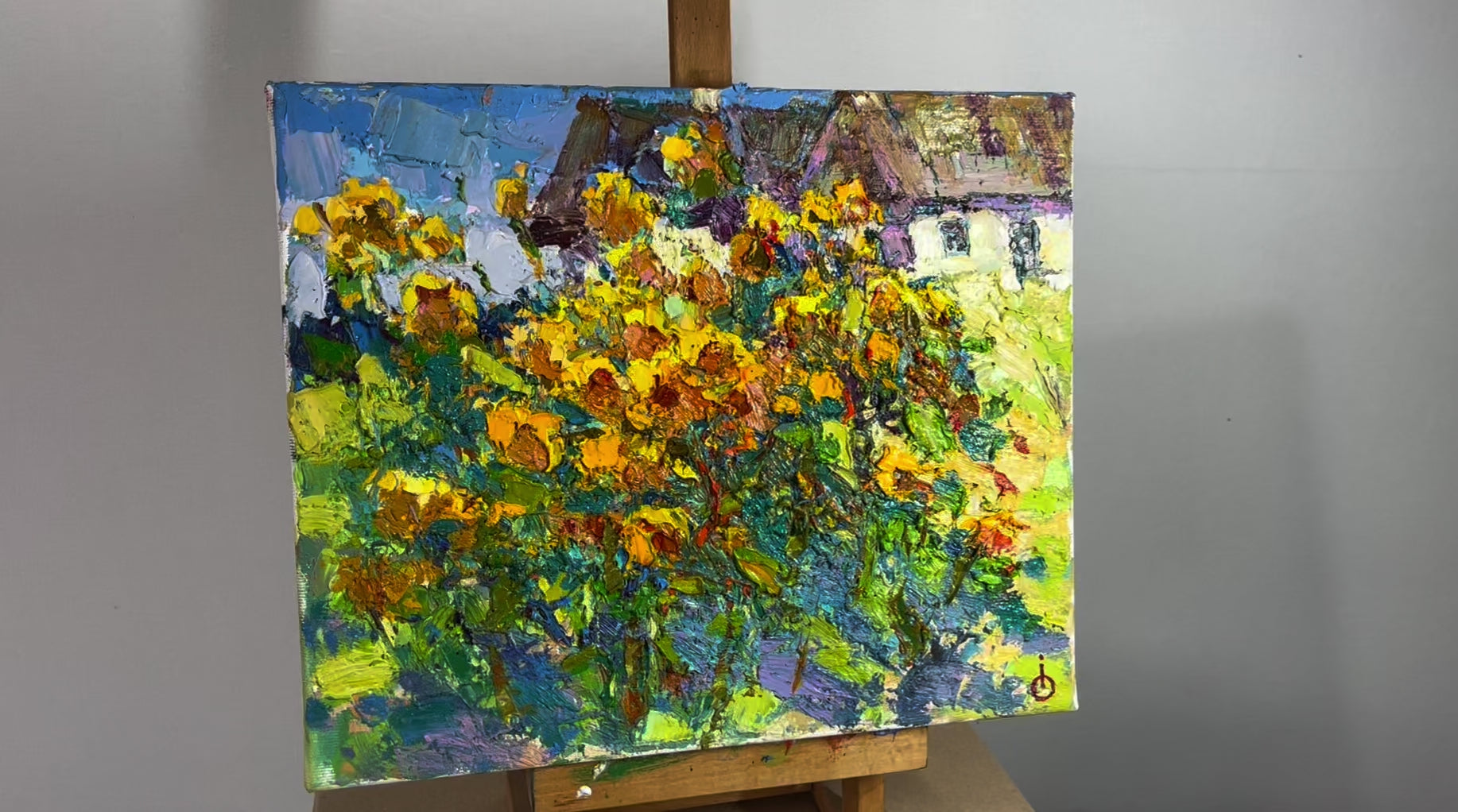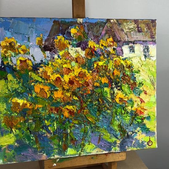 "Sunny Yard" is a compelling oil painting by Oksana Ivanyuk that embodies the vibrant essence of a garden bathed in sunlight. This artwork is an integral part of our Collection of Painting with Flower, showcasing a mastery in capturing the natural beauty and vivid colors of a rural garden.