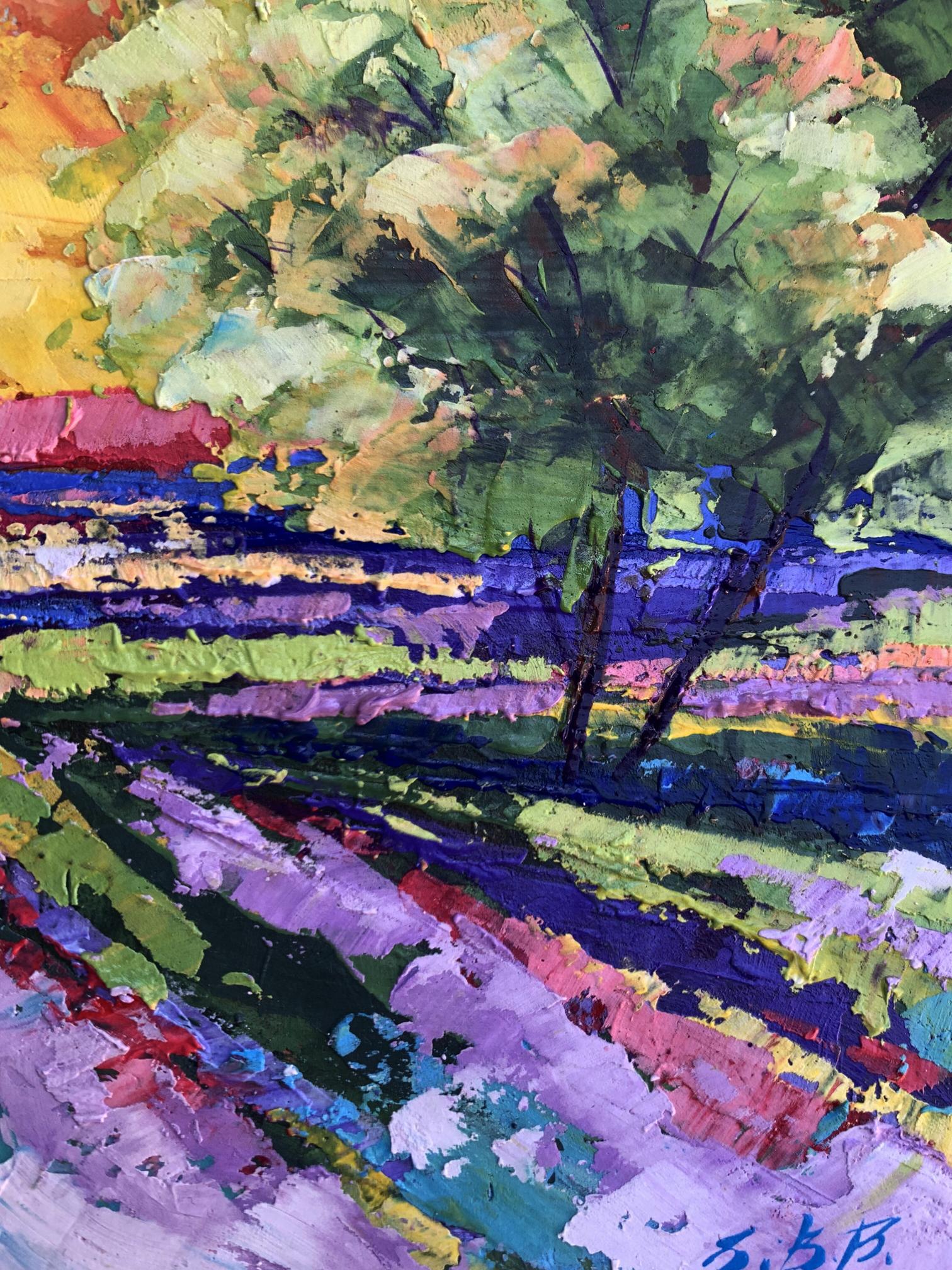 "Sunset in the Field" is a captivating oil painting that beautifully captures the serene and vibrant essence of a field bathed in the warm hues of a setting sun. The artist employs a rich palette of colors and dynamic brushstrokes to create a vivid and immersive landscape. The painting's color palette is both warm and vibrant, effectively conveying the beauty of the sunset and the lushness of the field. The sky is a blend of warm oranges, yellows, and reds, transitioning to softer blues and purples as it reaches the horizon. The use of thick, textured brushstrokes gives the sky a dynamic and almost tactile quality. The field itself is a tapestry of colors, with rows of greenery interspersed with patches of purples, blues, and pinks. The vibrant colors are applied with bold, impasto strokes, creating a rich texture that enhances the visual depth of the landscape. The trees on either side of the field are painted in lush greens, providing a natural frame for the central scene. The textured brushstrokes add a sense of movement and life to the trees. The composition of "Sunset in the Field" draws the viewer's eye towards the horizon, creating a sense of depth and perspective. The rows of the field lead the eye directly to the center of the painting, where the sun is setting, casting a golden glow over the landscape. The trees on either side of the field act as natural frames, guiding the viewer's gaze towards the sunset and adding a sense of balance to the composition. The horizontal rows of the field contrast with the verticality of the trees, creating a dynamic interplay that enhances the overall composition. The field, with its rows of vibrant colors, is the focal point of the painting. The artist's use of bold, textured strokes brings the field to life, making it appear almost three-dimensional. The setting sun, with its warm, golden hues, casts a beautiful glow over the entire scene. The sun's light blends seamlessly with the colors of the sky and field, creating a harmonious and soothing atmosphere. The use of impasto technique, where paint is applied thickly, gives the painting a rich texture. This adds depth and dimension, making the landscape feel more tangible and inviting. The mood of "Sunset in the Field" is one of tranquility and natural beauty. The warm colors and dynamic brushstrokes create a sense of peace and contentment, inviting viewers to lose themselves in the serene landscape. The painting evokes a feeling of being in harmony with nature, experiencing the quiet beauty of a sunset over a vibrant field. "Sunset in the Field" can be interpreted as a celebration of nature's beauty and the serene moments that can be found in everyday life. The artist's use of vivid colors and textured brushstrokes captures the essence of a peaceful sunset, reminding viewers of the simple yet profound beauty of the natural world. Overall, "Sunset in the Field" is a stunning representation of a serene landscape at sunset. The artist's skillful use of color and texture creates a vivid and immersive scene that captures the viewer's imagination and transports them to a place of natural beauty and tranquility.