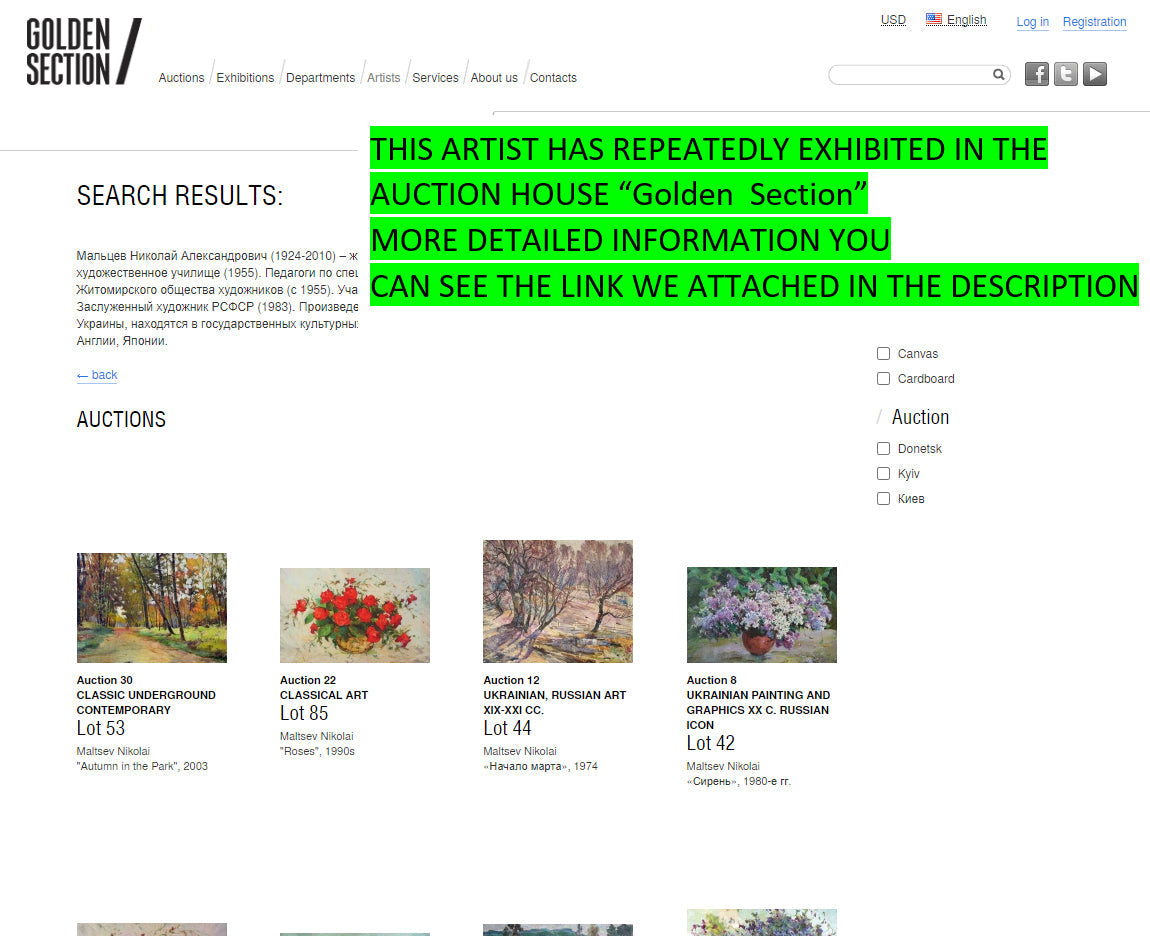 About the artists: Maltsev Nikolai Alexandrovich (1924-2010) - painter. Was born in Irkutsk, Russia. Graduated from the Kharkov Art School (1955). Teachers by specialty - P. Shigimaga, M. Slipchenko, A. Constantinopolsky. Member of the Zhytomyr Society of Artists (since 1955). Participant of many republican and all-Union exhibitions (since 1967). Honored Artist of the RSFSR (1983). The artist's works have been repeatedly purchased by the Ministry of Culture of Ukraine, are in state cultural institutions, as well as private collections in Ukraine, Russia, France, England, Japan.