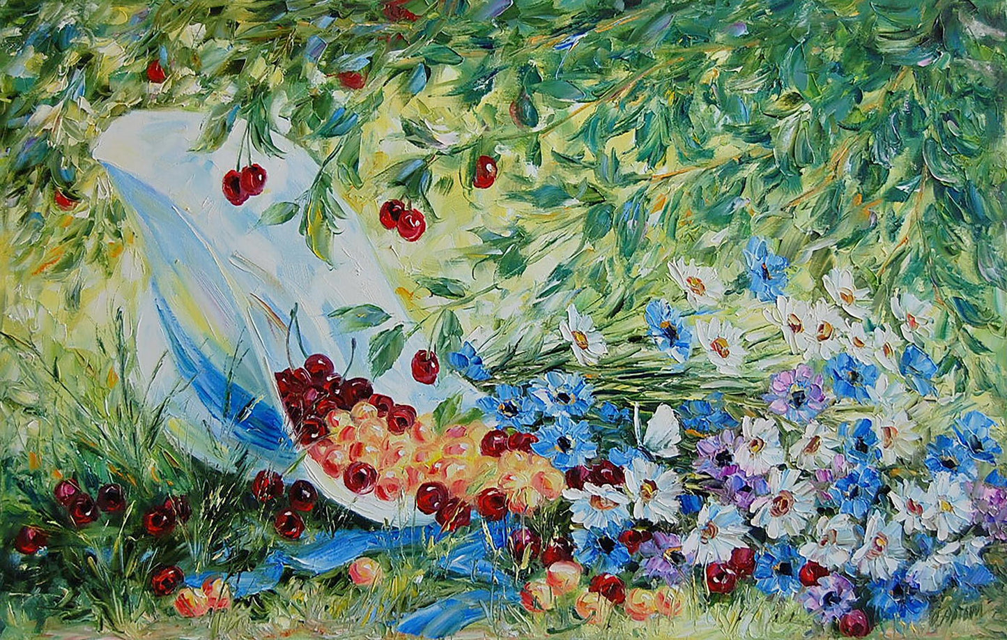 In "Sweet July," Ukrainian artist Olga Artim beautifully captures the essence of a warm summer day, filled with the lush richness of nature. The painting features a vibrant arrangement of ripe cherries spilling from a basket, surrounded by delicate blue and white flowers in full bloom. The rich green leaves overhead create a natural canopy, enhancing the sense of warmth, serenity, and tranquility. This idyllic summer scene is perfect for any Collection of Still lifes or Collection of Painting with Flowers.