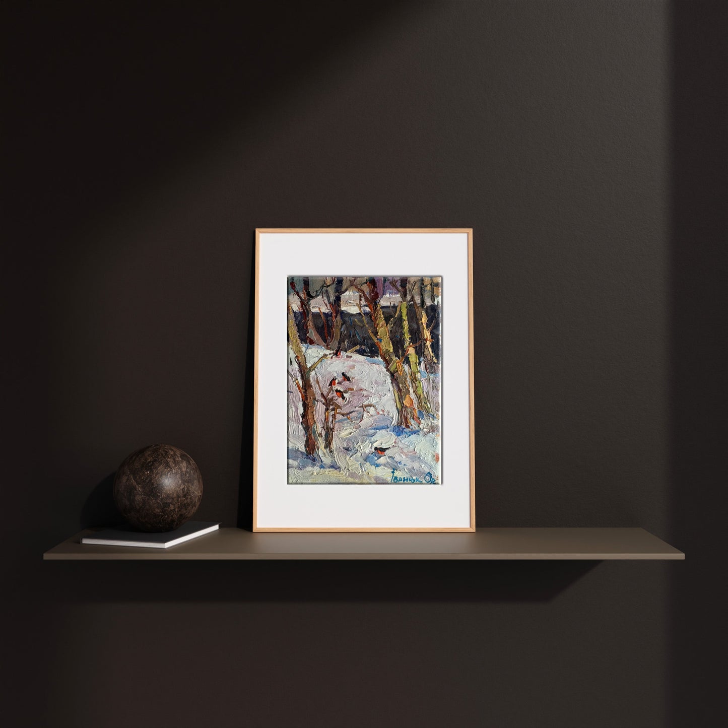 "The birds have arrived in winter" is an enchanting oil painting by Ivanyuk Oksana, capturing the serene beauty of the winter season in an exquisite tapestry of colors and textures