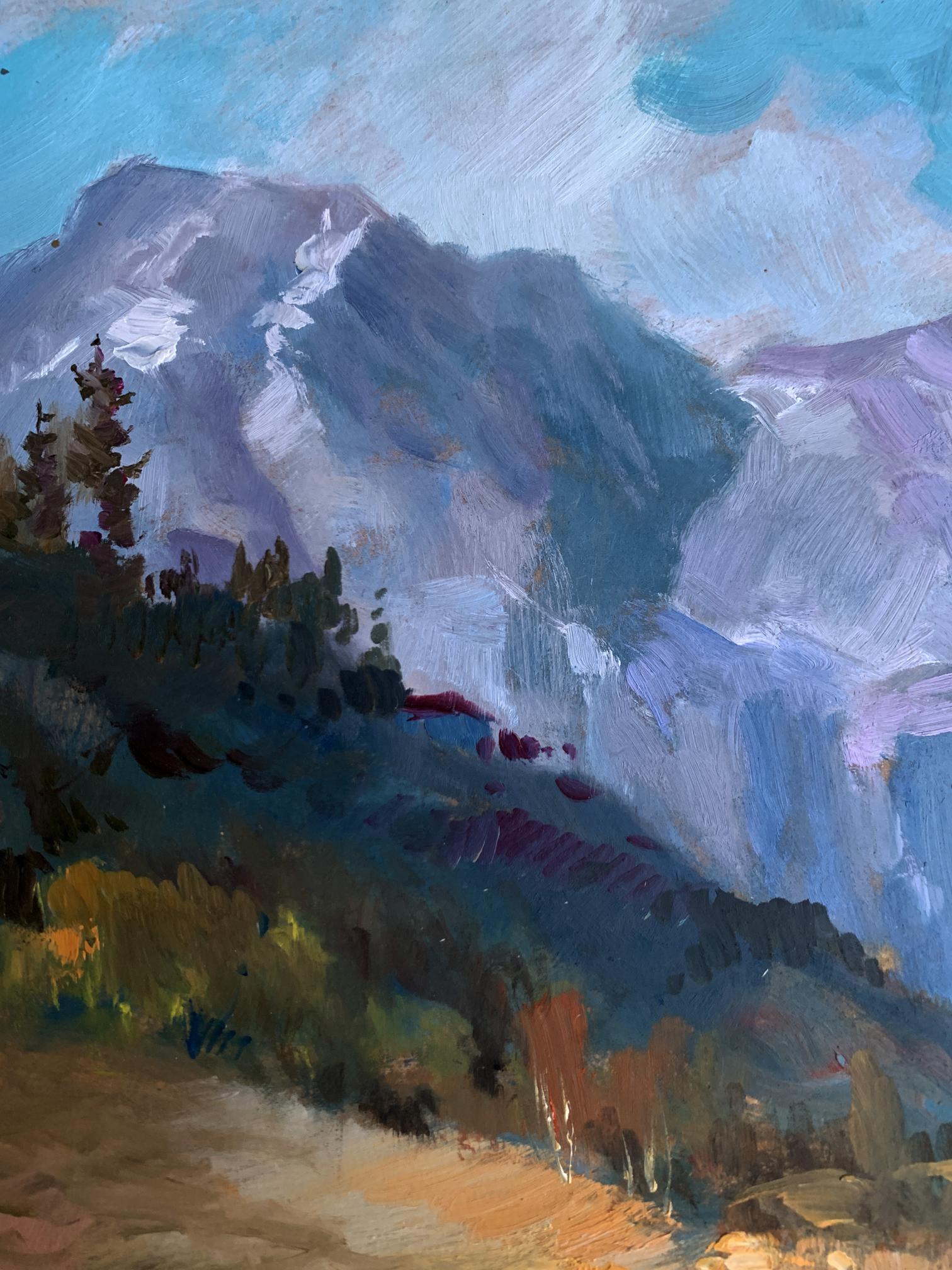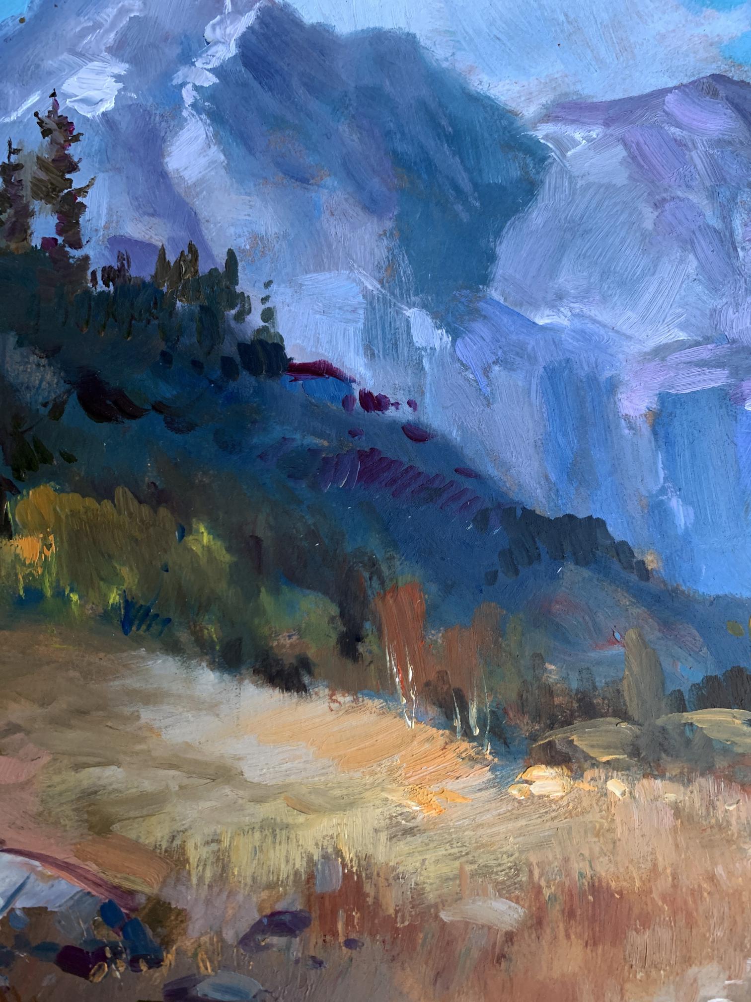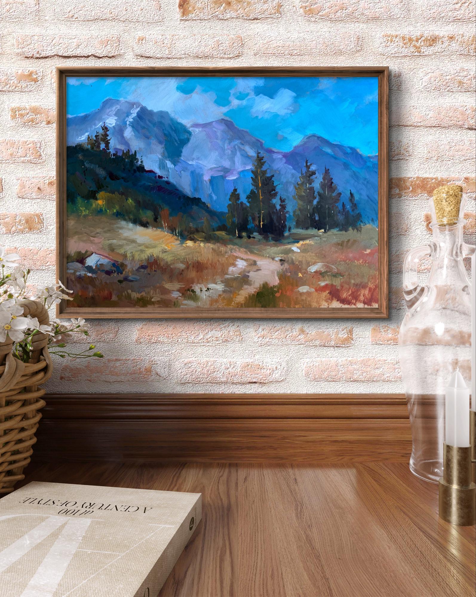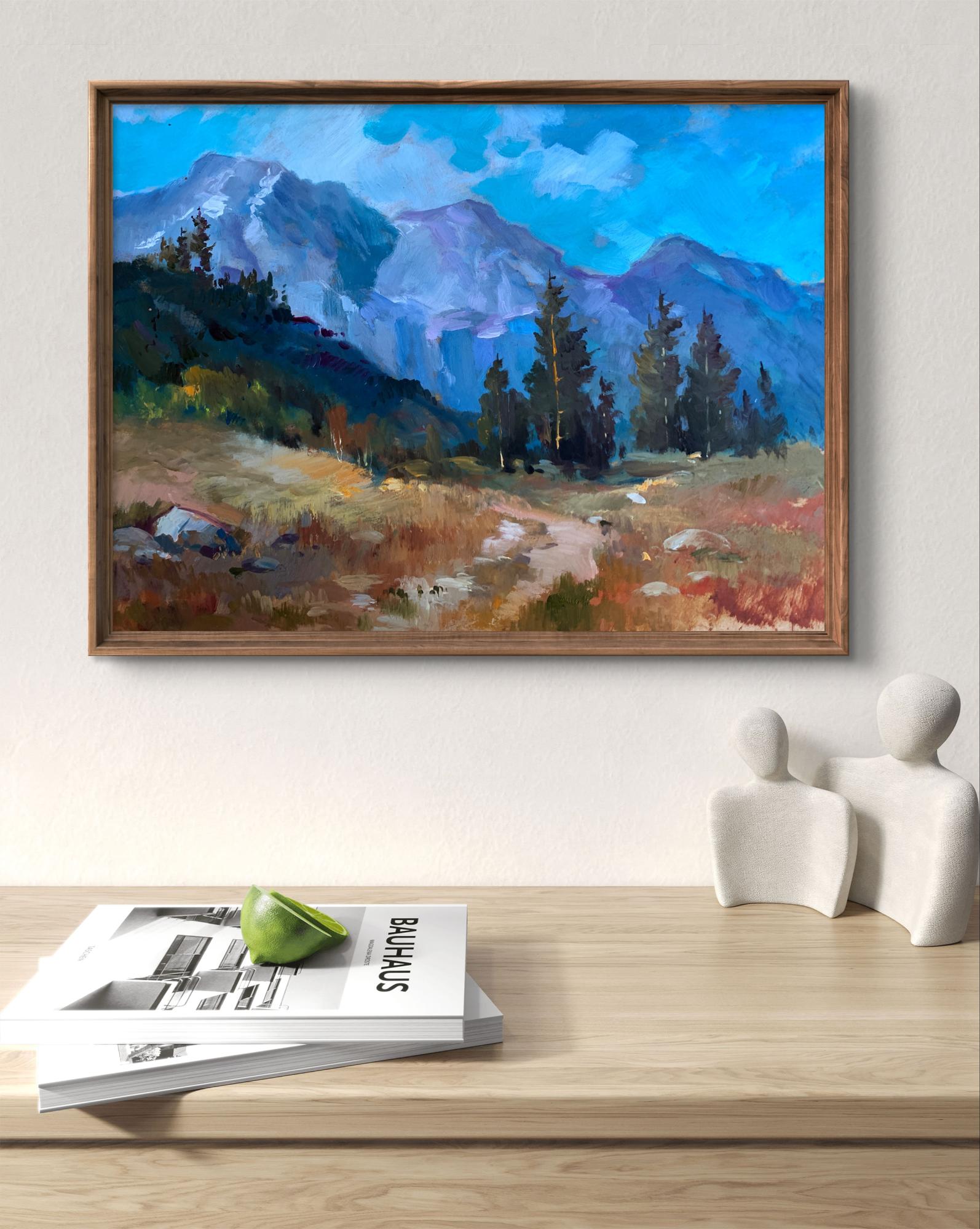 The painting "The Road Leading to the Mountains" is a captivating depiction of nature's majesty, transporting the viewer to a serene landscape where a dirt path winds gently toward towering, snow-capped peaks. Created with oil on cardboard, the work is an ode to the beauty and grandeur of the mountains, capturing the interplay of light, color, and texture that defines this tranquil environment.The composition is anchored by the dirt road in the foreground, which meanders through a grassy field and disappears into the shadowed base of the mountain range. The path, painted in earthy tones, invites the viewer to embark on a journey of exploration and discovery, leading their gaze deeper into the scene. Flanking the road are patches of dry grass, rocks, and wild vegetation, rendered in warm yellows, oranges, and browns, evoking the feeling of late summer or early autumn.The middle ground is dominated by a dense cluster of evergreens, their dark green silhouettes standing in stark contrast to the bright, snow-covered mountains beyond. The trees, painted with loose yet deliberate brushstrokes, create a natural barrier between the human perspective of the path and the distant, untamed peaks.In the background, the majestic mountains rise dramatically into a vibrant blue sky, their rugged surfaces softened by layers of purple and white. The artist uses cooler tones to convey the crisp, clear air of the high altitudes. The peaks, some dusted with snow, reflect the light of the sun, creating a dynamic interplay between shadow and illumination. The sky above is a brilliant expanse of azure, dotted with soft clouds that add depth and movement to the scene.Through "The Road Leading to the Mountains," the artist conveys a sense of freedom, adventure, and the sublime power of nature. The painting celebrates the serenity of untouched landscapes, encouraging the viewer to reflect on the journey—both literal and metaphorical—that leads us to places of beauty and wonder. The winding road becomes a symbol of life’s path, filled with twists and turns, yet always offering the promise of something extraordinary ahead.This artwork resonates with those who find peace and inspiration in nature’s vastness, offering a moment of escape into a world where the mountains stand as eternal witnesses to the passage of time. The artist’s careful use of light, color, and composition creates a scene that is both calming and invigorating, reminding the viewer of the transformative power of nature.