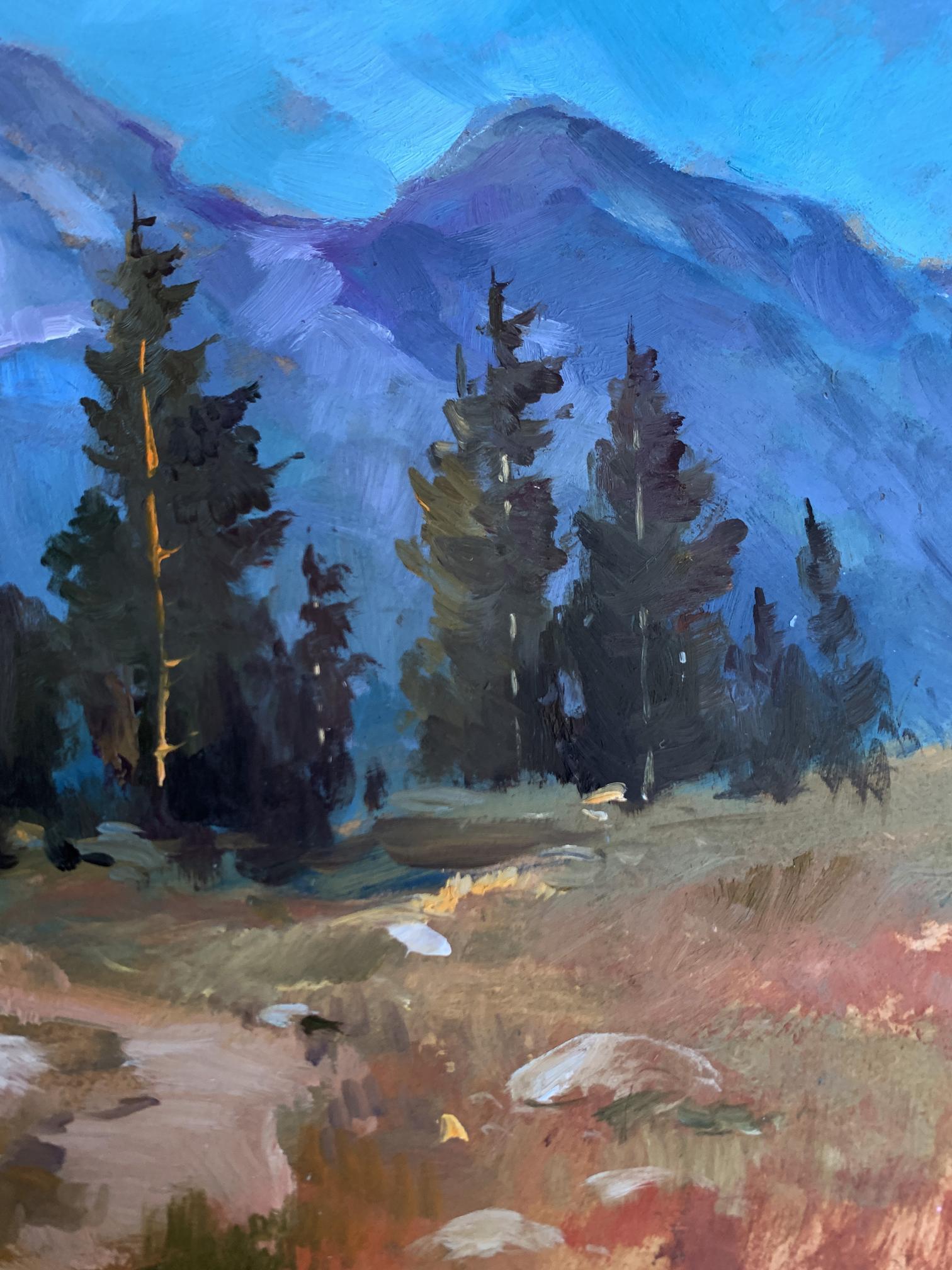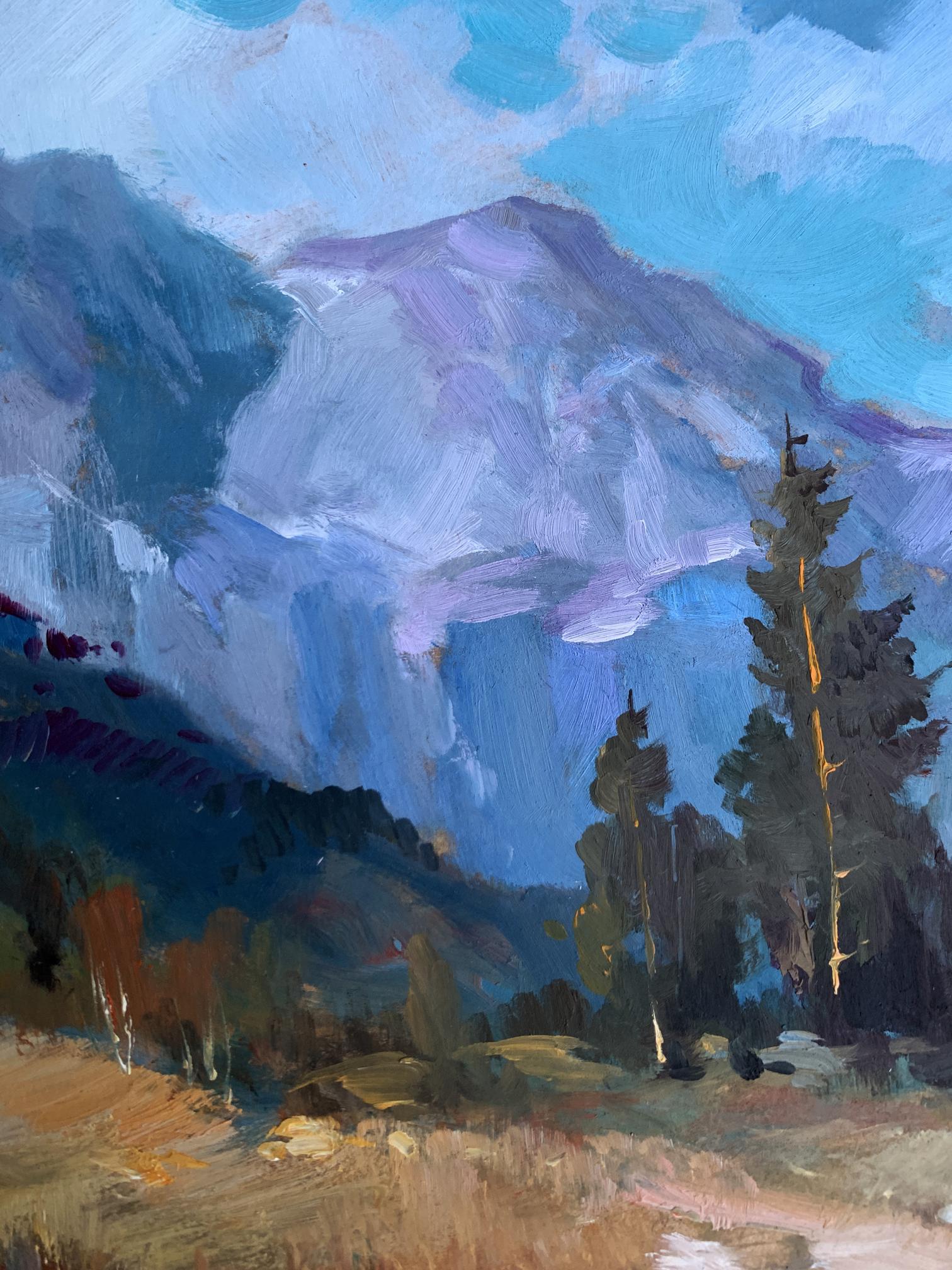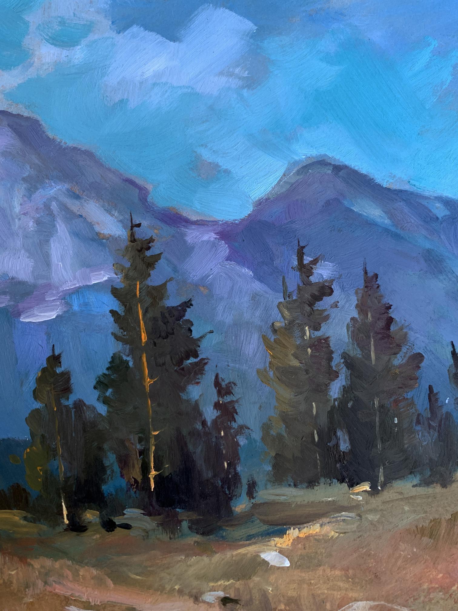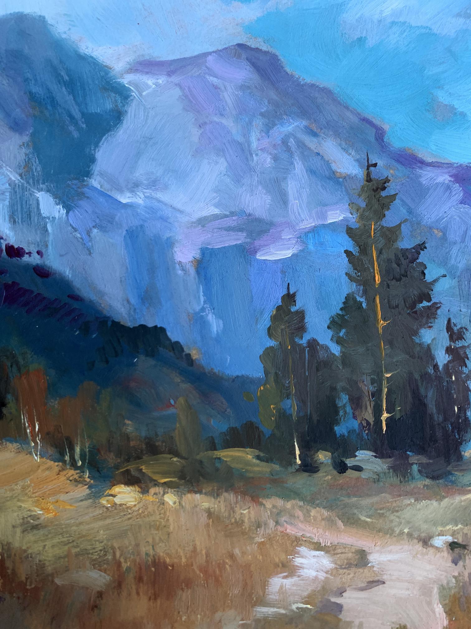 The painting "The Road Leading to the Mountains" is a captivating depiction of nature's majesty, transporting the viewer to a serene landscape where a dirt path winds gently toward towering, snow-capped peaks. Created with oil on cardboard, the work is an ode to the beauty and grandeur of the mountains, capturing the interplay of light, color, and texture that defines this tranquil environment.The composition is anchored by the dirt road in the foreground, which meanders through a grassy field and disappears into the shadowed base of the mountain range. The path, painted in earthy tones, invites the viewer to embark on a journey of exploration and discovery, leading their gaze deeper into the scene. Flanking the road are patches of dry grass, rocks, and wild vegetation, rendered in warm yellows, oranges, and browns, evoking the feeling of late summer or early autumn.The middle ground is dominated by a dense cluster of evergreens, their dark green silhouettes standing in stark contrast to the bright, snow-covered mountains beyond. The trees, painted with loose yet deliberate brushstrokes, create a natural barrier between the human perspective of the path and the distant, untamed peaks.In the background, the majestic mountains rise dramatically into a vibrant blue sky, their rugged surfaces softened by layers of purple and white. The artist uses cooler tones to convey the crisp, clear air of the high altitudes. The peaks, some dusted with snow, reflect the light of the sun, creating a dynamic interplay between shadow and illumination. The sky above is a brilliant expanse of azure, dotted with soft clouds that add depth and movement to the scene.Through "The Road Leading to the Mountains," the artist conveys a sense of freedom, adventure, and the sublime power of nature. The painting celebrates the serenity of untouched landscapes, encouraging the viewer to reflect on the journey—both literal and metaphorical—that leads us to places of beauty and wonder. The winding road becomes a symbol of life’s path, filled with twists and turns, yet always offering the promise of something extraordinary ahead.This artwork resonates with those who find peace and inspiration in nature’s vastness, offering a moment of escape into a world where the mountains stand as eternal witnesses to the passage of time. The artist’s careful use of light, color, and composition creates a scene that is both calming and invigorating, reminding the viewer of the transformative power of nature.