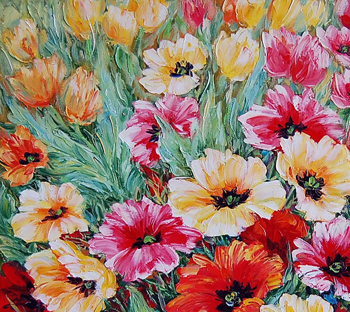 In “The Temptation of Lovers,” Ukrainian artist Olga Artim captures the vibrant energy and passion of love through a field of blossoming flowers. The canvas bursts with a lively palette of reds, yellows, and pinks, symbolizing the allure and beauty of romance. The intense, contrasting colors of the petals create an evocative and dynamic composition that draws viewers into the powerful emotions of love. This piece would be a striking addition to any Collection of Nature Landscapes or Collection of Painting with Flowers.