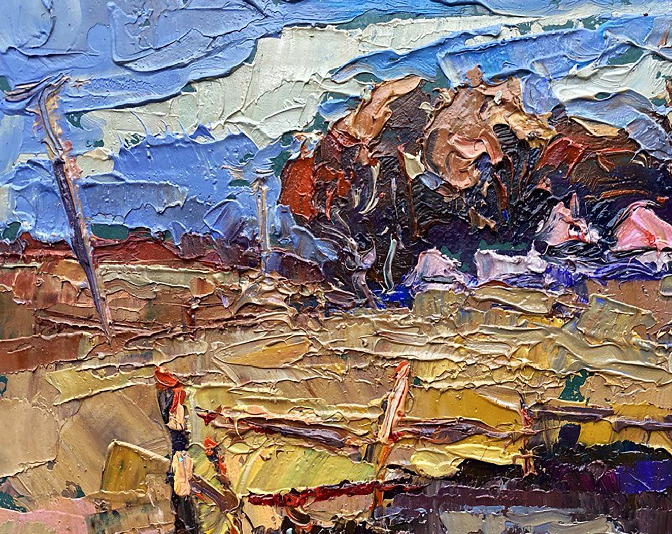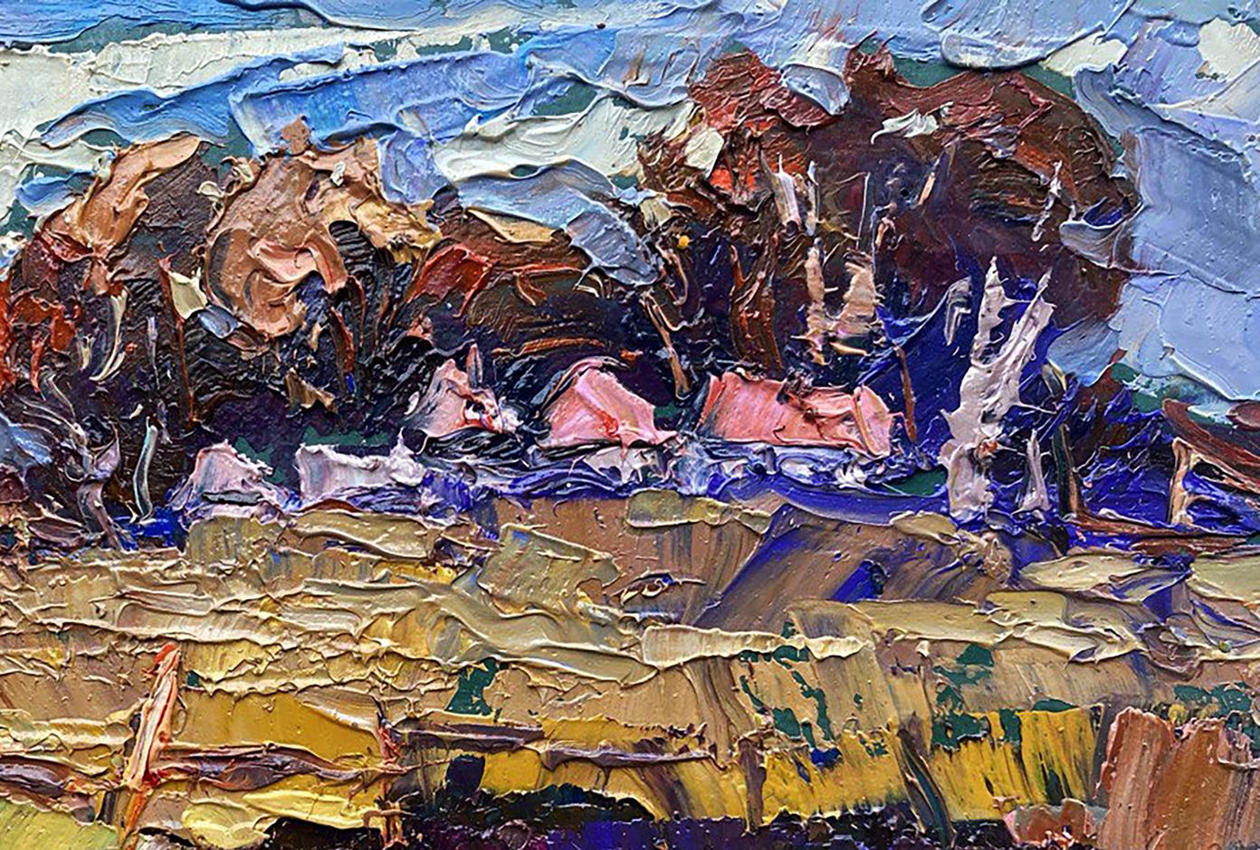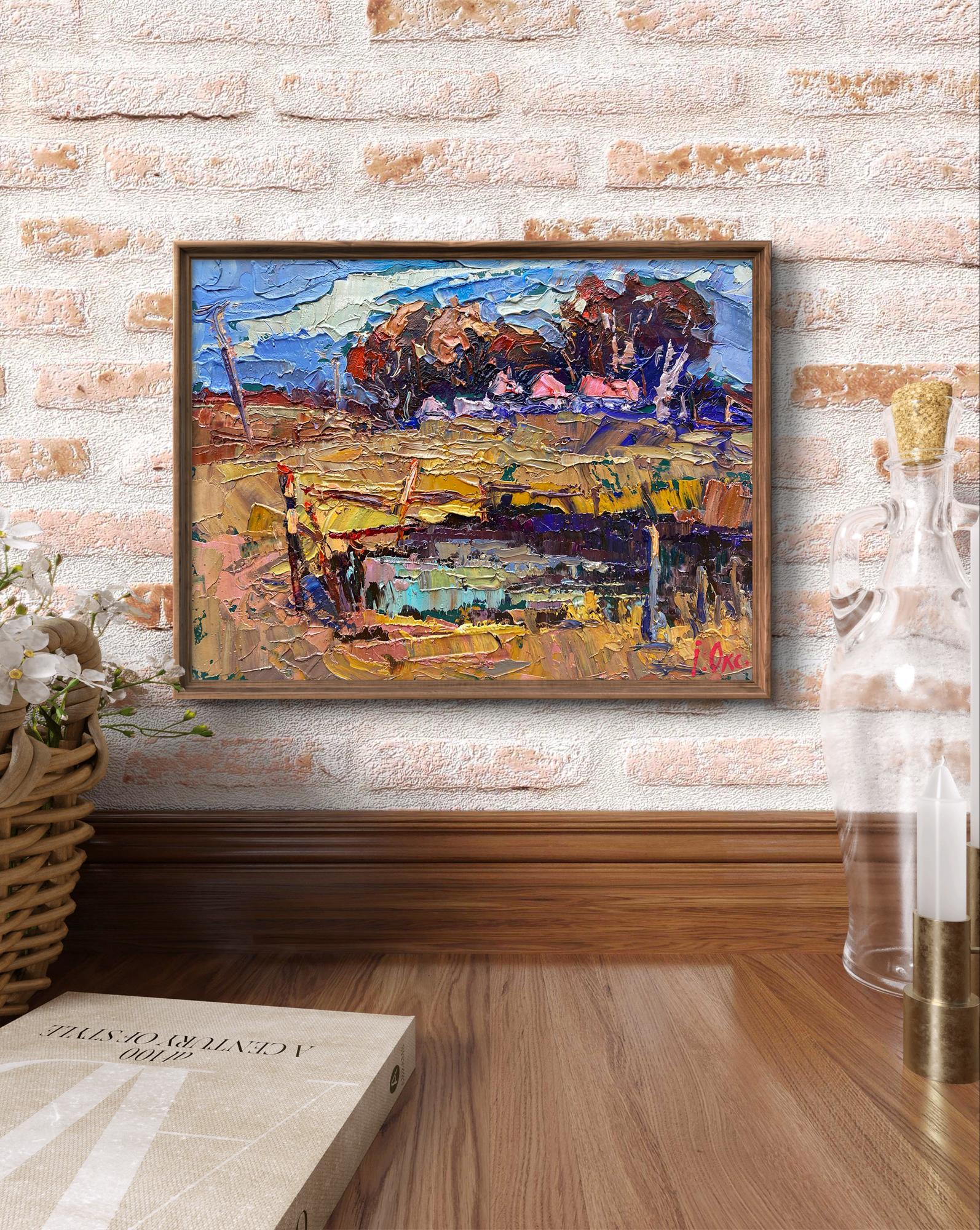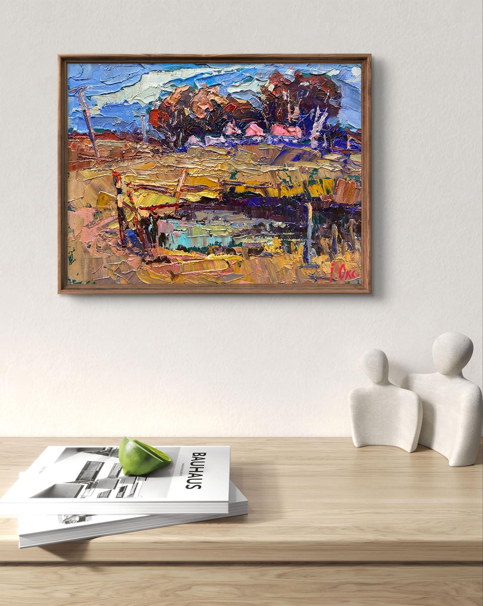The painting titled "There is a Pond in the Field" captures a serene rural landscape, with a small pond nestled in an open field surrounded by vibrant autumn colors and rustic village houses. The artist uses thick, textured brushstrokes and a rich color palette to evoke the peaceful beauty of nature and the charm of the countryside. The combination of earthy tones and vibrant blues creates a harmonious balance, drawing the viewer into the scene. The foreground showcases a small pond, reflecting the surrounding landscape with shades of dark blue, green, and hints of turquoise. The water's surface is textured with thick strokes of paint, giving the impression of rippling reflections. The edges of the pond are framed by uneven, grassy banks, painted in golden yellows, browns, and soft greens, emphasizing the natural, untouched beauty of the field. The middle ground is dominated by a sprawling golden field, painted in shades of warm yellow, ochre, and earthy brown. The field appears freshly harvested, with visible furrows and paths that lead the viewer’s eye toward the horizon. The textured brushstrokes suggest the rough, uneven surface of the field, capturing the raw beauty of nature. In the distance, a rustic wooden fence runs across the field, partially broken and leaning, adding a touch of authenticity and rustic charm to the scene. The fence also serves to guide the viewer’s gaze toward the village in the background. In the background, a small cluster of village houses is nestled among tall trees. The houses are painted in soft pink and beige tones, contrasting with the dark brown and deep red hues of the trees. The use of cool lavender and blue tones in the distant trees and sky creates a sense of depth, making the village feel cozy and welcoming amidst the vast, open field. The sky is painted in soft blues and whites, with wispy clouds adding a sense of lightness and openness to the composition. The cool tones of the sky balance the warm, earthy colors of the field, creating a peaceful and harmonious atmosphere. "There is a Pond in the Field" is a beautifully textured and richly colored depiction of rural life and natural beauty. Through its use of bold colors and thick, expressive brushstrokes, the painting captures a moment of peace and reflection in the countryside, celebrating the timeless charm of village life and the harmony between people and nature. The artwork invites viewers to immerse themselves in the tranquility of the rural landscape and appreciate the simple, yet profound beauty of everyday moments in nature.