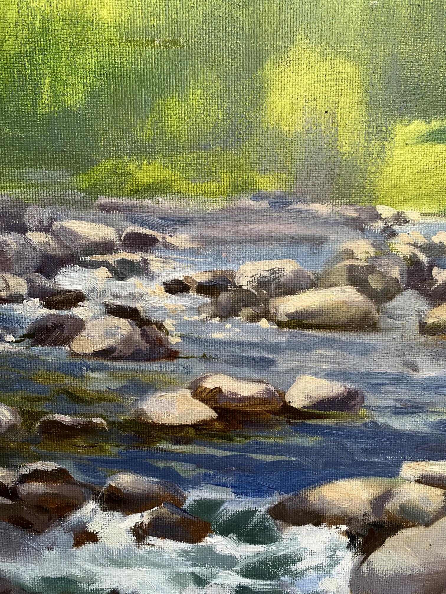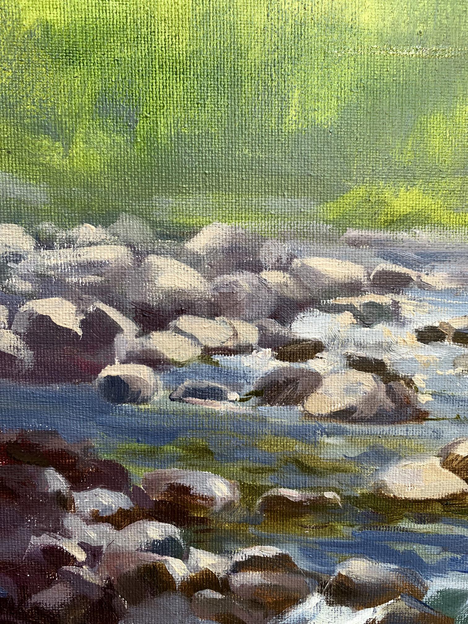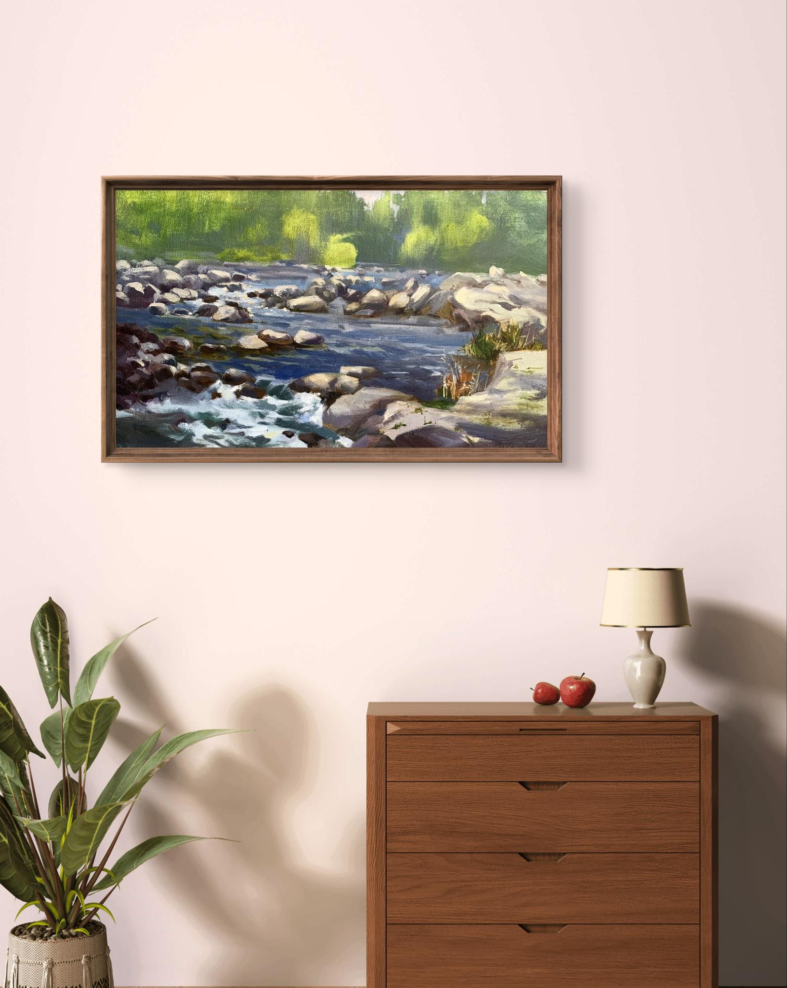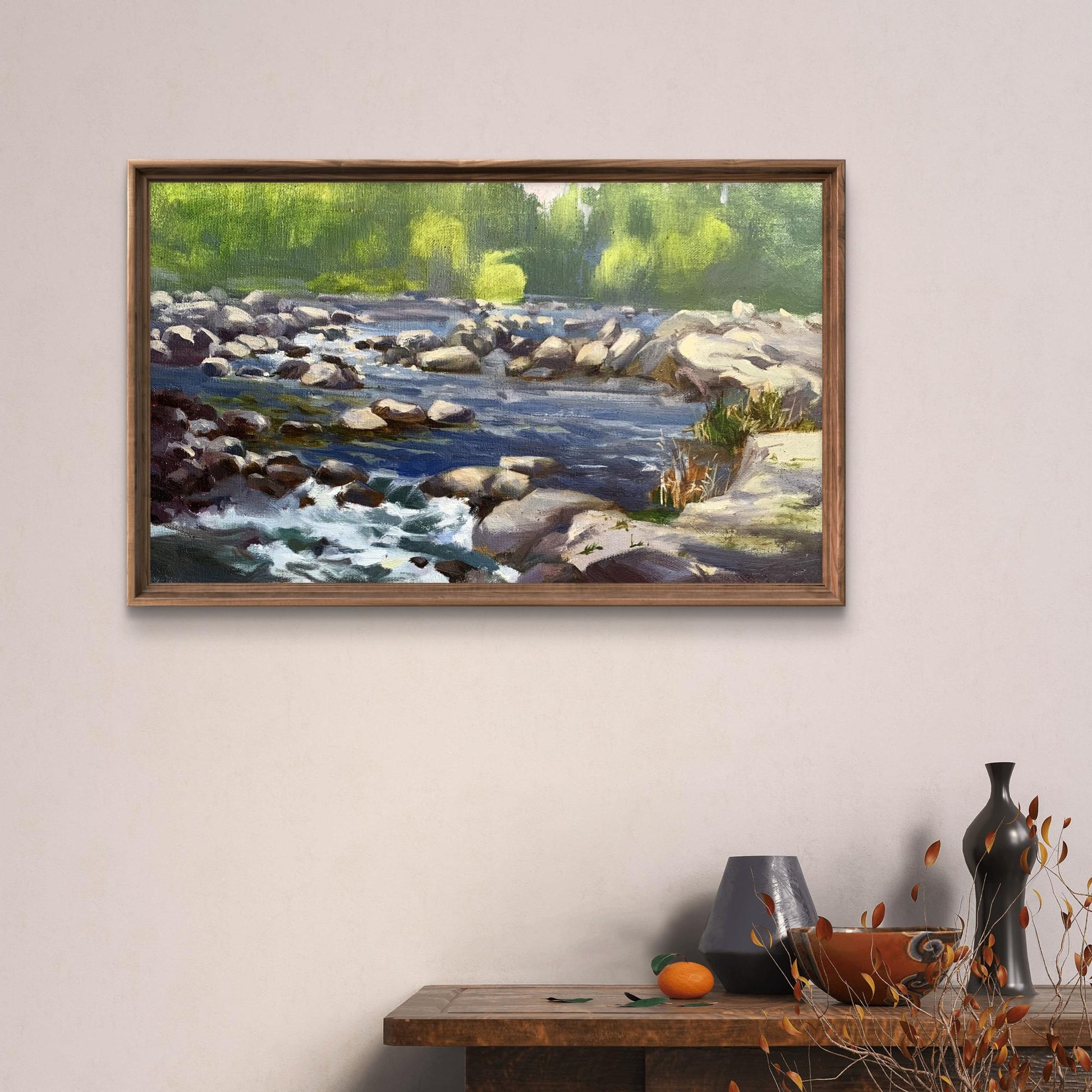 "Threshold to a Dream" is an enchanting oil painting that captures a serene and picturesque riverside scene. The artist has skillfully used color, light, and texture to bring this tranquil landscape to life, inviting viewers to step into a peaceful, dreamlike environment. The color palette is composed of a harmonious blend of natural greens, blues, and earthy tones. The lush greenery of the trees and bushes contrasts beautifully with the cool, flowing waters of the river. The artist’s use of light and shadow adds depth and dimension, creating a realistic and immersive scene. The painting employs a combination of smooth and textured brushstrokes to depict the different elements of the landscape. The water is rendered with fluid, sweeping strokes that convey its movement, while the rocks and foliage are depicted with more defined, textured strokes, enhancing their solidity and presence. The composition is thoughtfully arranged to lead the viewer’s eye through the scene, from the foreground to the background. The river acts as a natural pathway, guiding the viewer’s gaze along its gentle curves and around the boulders. The foreground features a cluster of smooth, rounded rocks partially submerged in the clear, flowing water. The artist captures the play of light on the water’s surface, creating a shimmering effect that adds to the scene’s realism. In the midground, the river flows steadily, bordered by more rocks and patches of greenery. The artist uses variations in color and light to depict the depth and flow of the water, making it appear dynamic and lifelike. The background is filled with a dense forest of trees, their leaves rendered in varying shades of green to suggest depth and distance. The light filtering through the trees adds a soft, ethereal quality to the scene, enhancing its dreamlike atmosphere. The rocks are a prominent feature, their solid forms contrasting with the fluidity of the water. The artist’s detailed rendering of their shapes and textures adds a tactile quality to the painting. The water is depicted with a sense of movement and clarity. The artist captures the way it flows over and around the rocks, using light and shadow to create a realistic and dynamic portrayal. The greenery along the riverbank and in the background is lush and vibrant. The artist uses varying shades of green and different brush techniques to depict the density and diversity of the vegetation. The mood of "Threshold to a Dream" is one of peace, tranquility, and natural beauty. The painting invites viewers to pause and appreciate the serene landscape, offering a moment of calm and reflection. "Threshold to a Dream" can be interpreted as a metaphor for a journey or a transition. The river represents the flow of life, leading the viewer towards new experiences and dreams. The natural beauty of the scene symbolizes the harmony and serenity that can be found in nature and in moments of contemplation. The artist’s skillful use of color, composition, and texture effectively conveys the theme of tranquility and natural beauty, making "Threshold to a Dream" a captivating and serene piece. The painting not only showcases the visual appeal of the riverside landscape but also captures the emotional essence of peace and reflection that such a scene inspires.