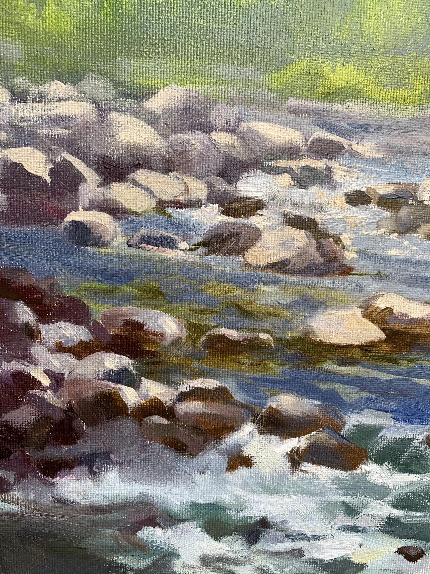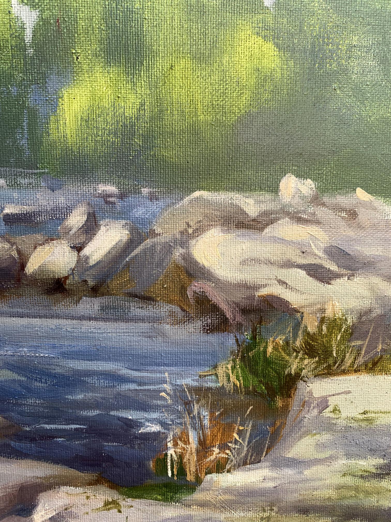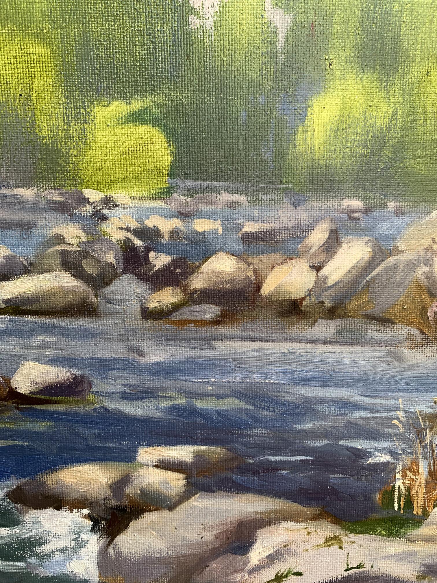 "Threshold to a Dream" is an enchanting oil painting that captures a serene and picturesque riverside scene. The artist has skillfully used color, light, and texture to bring this tranquil landscape to life, inviting viewers to step into a peaceful, dreamlike environment. The color palette is composed of a harmonious blend of natural greens, blues, and earthy tones. The lush greenery of the trees and bushes contrasts beautifully with the cool, flowing waters of the river. The artist’s use of light and shadow adds depth and dimension, creating a realistic and immersive scene. The painting employs a combination of smooth and textured brushstrokes to depict the different elements of the landscape. The water is rendered with fluid, sweeping strokes that convey its movement, while the rocks and foliage are depicted with more defined, textured strokes, enhancing their solidity and presence. The composition is thoughtfully arranged to lead the viewer’s eye through the scene, from the foreground to the background. The river acts as a natural pathway, guiding the viewer’s gaze along its gentle curves and around the boulders. The foreground features a cluster of smooth, rounded rocks partially submerged in the clear, flowing water. The artist captures the play of light on the water’s surface, creating a shimmering effect that adds to the scene’s realism. In the midground, the river flows steadily, bordered by more rocks and patches of greenery. The artist uses variations in color and light to depict the depth and flow of the water, making it appear dynamic and lifelike. The background is filled with a dense forest of trees, their leaves rendered in varying shades of green to suggest depth and distance. The light filtering through the trees adds a soft, ethereal quality to the scene, enhancing its dreamlike atmosphere. The rocks are a prominent feature, their solid forms contrasting with the fluidity of the water. The artist’s detailed rendering of their shapes and textures adds a tactile quality to the painting. The water is depicted with a sense of movement and clarity. The artist captures the way it flows over and around the rocks, using light and shadow to create a realistic and dynamic portrayal. The greenery along the riverbank and in the background is lush and vibrant. The artist uses varying shades of green and different brush techniques to depict the density and diversity of the vegetation. The mood of "Threshold to a Dream" is one of peace, tranquility, and natural beauty. The painting invites viewers to pause and appreciate the serene landscape, offering a moment of calm and reflection. "Threshold to a Dream" can be interpreted as a metaphor for a journey or a transition. The river represents the flow of life, leading the viewer towards new experiences and dreams. The natural beauty of the scene symbolizes the harmony and serenity that can be found in nature and in moments of contemplation. The artist’s skillful use of color, composition, and texture effectively conveys the theme of tranquility and natural beauty, making "Threshold to a Dream" a captivating and serene piece. The painting not only showcases the visual appeal of the riverside landscape but also captures the emotional essence of peace and reflection that such a scene inspires.