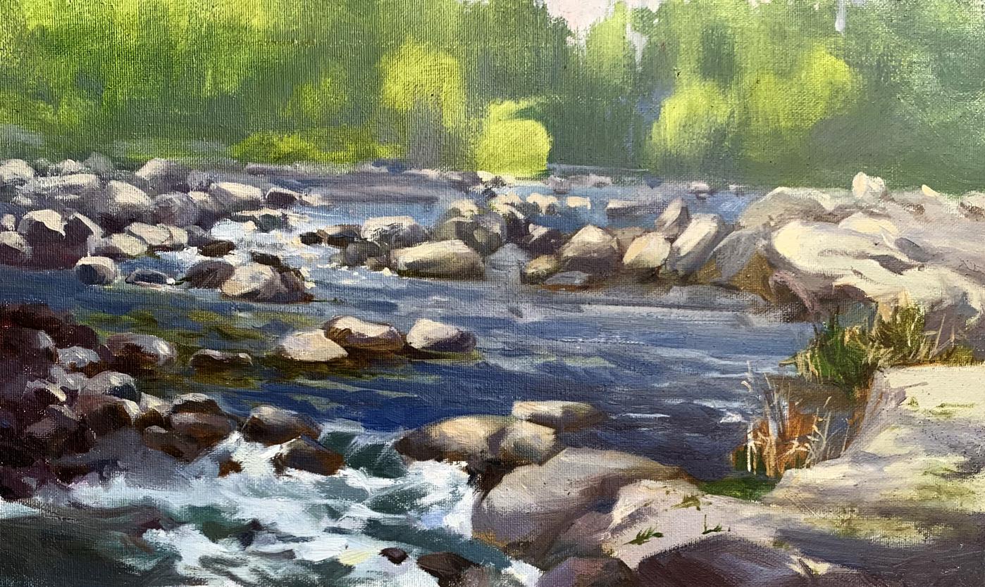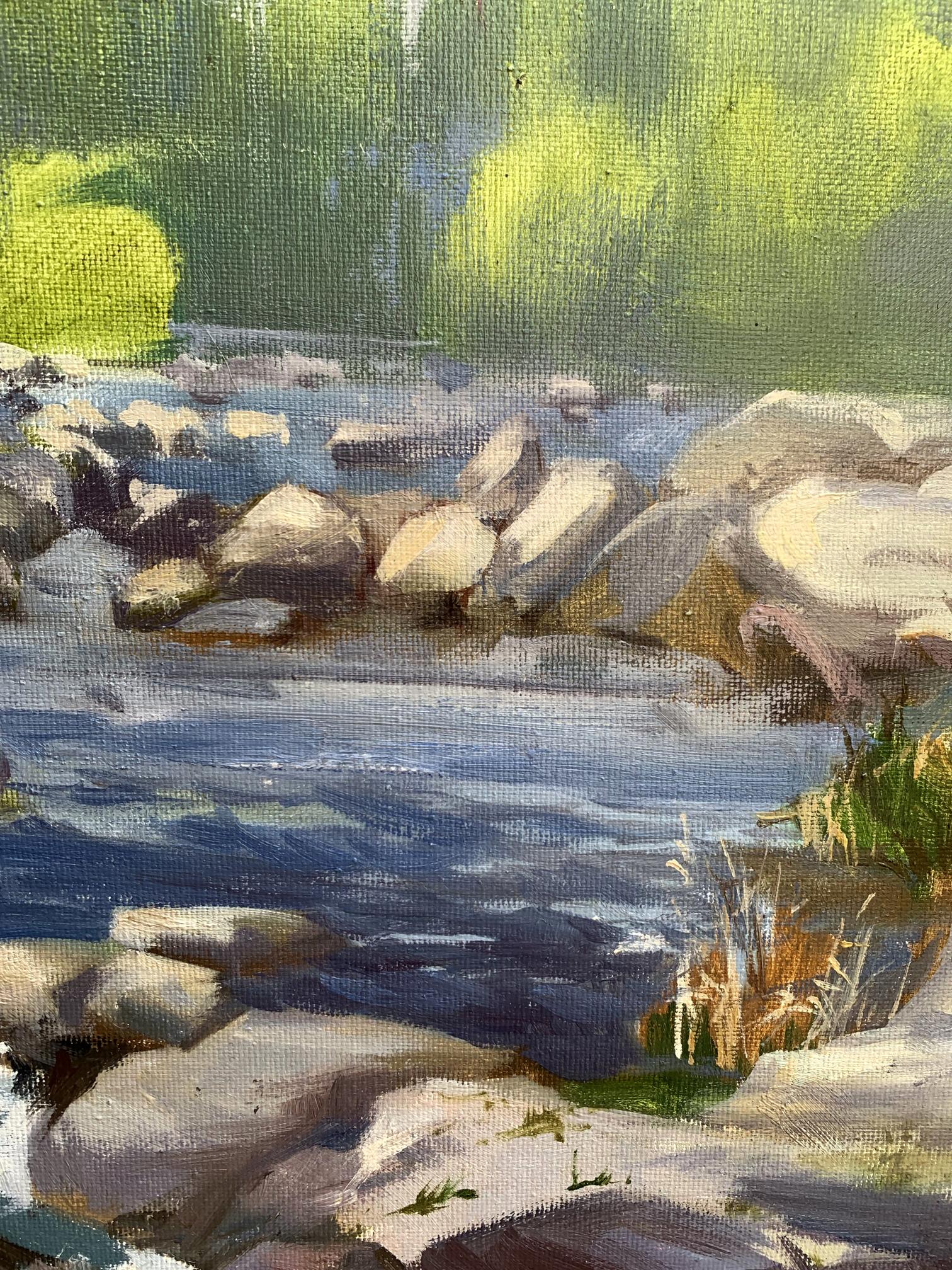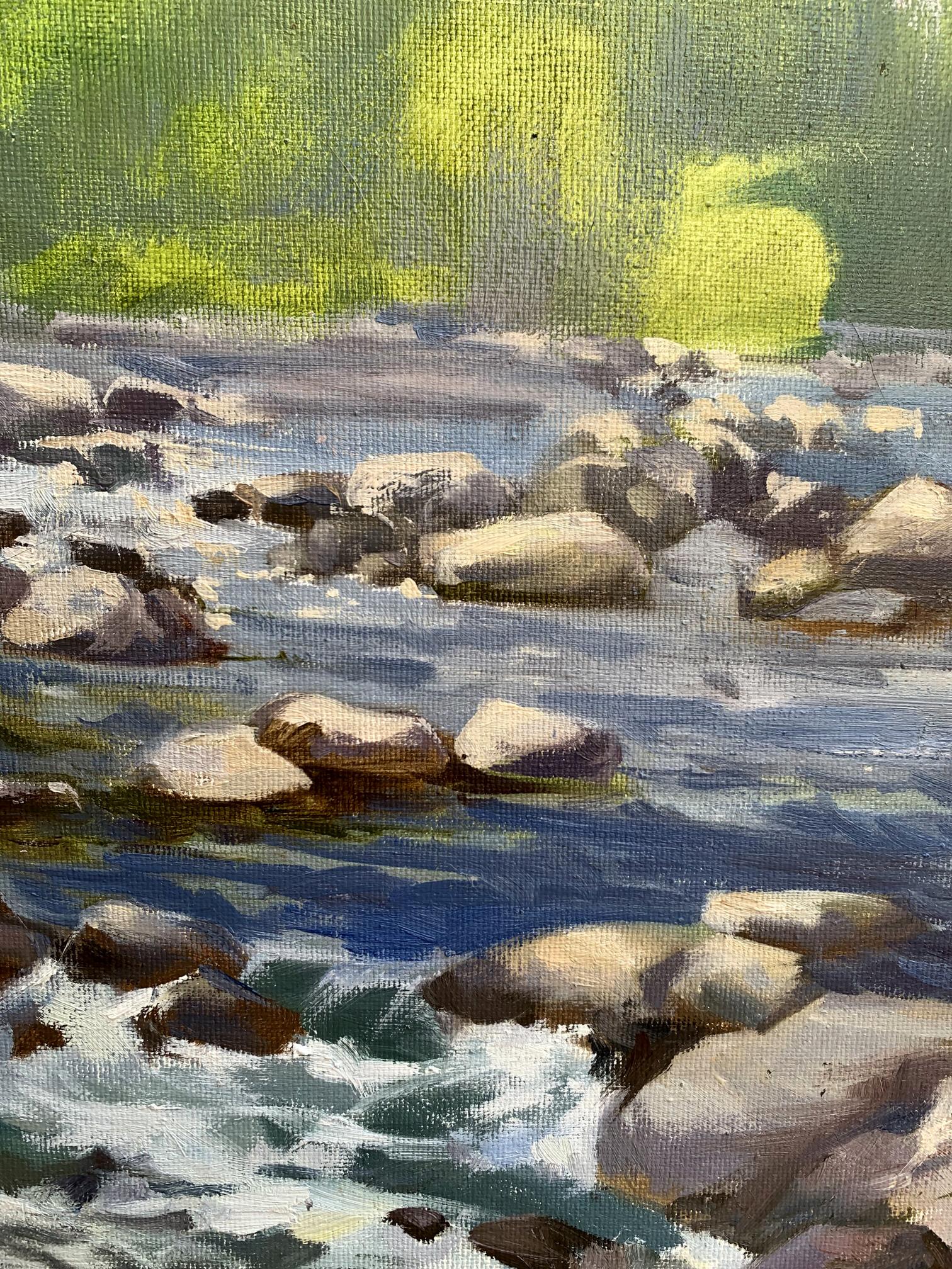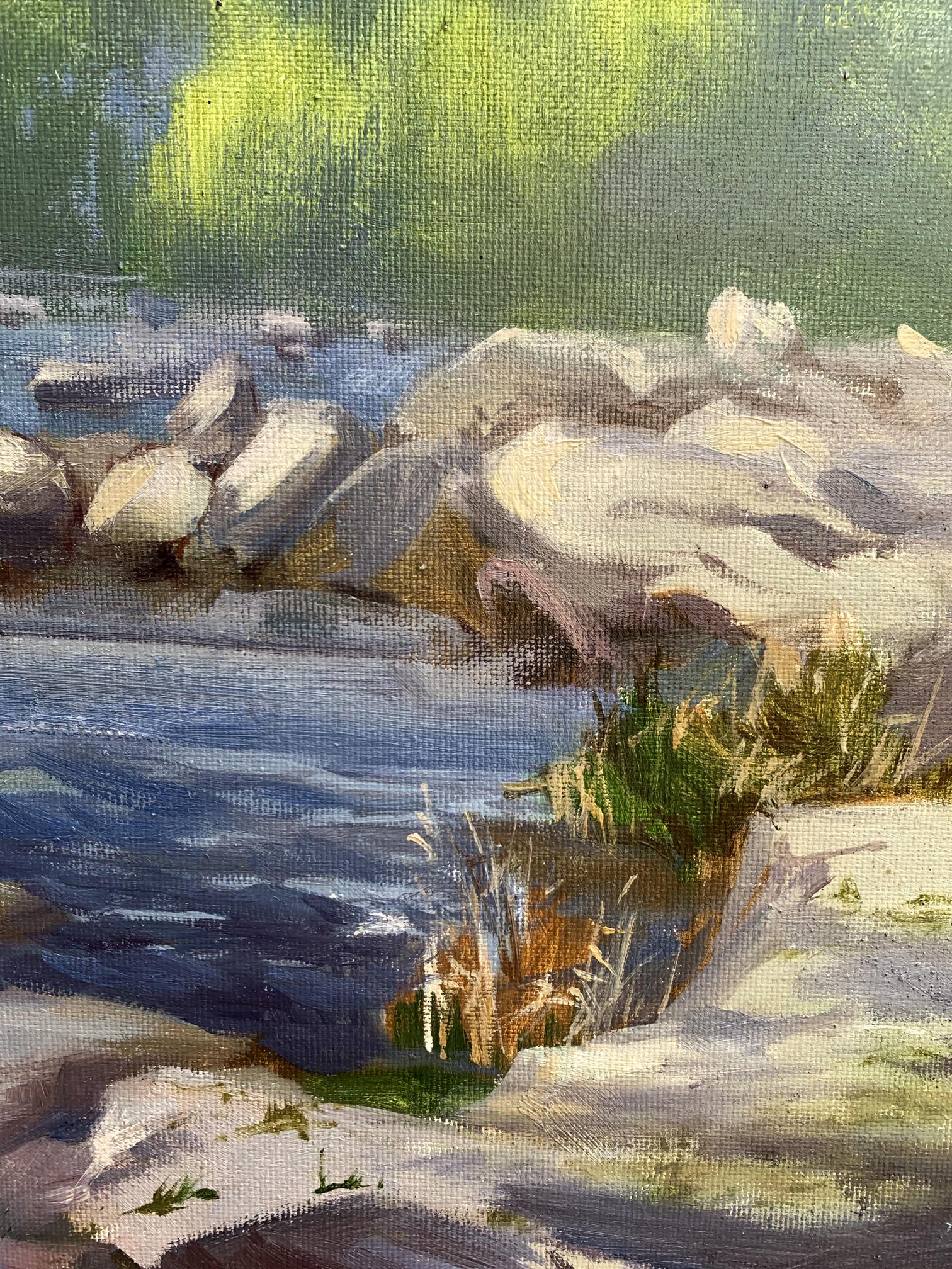 "Threshold to a Dream" is an enchanting oil painting that captures a serene and picturesque riverside scene. The artist has skillfully used color, light, and texture to bring this tranquil landscape to life, inviting viewers to step into a peaceful, dreamlike environment. The color palette is composed of a harmonious blend of natural greens, blues, and earthy tones. The lush greenery of the trees and bushes contrasts beautifully with the cool, flowing waters of the river. The artist’s use of light and shadow adds depth and dimension, creating a realistic and immersive scene. The painting employs a combination of smooth and textured brushstrokes to depict the different elements of the landscape. The water is rendered with fluid, sweeping strokes that convey its movement, while the rocks and foliage are depicted with more defined, textured strokes, enhancing their solidity and presence. The composition is thoughtfully arranged to lead the viewer’s eye through the scene, from the foreground to the background. The river acts as a natural pathway, guiding the viewer’s gaze along its gentle curves and around the boulders. The foreground features a cluster of smooth, rounded rocks partially submerged in the clear, flowing water. The artist captures the play of light on the water’s surface, creating a shimmering effect that adds to the scene’s realism. In the midground, the river flows steadily, bordered by more rocks and patches of greenery. The artist uses variations in color and light to depict the depth and flow of the water, making it appear dynamic and lifelike. The background is filled with a dense forest of trees, their leaves rendered in varying shades of green to suggest depth and distance. The light filtering through the trees adds a soft, ethereal quality to the scene, enhancing its dreamlike atmosphere. The rocks are a prominent feature, their solid forms contrasting with the fluidity of the water. The artist’s detailed rendering of their shapes and textures adds a tactile quality to the painting. The water is depicted with a sense of movement and clarity. The artist captures the way it flows over and around the rocks, using light and shadow to create a realistic and dynamic portrayal. The greenery along the riverbank and in the background is lush and vibrant. The artist uses varying shades of green and different brush techniques to depict the density and diversity of the vegetation. The mood of "Threshold to a Dream" is one of peace, tranquility, and natural beauty. The painting invites viewers to pause and appreciate the serene landscape, offering a moment of calm and reflection. "Threshold to a Dream" can be interpreted as a metaphor for a journey or a transition. The river represents the flow of life, leading the viewer towards new experiences and dreams. The natural beauty of the scene symbolizes the harmony and serenity that can be found in nature and in moments of contemplation. The artist’s skillful use of color, composition, and texture effectively conveys the theme of tranquility and natural beauty, making "Threshold to a Dream" a captivating and serene piece. The painting not only showcases the visual appeal of the riverside landscape but also captures the emotional essence of peace and reflection that such a scene inspires.