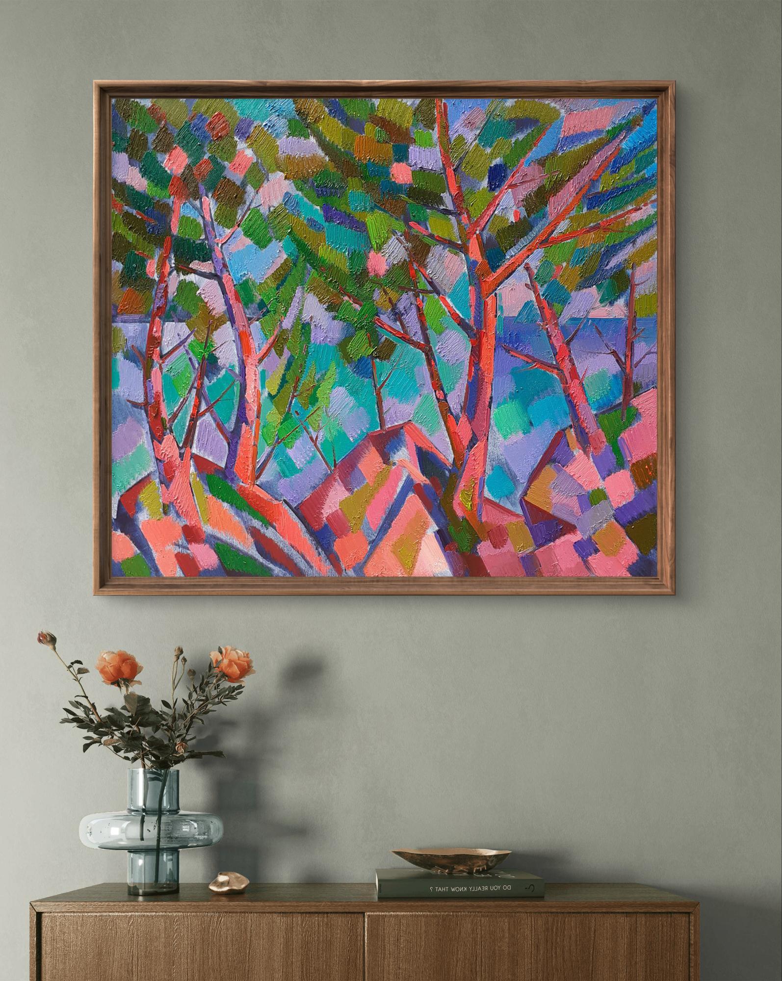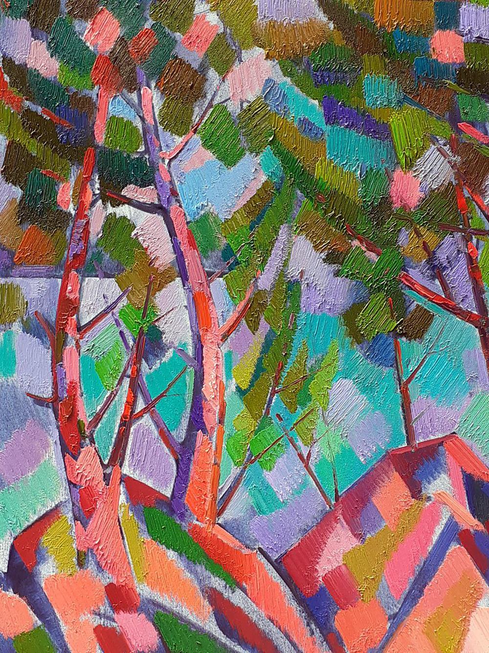 "Trees among the rocks" is a vibrant and dynamic oil painting that captures the energy and beauty of nature with an abstract and modernist approach. The composition is filled with expressive brushstrokes and a vivid color palette, creating an atmosphere of movement and vitality. In the foreground, the painting features a cluster of trees with bright red trunks and branches. These trees are depicted with bold, angular lines and geometric shapes, creating a striking contrast against the softer background. The use of red for the trunks and branches adds a sense of warmth and intensity to the scene, drawing the viewer’s eye immediately. The foliage of the trees is rendered in a mix of greens, blues, and purples, with each leaf painted in a distinctive square or rectangular brushstroke. This creates a mosaic-like effect, adding texture and depth to the painting. The leaves appear to be rustling in the wind, suggested by the dynamic placement and direction of the brushstrokes. In the background, the sea is visible through the gaps between the trees. The water is painted in shades of blue and turquoise, with patches of purple and green reflecting the colors of the sky and foliage. The sea is depicted with the same mosaic-like brushstrokes, creating a sense of continuity and harmony throughout the painting. The sky above is a blend of soft blues, pinks, and purples, painted with light, airy brushstrokes that suggest the presence of clouds. The interplay of light and color in the sky adds to the overall sense of movement and energy in the painting. The painting’s use of color is bold and expressive, with each hue contributing to the overall vibrancy of the scene. The combination of warm and cool tones, along with the dynamic brushstrokes, creates a lively and engaging composition that captures the viewer’s attention. "Trees among the rocks" explores the beauty and energy of the natural world through a modernist and abstract lens. The painting’s dynamic composition and vivid colors evoke a sense of movement and vitality, reflecting the constant change and flow of nature. The artist’s use of expressive brushstrokes and contrasting colors captures the interplay of light and shadow, creating a scene that is both lively and harmonious. The abstract representation of the trees and sea invites viewers to interpret the painting in their own way, finding beauty in the interplay of color and form. The painting emphasizes the artistic potential of natural motifs, transforming everyday scenes into vibrant and compelling works of art. This oil painting masterfully combines bold colors, dynamic brushstrokes, and geometric forms to create a lively and abstract representation of a natural landscape. "Trees among the rocks" captures the viewer’s attention with its bold visual impact and invites them to immerse themselves in the energy and beauty of nature through an artistic lens. It is a striking and thought-provoking piece that celebrates the dynamic interplay of color and form in the natural world.