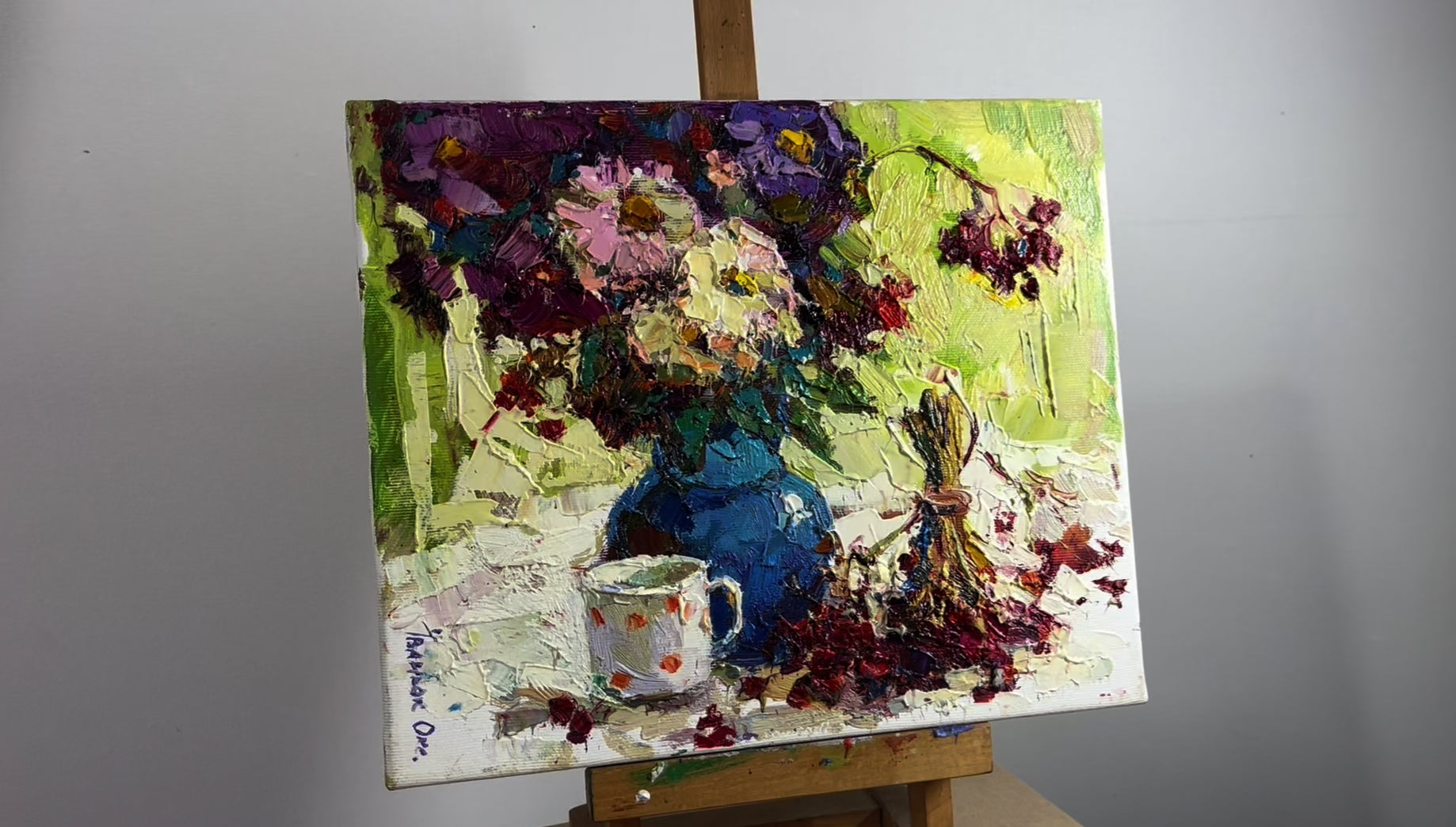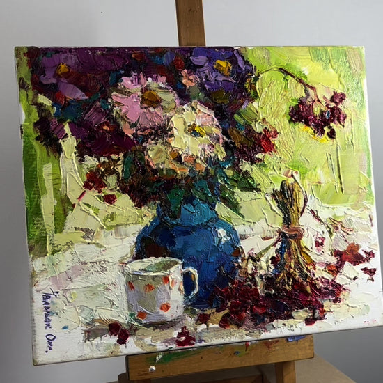 "Viburnum on the Table" is a captivating oil painting that intricately captures the essence of a harmonious still life arrangement