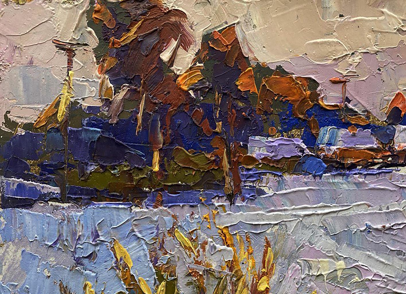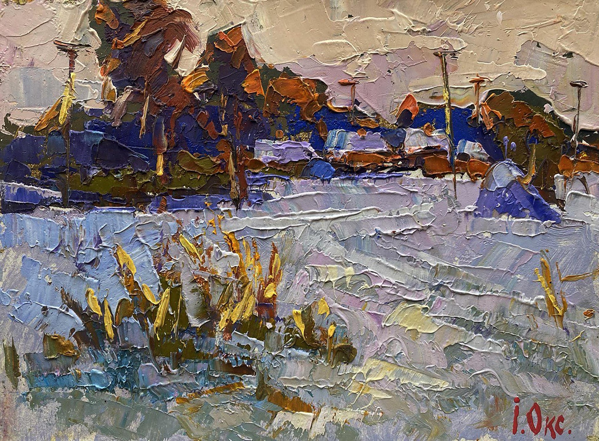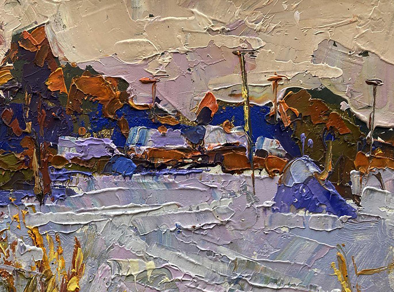 The painting titled "Village in Winter" depicts a serene rural scene blanketed in snow, capturing the quiet beauty of a village during the cold season. The artist uses a palette knife technique to apply thick layers of oil paint, creating a textured, almost three-dimensional surface that enhances the depth and atmosphere of the composition. The color palette, dominated by cool tones of blue, violet, and white, contrasts beautifully with the warm accents of brown, orange, and yellow, bringing life and warmth to the cold winter landscape. The foreground shows a snow-covered field, painted in soft shades of white, lavender, and pale blue. The textured brushstrokes suggest the uneven surface of the snow, with subtle shadows and reflections adding depth and realism. Scattered across the field are yellow and orange stalks of dried grass, poking through the snow, symbolizing the resilience of nature even in harsh conditions. These bright accents bring warmth and energy to the otherwise cool color scheme. The thick, layered application of paint in the foreground conveys the tactile sensation of fresh snow, emphasizing the quiet, untouched beauty of a winter landscape. The middle ground features a row of traditional village houses, their rooftops covered in snow. The houses are painted in muted tones of blue, brown, and white, blending harmoniously with the surrounding landscape. The snow-covered roofs add a sense of coziness and shelter, evoking the warmth of life inside, despite the cold weather outside. Behind the houses, a line of trees painted in deep greens and browns creates a natural boundary between the village and the horizon. The trees, with their bare branches, stand as silent witnesses to the changing seasons, adding a touch of melancholy and tranquility to the scene. Several wooden poles are visible throughout the composition, likely supporting electrical lines, hinting at the presence of human life and modernity in this otherwise timeless rural setting. The background is filled with a soft, cloudy sky, painted in shades of beige, pale pink, and light gray. The sky appears hazy, suggesting a calm winter day, with the sun hidden behind the clouds. The muted colors in the sky create a sense of stillness and quiet, reinforcing the peaceful atmosphere of the village. The combination of warm and cool tones in the background creates a sense of balance, making the composition feel harmonious and complete. The blurred edges of the horizon suggest a gentle transition between the village and the sky, emphasizing the vastness of the winter landscape. "Village in Winter" is a captivating portrayal of a snowy rural landscape, capturing both the beauty and tranquility of winter. The thick textures and harmonious color palette bring depth and life to the scene, while the quiet atmosphere evokes feelings of peace and reflection. The painting invites the viewer to experience the timeless charm of village life during winter, appreciating the simple, enduring beauty of nature in all its forms.