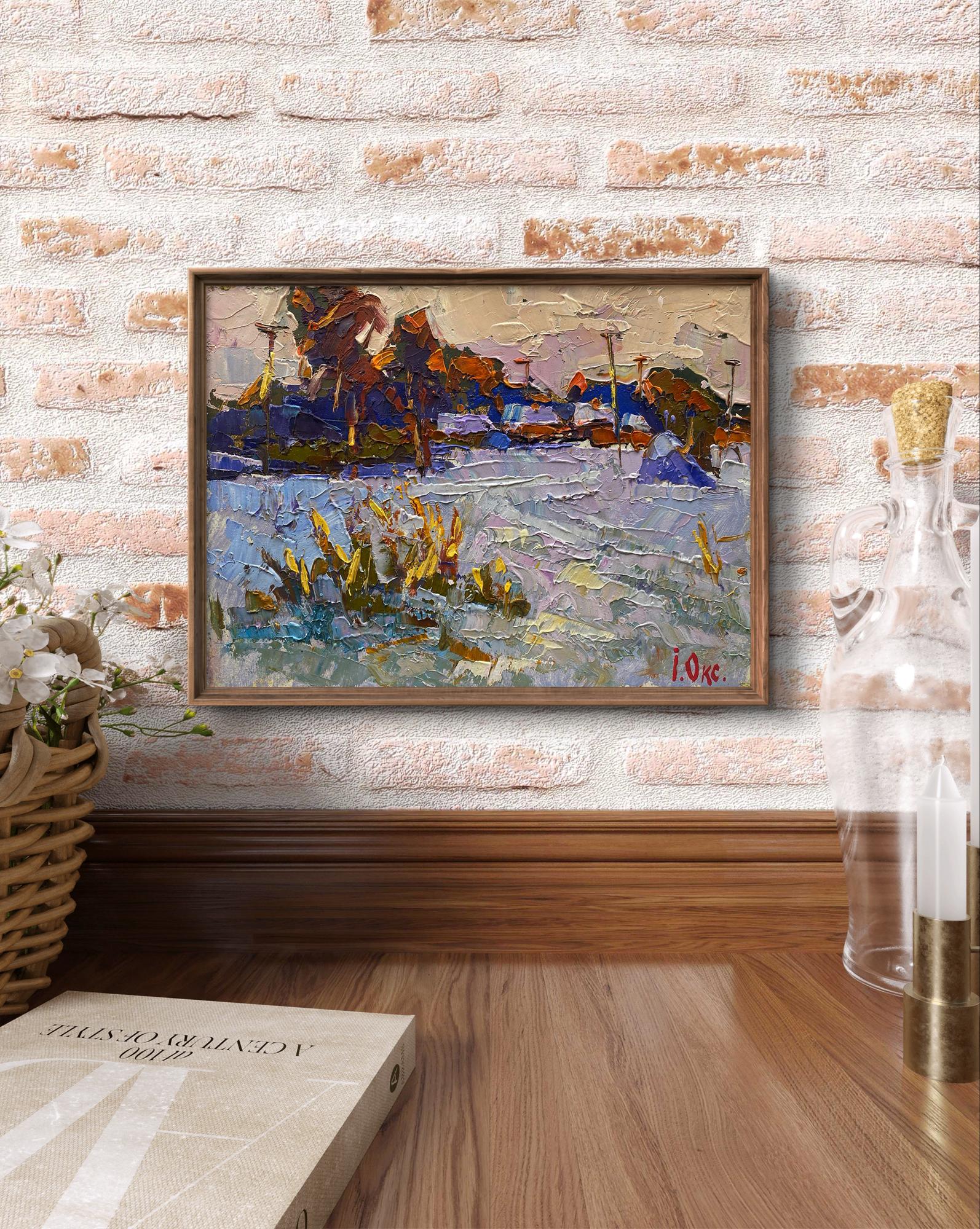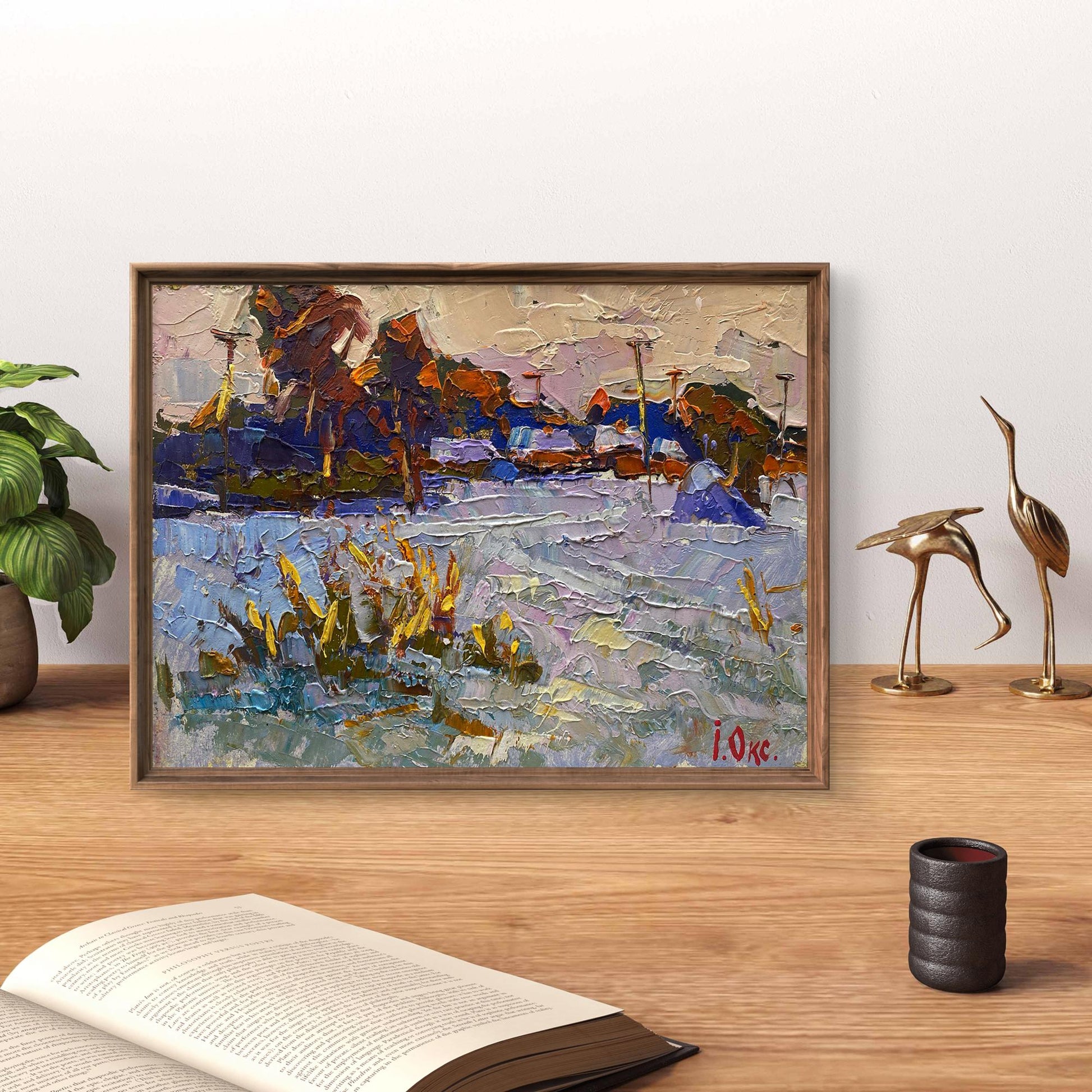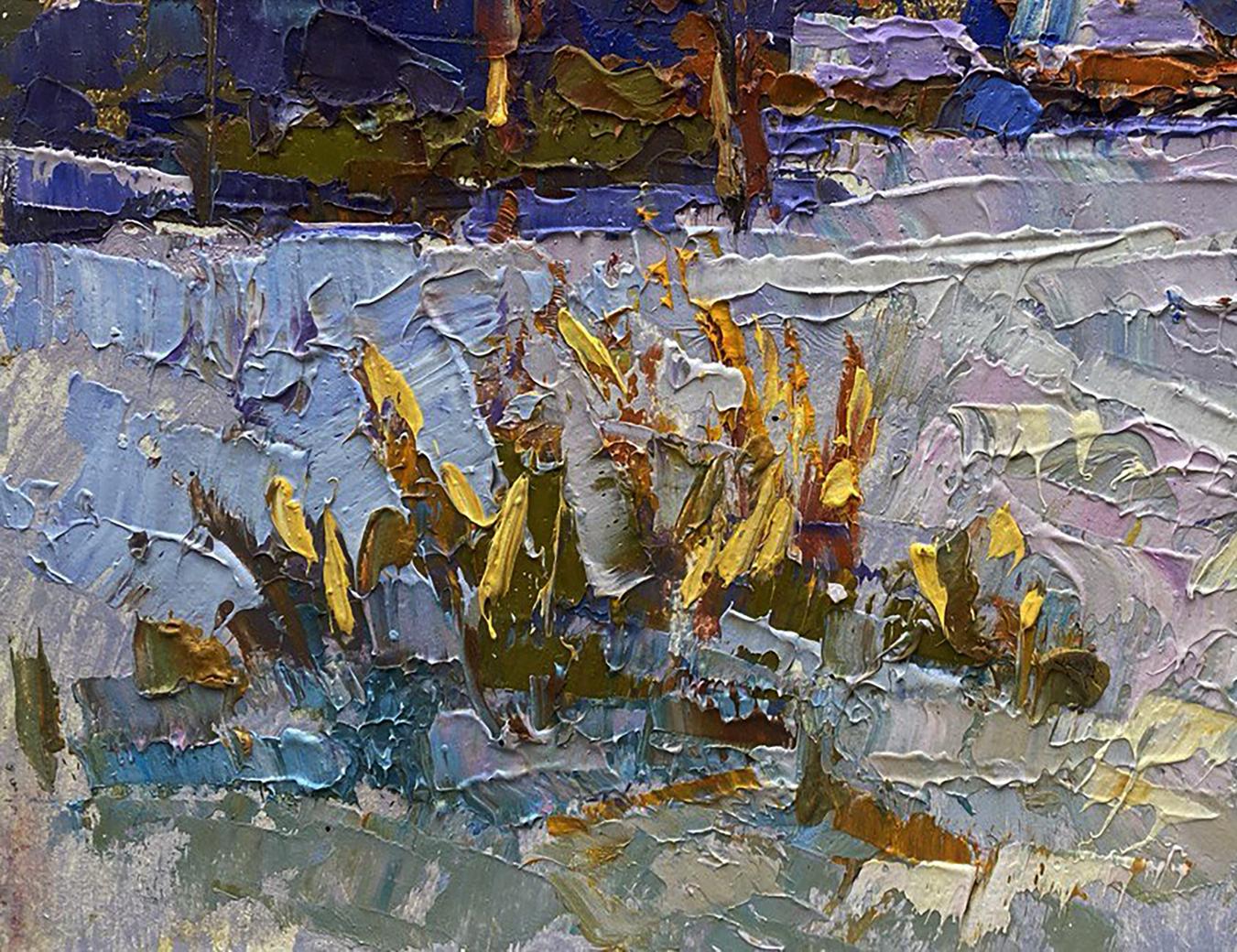 The painting titled "Village in Winter" depicts a serene rural scene blanketed in snow, capturing the quiet beauty of a village during the cold season. The artist uses a palette knife technique to apply thick layers of oil paint, creating a textured, almost three-dimensional surface that enhances the depth and atmosphere of the composition. The color palette, dominated by cool tones of blue, violet, and white, contrasts beautifully with the warm accents of brown, orange, and yellow, bringing life and warmth to the cold winter landscape. The foreground shows a snow-covered field, painted in soft shades of white, lavender, and pale blue. The textured brushstrokes suggest the uneven surface of the snow, with subtle shadows and reflections adding depth and realism. Scattered across the field are yellow and orange stalks of dried grass, poking through the snow, symbolizing the resilience of nature even in harsh conditions. These bright accents bring warmth and energy to the otherwise cool color scheme. The thick, layered application of paint in the foreground conveys the tactile sensation of fresh snow, emphasizing the quiet, untouched beauty of a winter landscape. The middle ground features a row of traditional village houses, their rooftops covered in snow. The houses are painted in muted tones of blue, brown, and white, blending harmoniously with the surrounding landscape. The snow-covered roofs add a sense of coziness and shelter, evoking the warmth of life inside, despite the cold weather outside. Behind the houses, a line of trees painted in deep greens and browns creates a natural boundary between the village and the horizon. The trees, with their bare branches, stand as silent witnesses to the changing seasons, adding a touch of melancholy and tranquility to the scene. Several wooden poles are visible throughout the composition, likely supporting electrical lines, hinting at the presence of human life and modernity in this otherwise timeless rural setting. The background is filled with a soft, cloudy sky, painted in shades of beige, pale pink, and light gray. The sky appears hazy, suggesting a calm winter day, with the sun hidden behind the clouds. The muted colors in the sky create a sense of stillness and quiet, reinforcing the peaceful atmosphere of the village. The combination of warm and cool tones in the background creates a sense of balance, making the composition feel harmonious and complete. The blurred edges of the horizon suggest a gentle transition between the village and the sky, emphasizing the vastness of the winter landscape. "Village in Winter" is a captivating portrayal of a snowy rural landscape, capturing both the beauty and tranquility of winter. The thick textures and harmonious color palette bring depth and life to the scene, while the quiet atmosphere evokes feelings of peace and reflection. The painting invites the viewer to experience the timeless charm of village life during winter, appreciating the simple, enduring beauty of nature in all its forms.