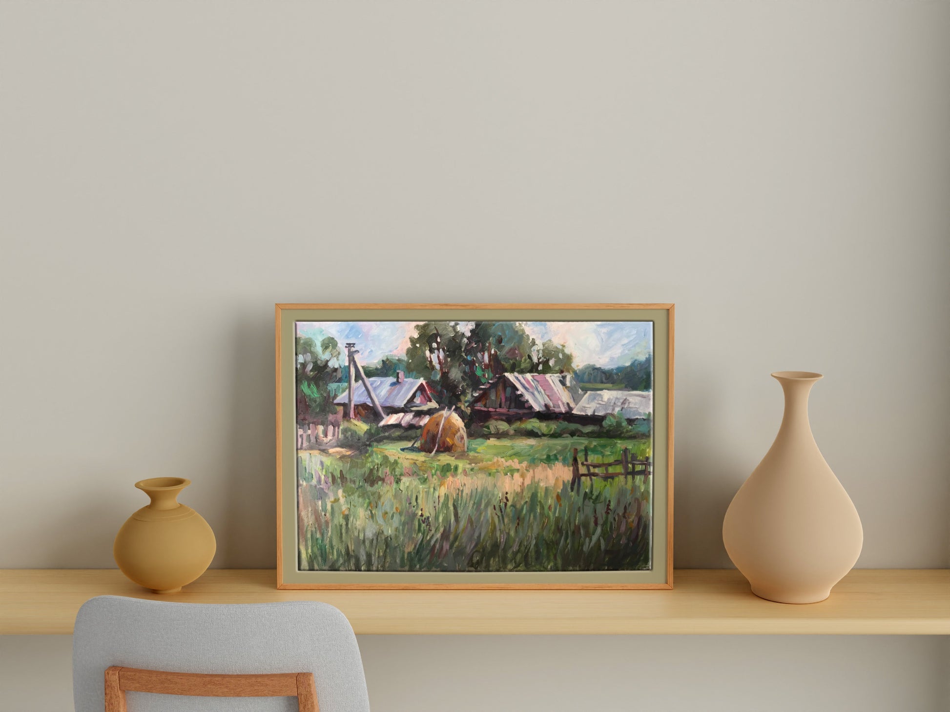 This beautiful oil painting is titled "Village Landscape." The idyllic scene depicts a rural village with houses nestled amongst haystacks and rolling hills. The bright blue sky is dotted with fluffy white clouds, and the high green grass fence provides a lovely frame for the picture. It's the perfect way to add a touch of tranquility and charm to any room.
