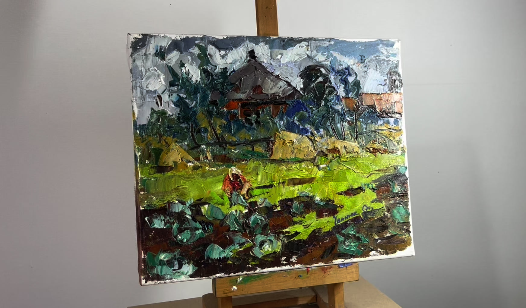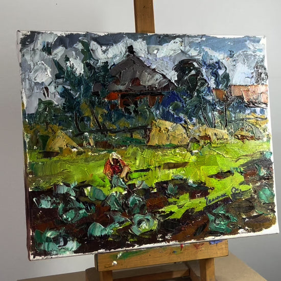 This artwork delves deep into the essence of village life, portraying its simplicity and the rhythmic, enduring cycles that have persisted over time. The use of rich greens and earthy hues vividly illustrates the villagers' profound connection to the fertile land. The painting's robust textures and strokes emphasize the tangible relationship between the villagers and their environment, conveying a sense of physicality and presence.