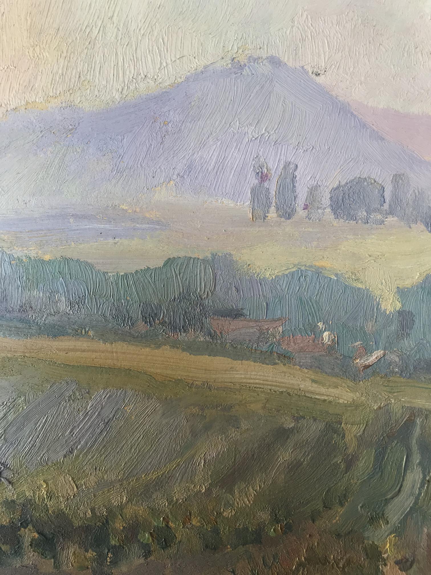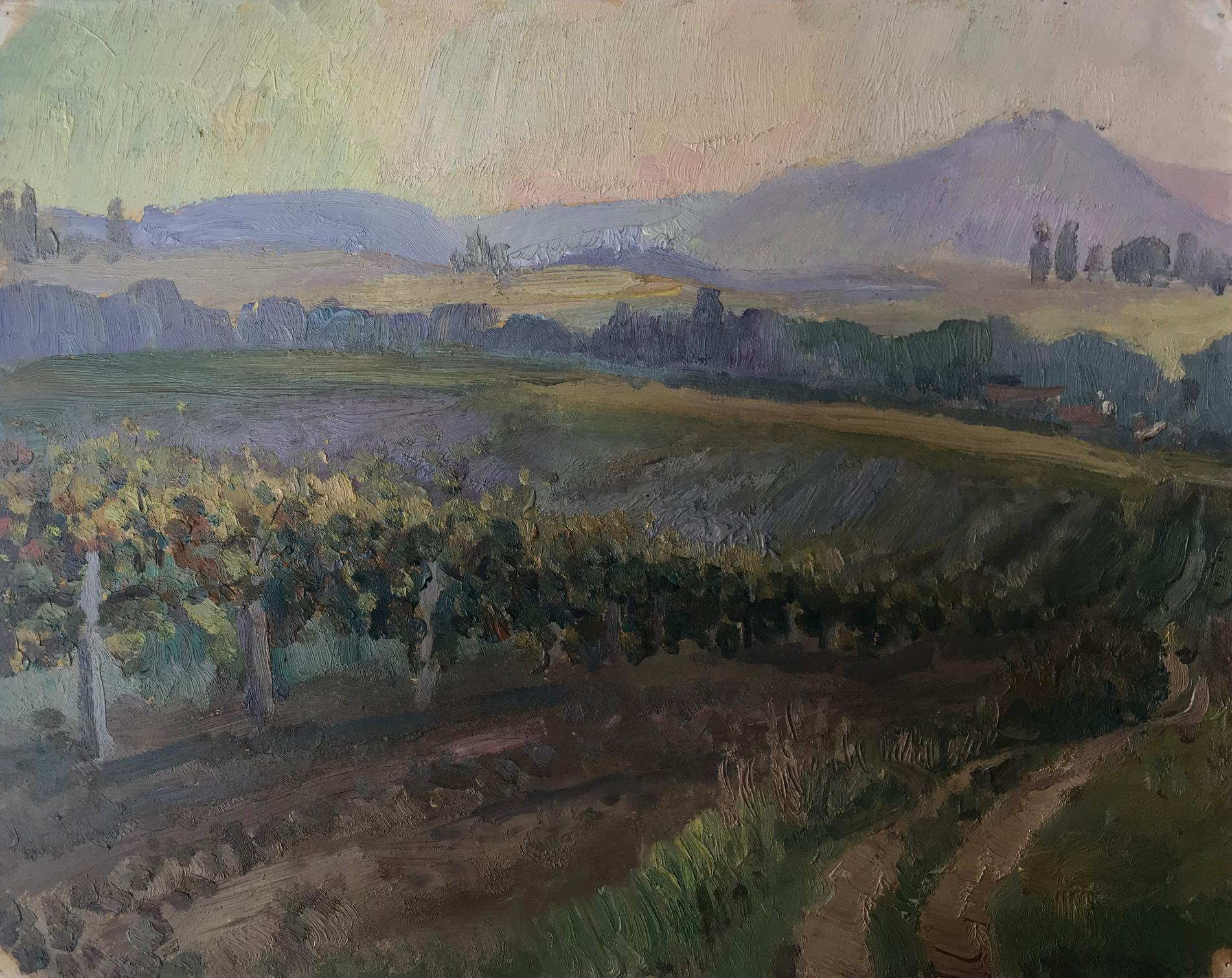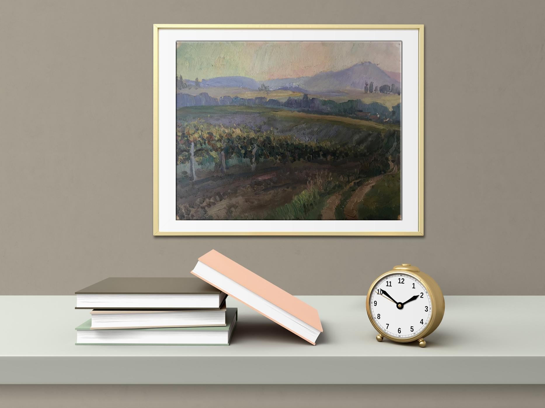This oil painting called "Vineyards" is an original work of art that captures the beauty of the vineyards on a slope. The colors are stunning, and the painting is full of detail. The distant mountains in the background add to the overall majesty of the scene. This is a truly wonderful piece that would be perfect for any home or office.