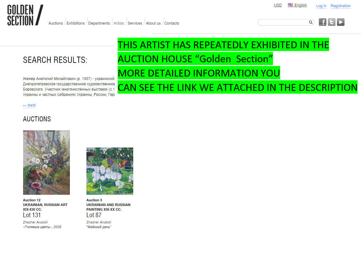 About the artists: Zhezher Anatoly Mikhailovich (b. 1937) - Ukrainian painter. Was born in the city of Dneprodzerzhinsk. Graduated from Dnepropetrovsk State Art School (1961), where he studied under G. Chernyavsky, M. Rodzin, M. Borovsky. Participant of numerous exhibitions (since 1961). Member of the National Union of Artists (1978). The artist's works are kept in museums in Ukraine and private collections in Ukraine, Russia, Germany, Belgium, Great Britain and other countries.