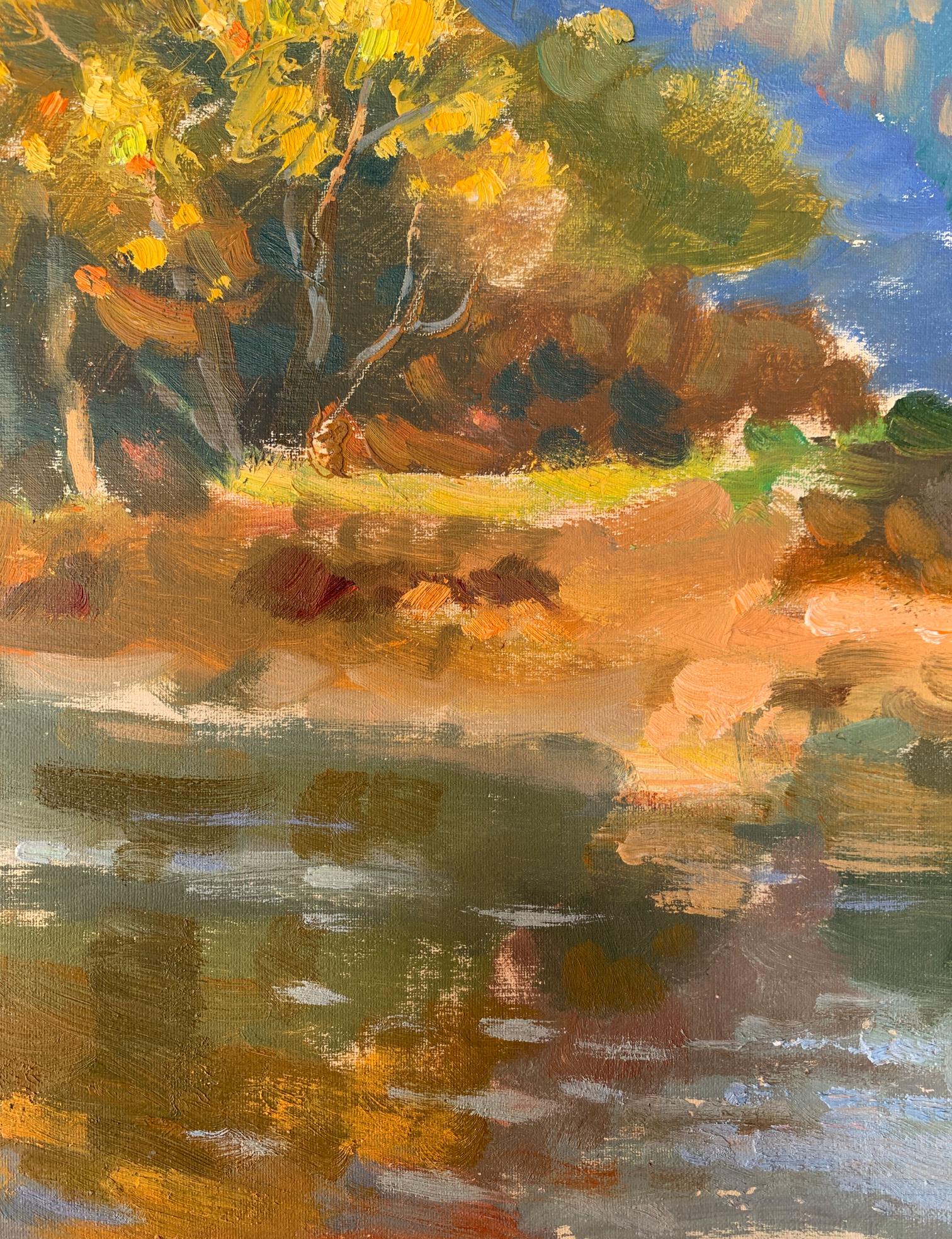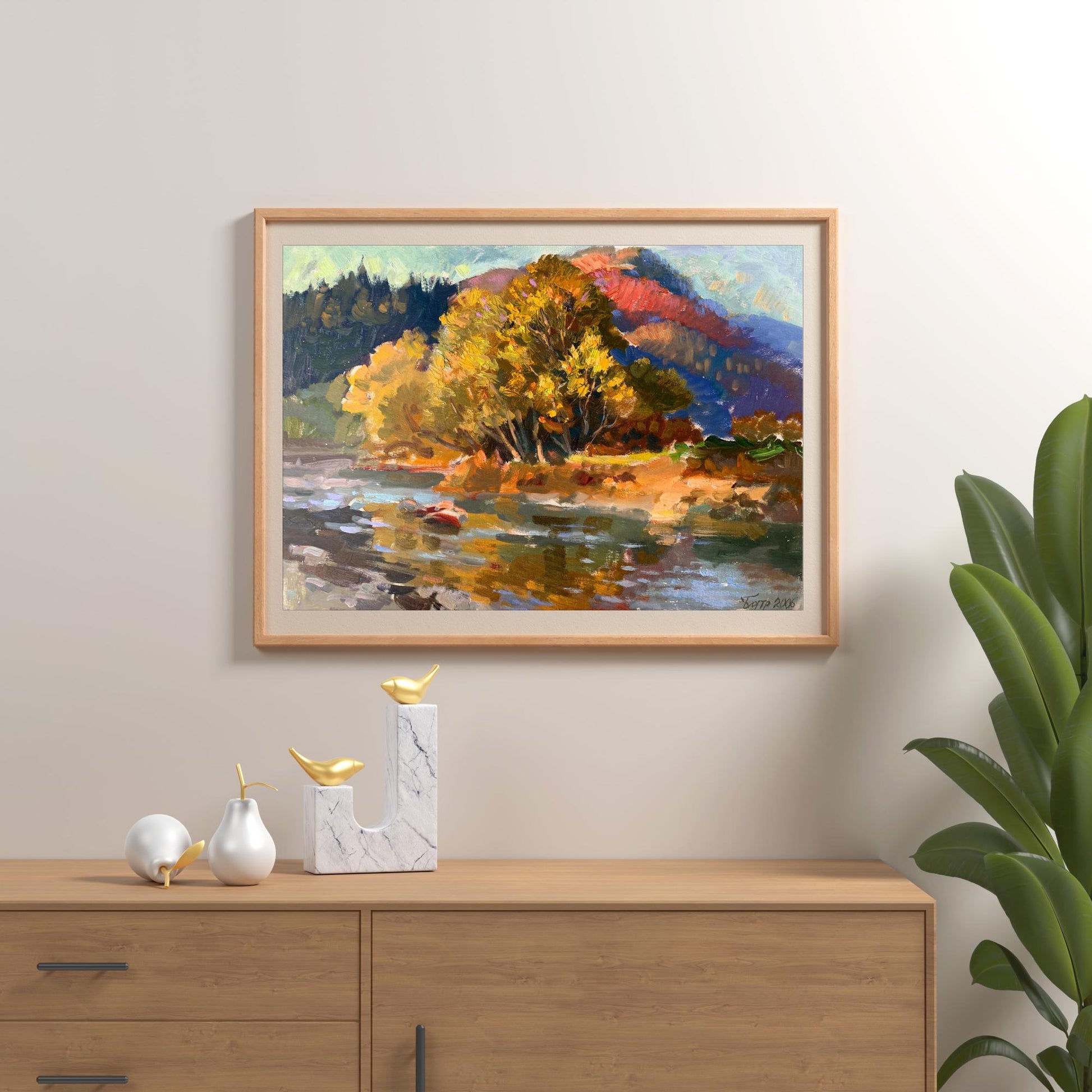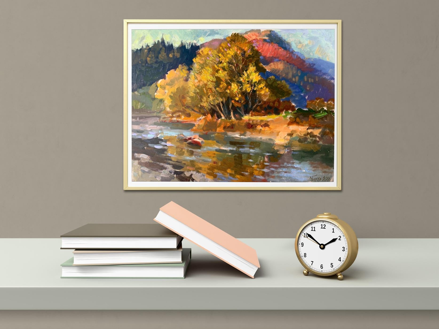 This gorgeous oil painting features a tranquil autumn scene. A river flows through the center of the painting, with a hill beyond the river. The forest on the hill is ablaze with autumn colors. It's a beautiful and peaceful painting that would make a great addition to any home.