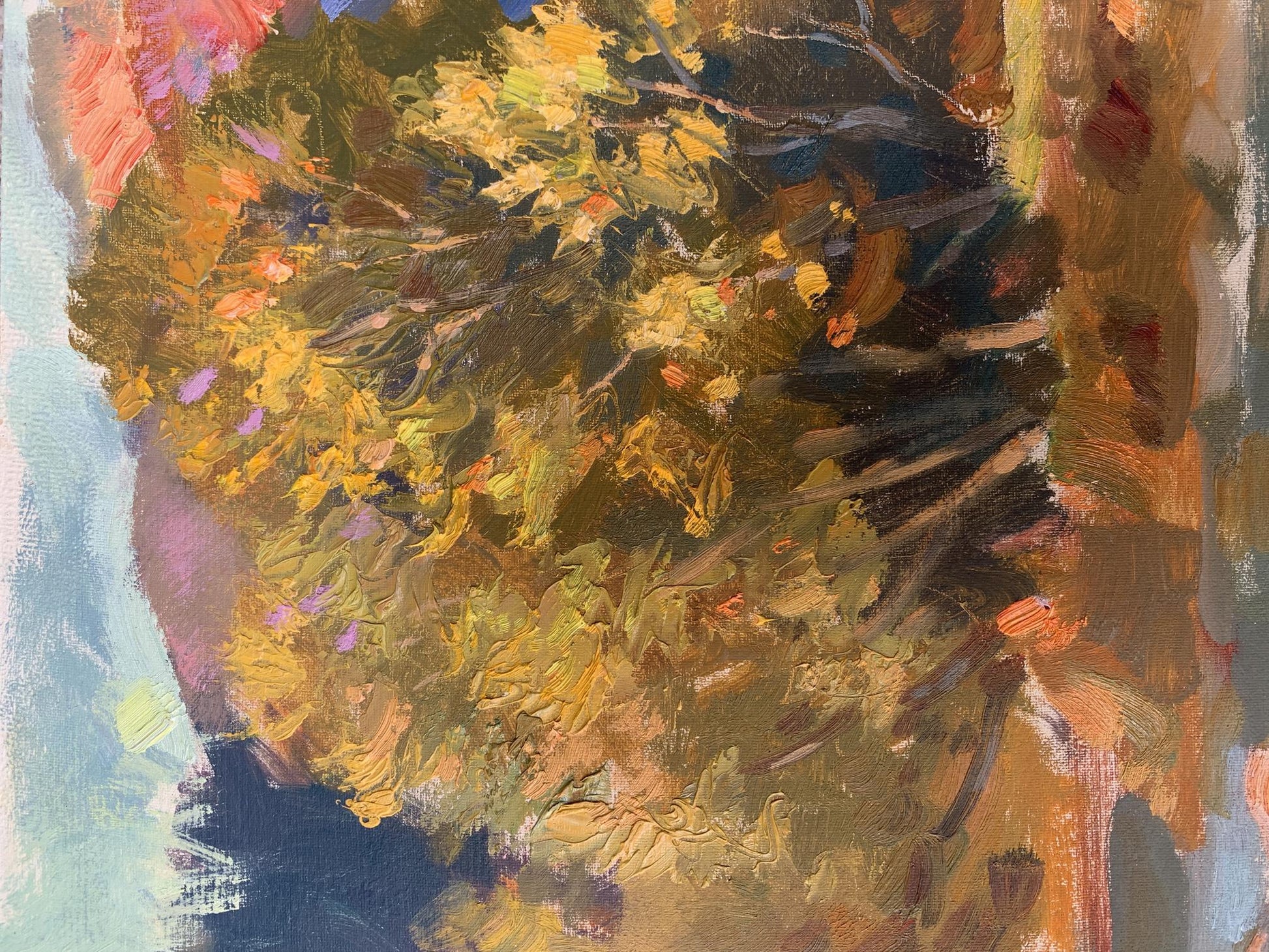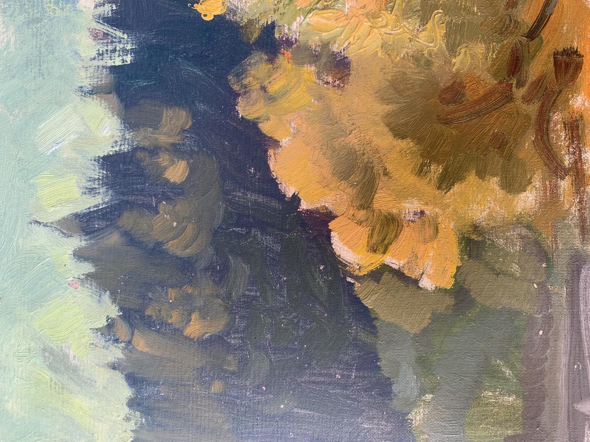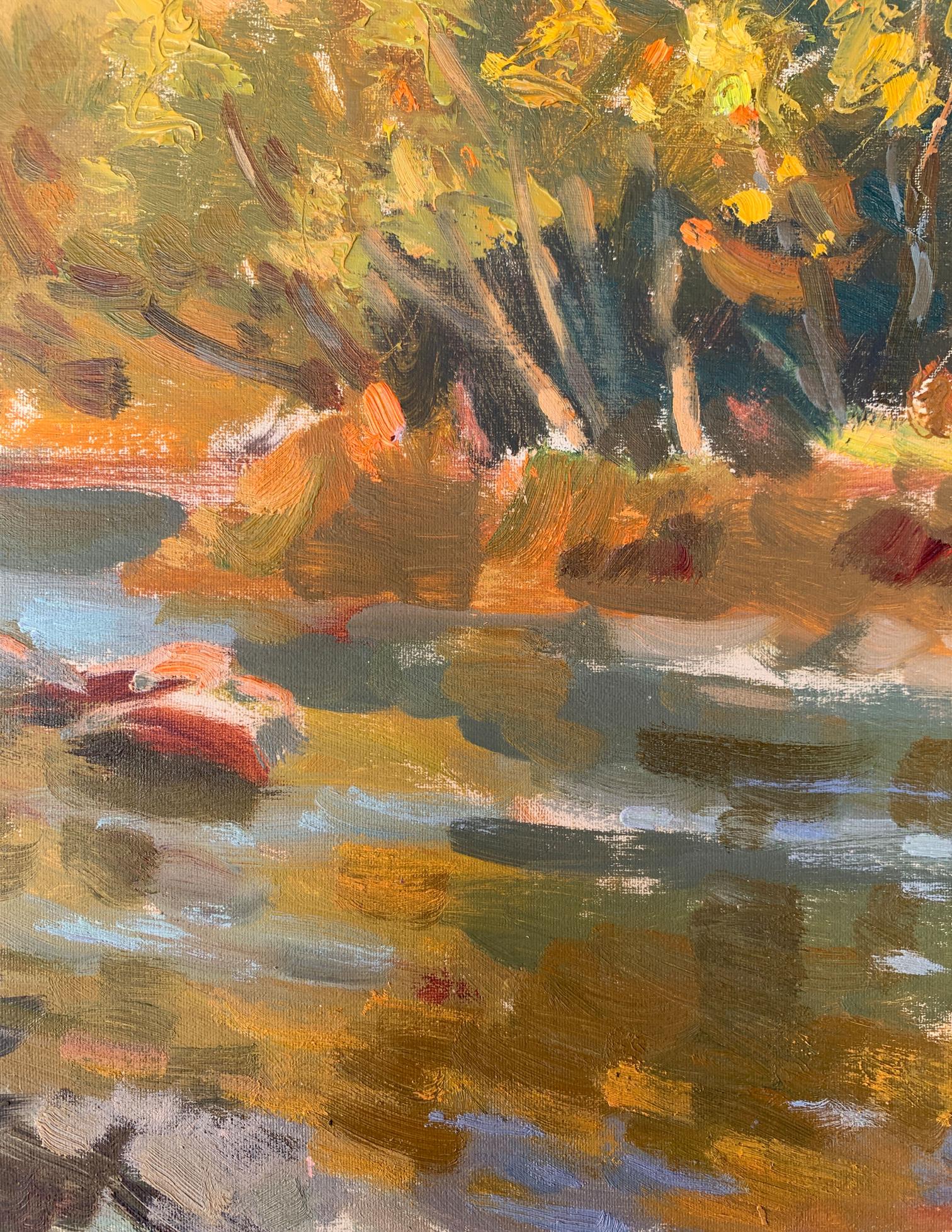 This gorgeous oil painting features a tranquil autumn scene. A river flows through the center of the painting, with a hill beyond the river. The forest on the hill is ablaze with autumn colors. It's a beautiful and peaceful painting that would make a great addition to any home.