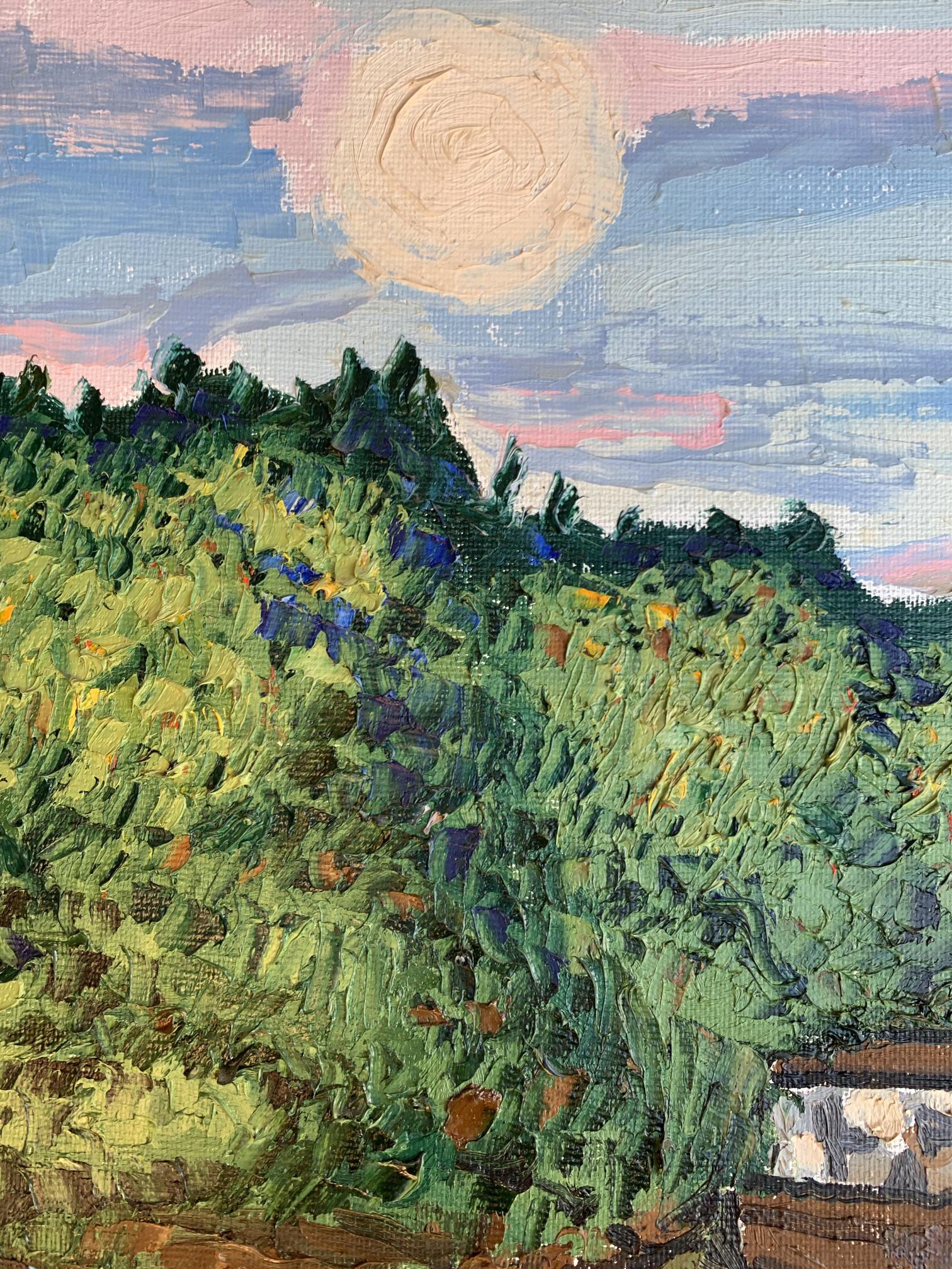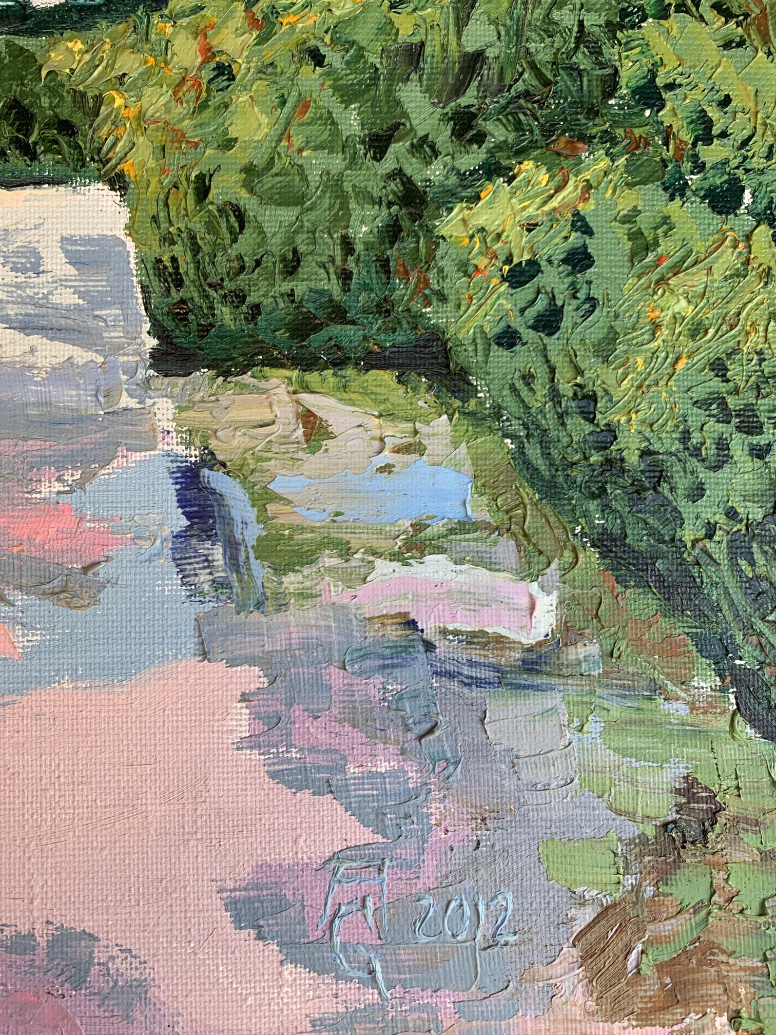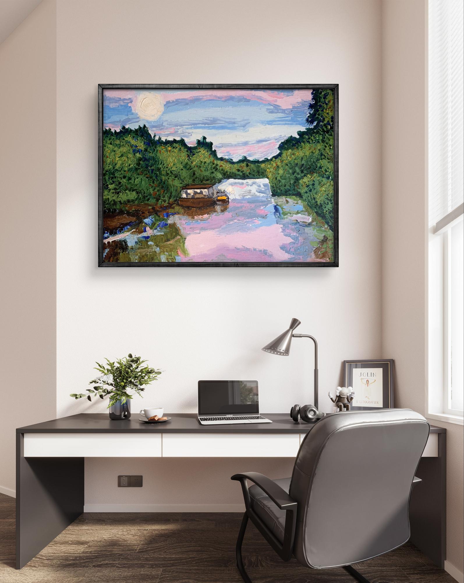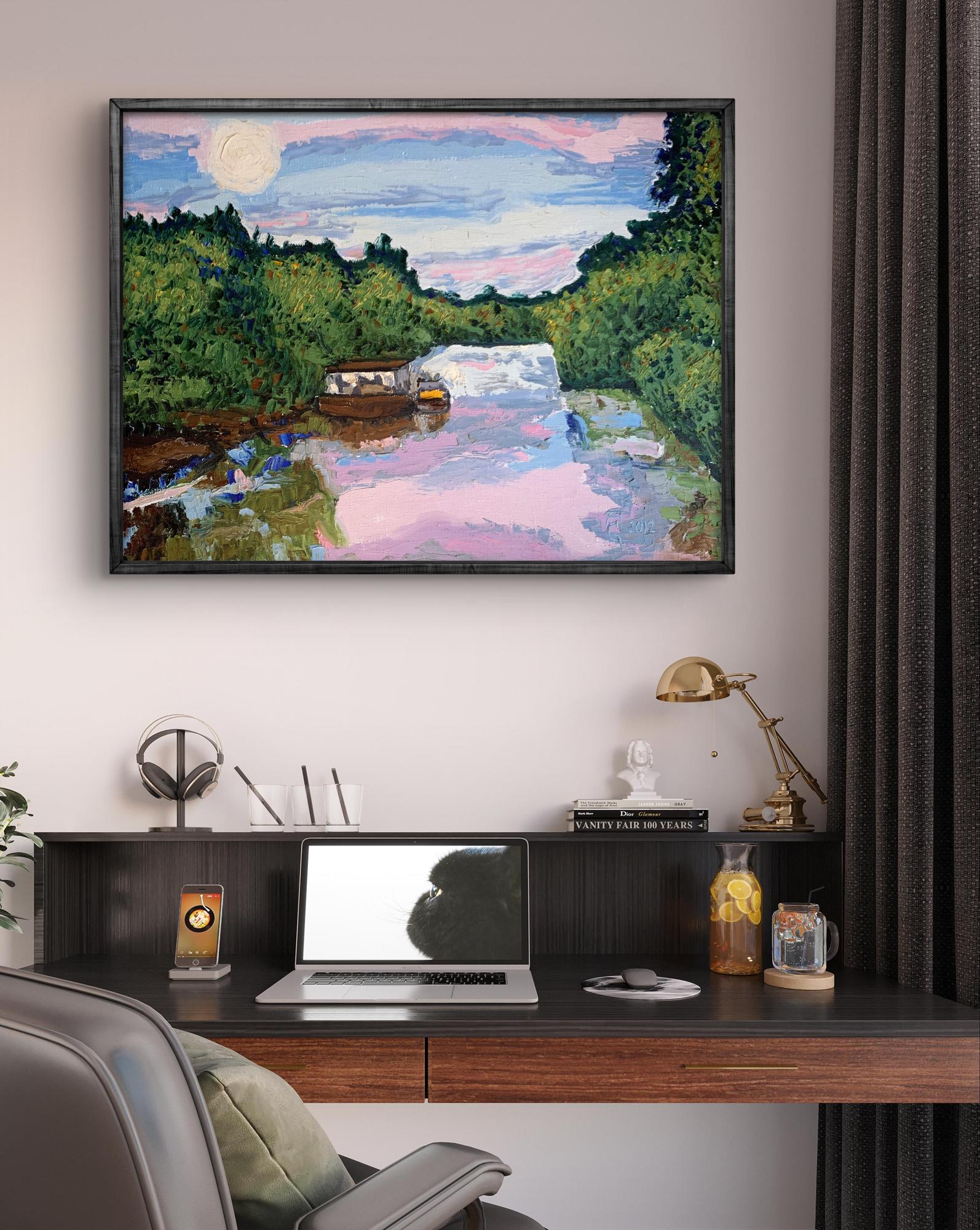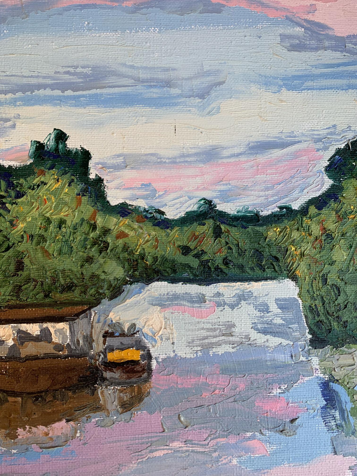 The painting "Warm Day by the River" is an enchanting oil on canvas piece that captures the tranquility and beauty of a serene riverside scene on a warm day. The artist uses a vibrant and harmonious color palette, featuring lush greens, soft blues, warm browns, and pastel pinks. The technique involves textured, impressionistic brushstrokes, which add depth and movement to the painting. The impasto technique gives the foliage and water a tactile quality, enhancing the sense of realism and immersion. The composition leads the viewer's eye from the foreground to the background, creating a sense of depth and perspective. The scene is framed by dense green foliage on both sides, with the river flowing gently between them. In the middle ground, a small boat is docked by a wooden structure, adding a focal point and narrative element to the painting. The lush, dense greenery on both sides of the river is depicted with a variety of green hues, interspersed with hints of yellow, orange, and blue. The textured brushstrokes give the foliage a lively, vibrant appearance. The river is painted in soft blues and pinks, reflecting the colors of the sky. The gentle ripples on the water's surface are rendered with delicate, horizontal strokes, creating a sense of calm and tranquility. The small boat, painted in warm brown tones, is moored beside a simple wooden structure. The structure, with its earthy colors, blends harmoniously with the surrounding nature. This element adds a human touch to the otherwise natural scene, suggesting a quiet moment of rest or contemplation. The sky is a blend of soft pastel pinks and blues, suggesting either early morning or late afternoon light. Light, wispy clouds are painted with smooth, blended strokes, adding to the serene atmosphere of the scene. A bright, glowing sun hovers just above the treeline, casting a warm light over the entire scene. The sun's reflection can be seen in the water, adding a dynamic element to the composition. The overall mood of the painting is peaceful and reflective, evoking a sense of relaxation and connection with nature. The warm colors and gentle brushstrokes create an inviting and soothing atmosphere, making the viewer feel as though they are experiencing the quiet beauty of a warm day by the river. "Warm Day by the River" can be interpreted as a celebration of nature's tranquility and the simple pleasures of life. The presence of the boat and structure suggests human interaction with the natural environment, highlighting the harmony and peace that can be found in such settings. The painting invites viewers to pause and appreciate the beauty of a quiet moment by the water. This painting beautifully captures the essence of a warm, peaceful day by the river, using color and texture to create a vivid and immersive scene that invites contemplation and relaxation.