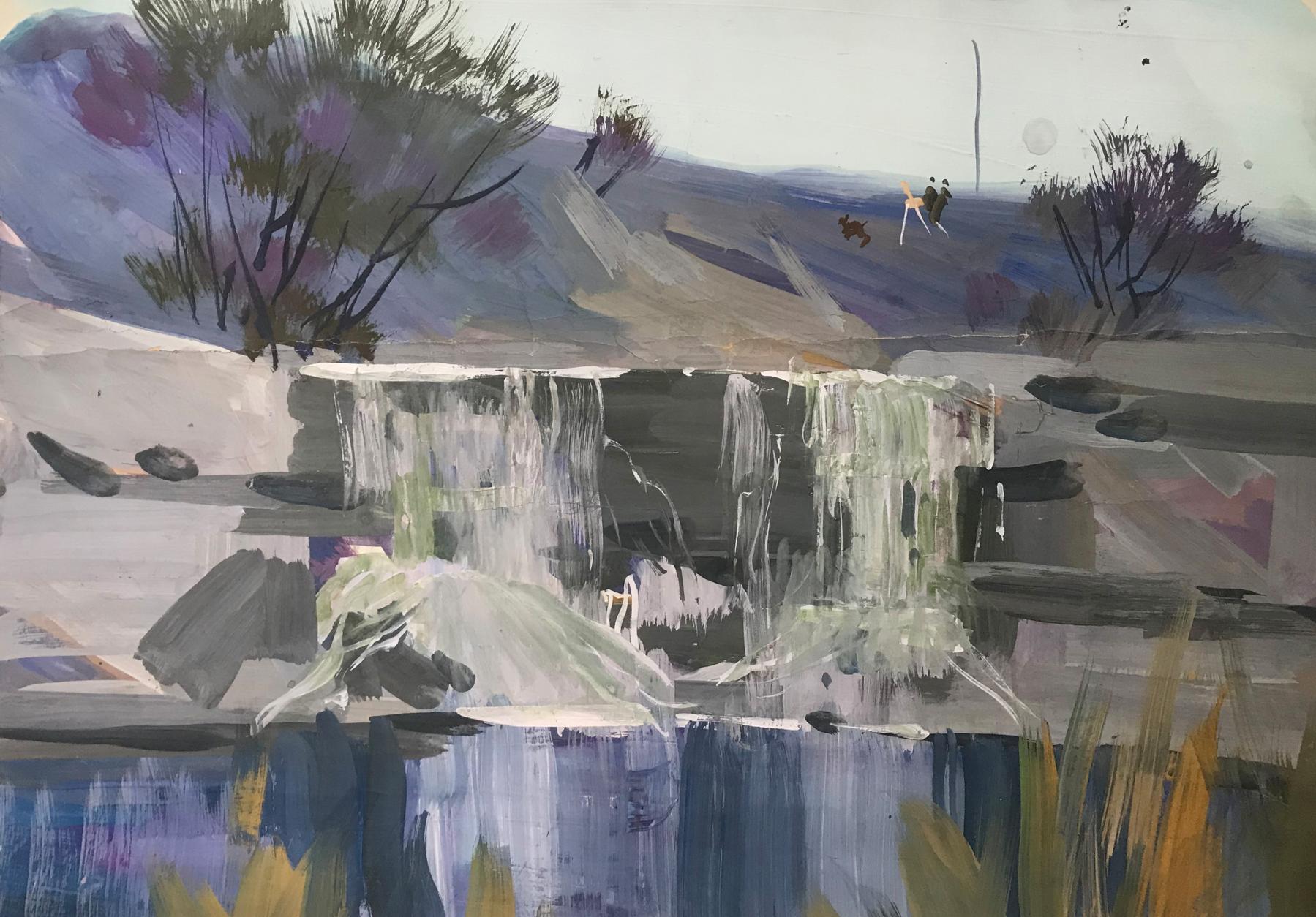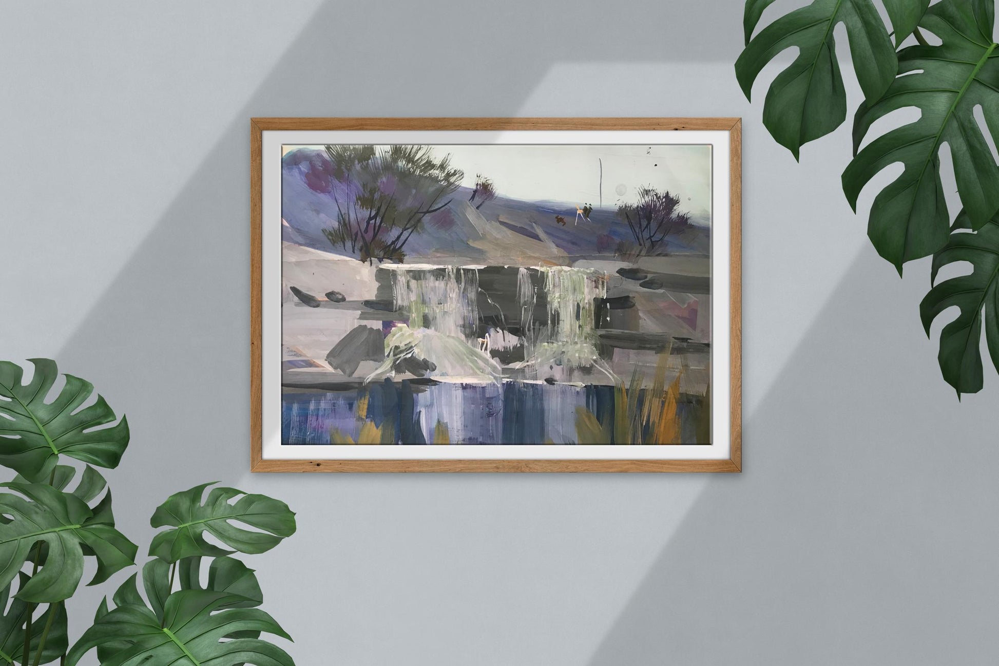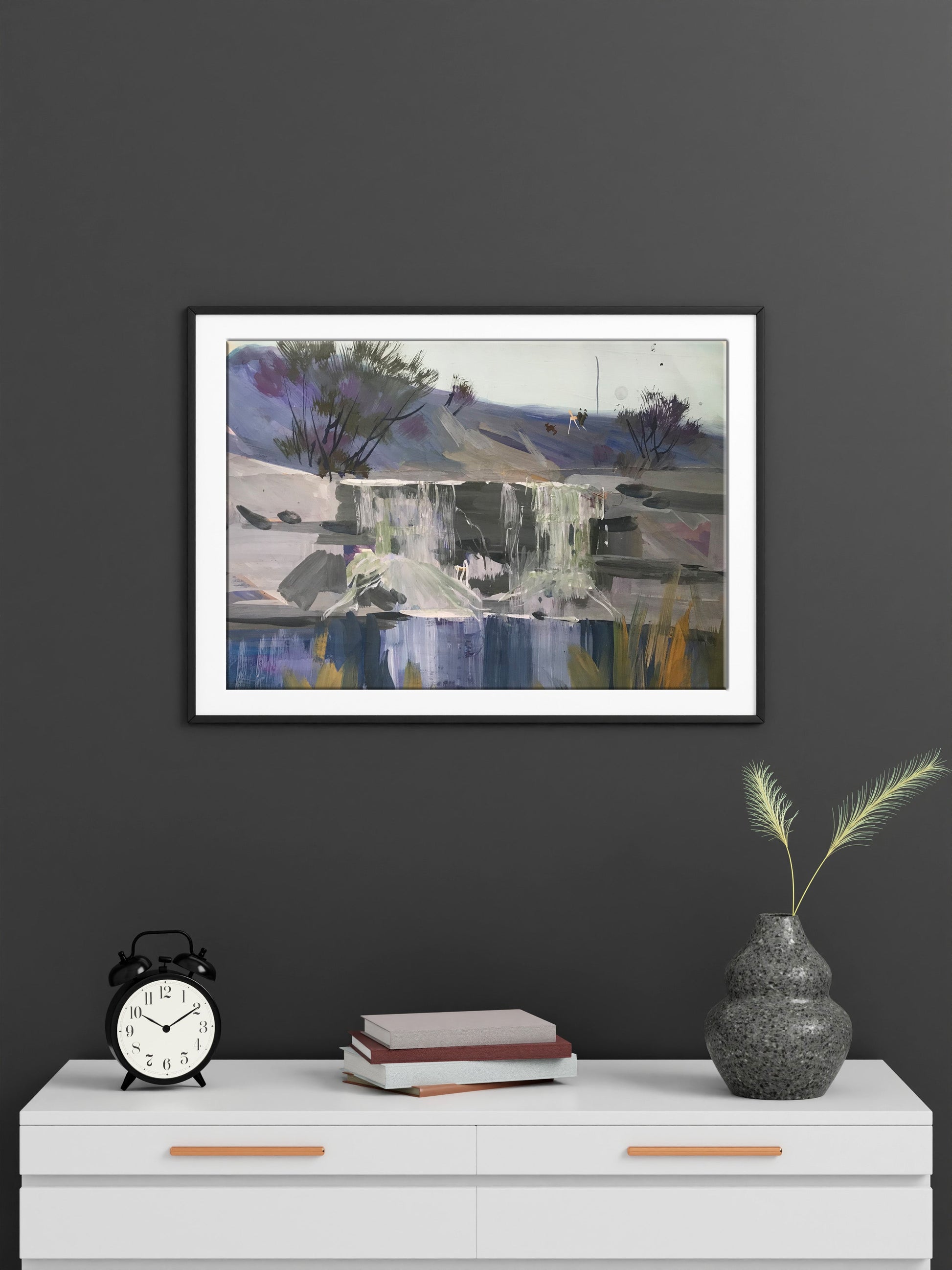 This stunning oil painting depicts a beautiful waterfall cascading down a rocky hill. The vibrant colors and rushing water create a sense of movement and energy, while the stone ledge provides a calm and stable foundation. The painting is sure to make a statement in any home or office, and would be the perfect addition to any nature-themed décor.