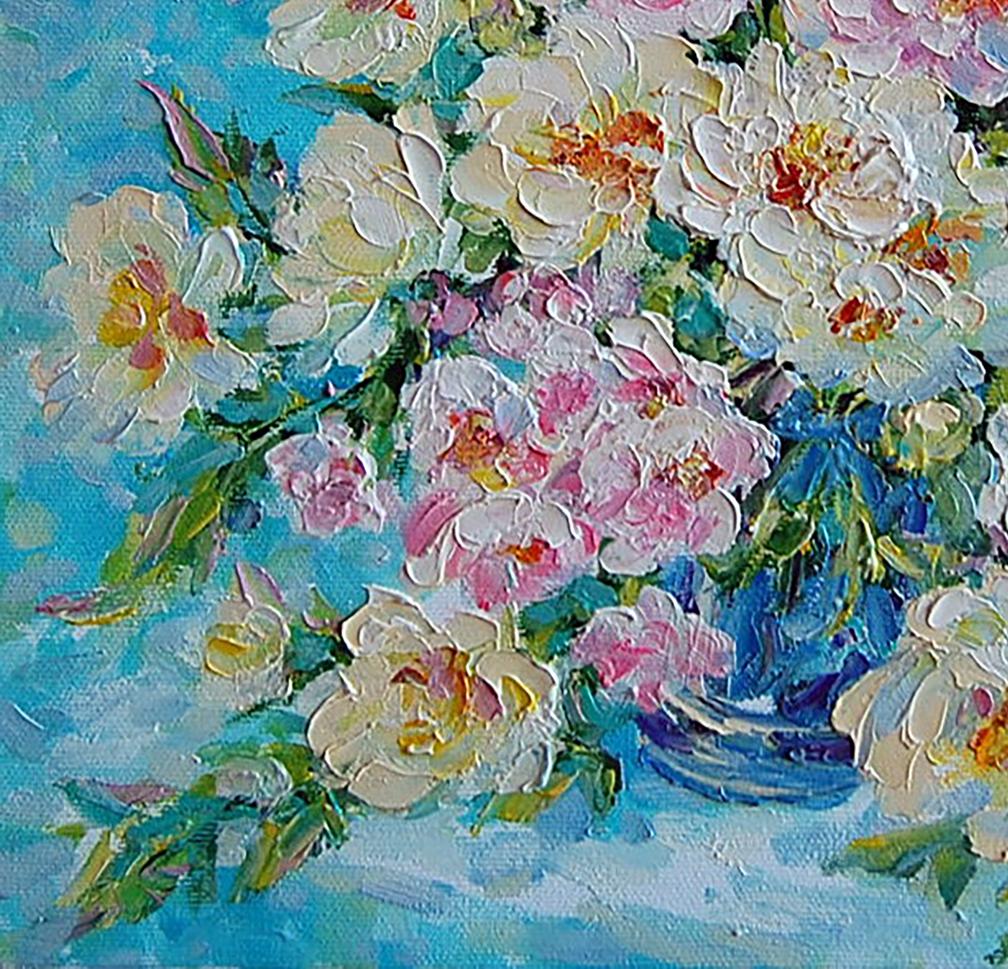 In "White Flowers," Ukrainian artist Olga Artim presents a soft and elegant floral composition, featuring a lush bouquet of white and pale pink flowers arranged in a delicate blue vase. The thick, expressive brushstrokes bring texture and vibrancy to the flowers, while the soft shades of blue in the background enhance the light and airy quality of the painting. This serene and graceful piece is a perfect addition to any Collection of Still lifes or Collection of Painting with Flowers, offering a timeless portrayal of nature’s beauty.