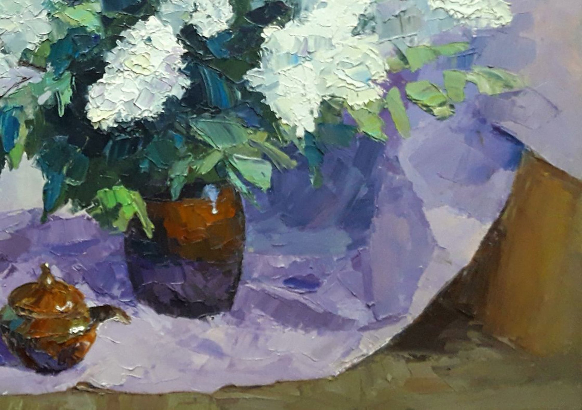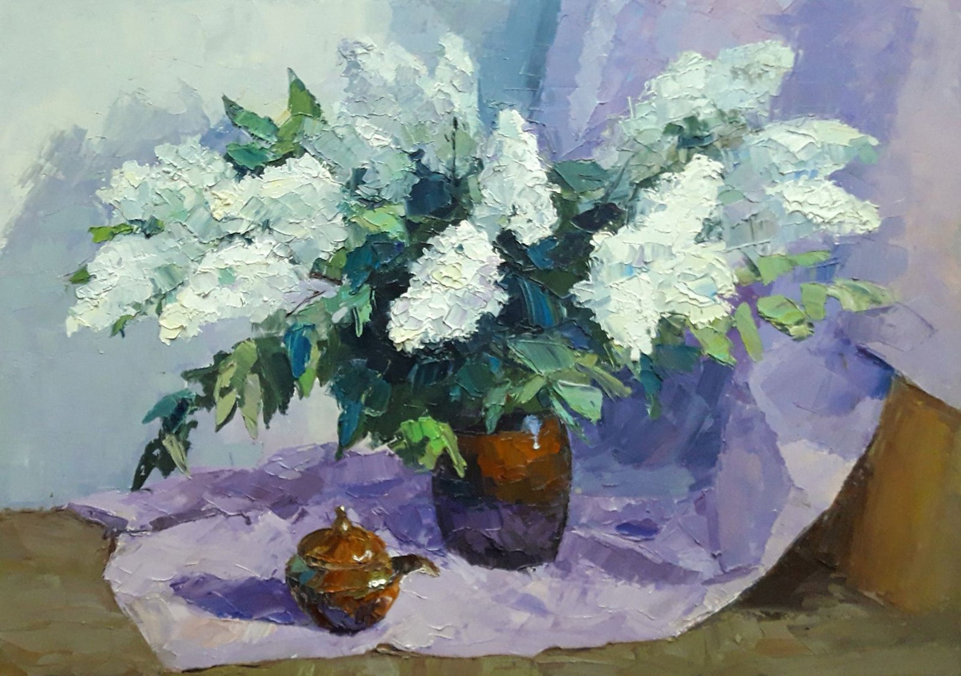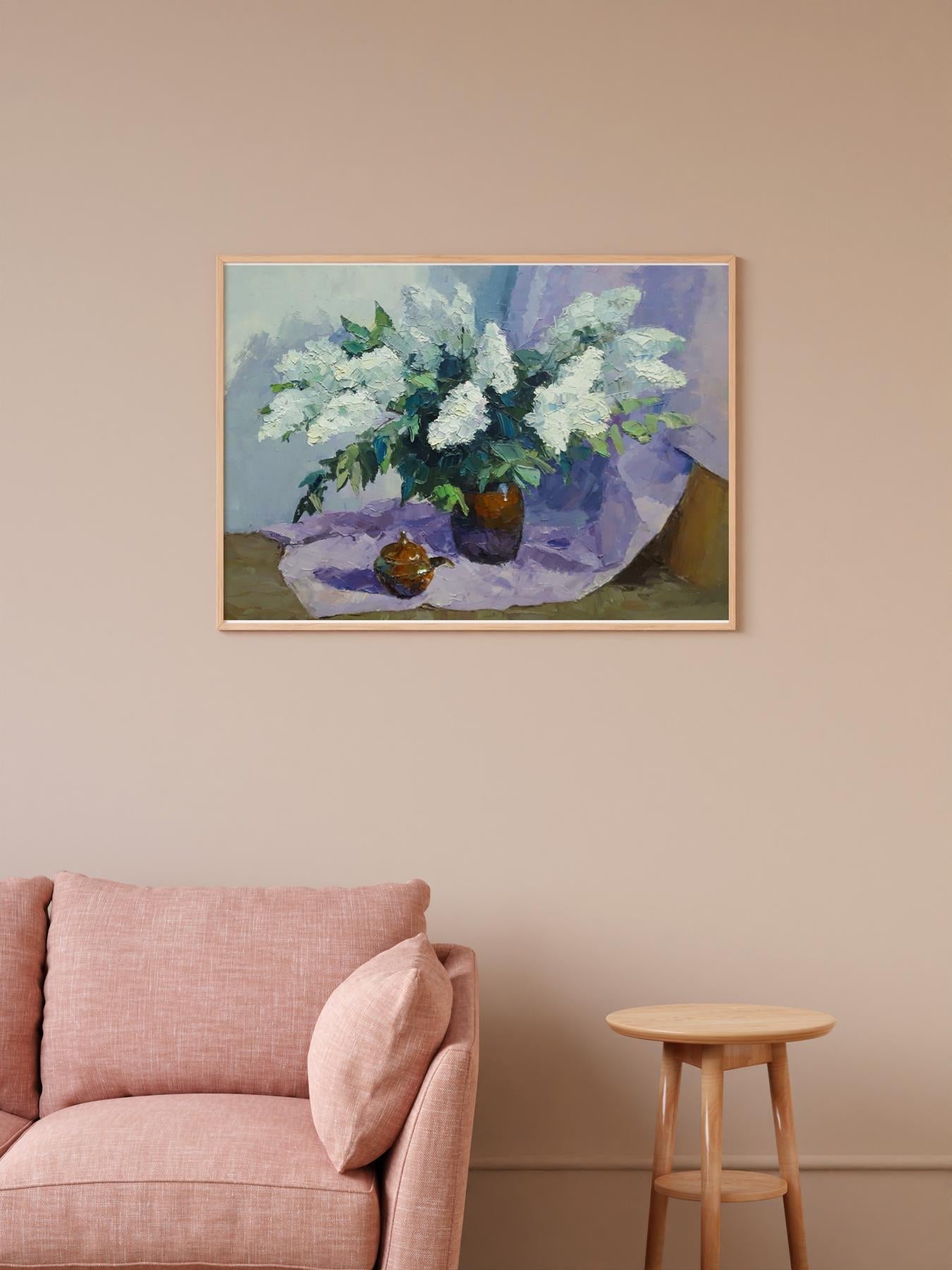 Looking for a piece of art that is sure to make a statement? Look no further than this oil painting, entitled "White lila." This enchanting work features a large bouquet of snow-white lilacs, their delicate petals illuminated by a shaft of light from a nearby window. It's the perfect choice for anyone who wants to add a touch of elegance to their home décor.