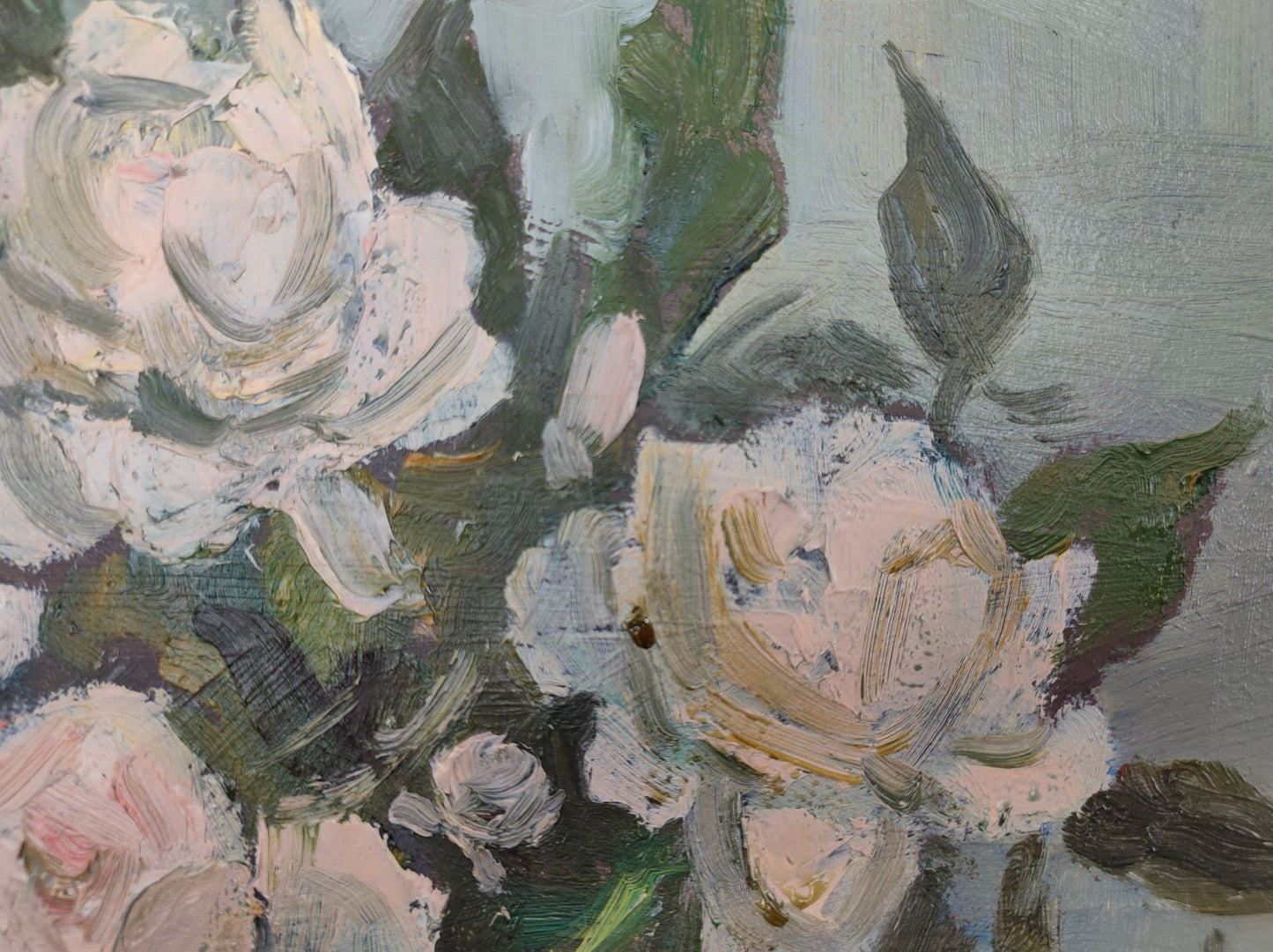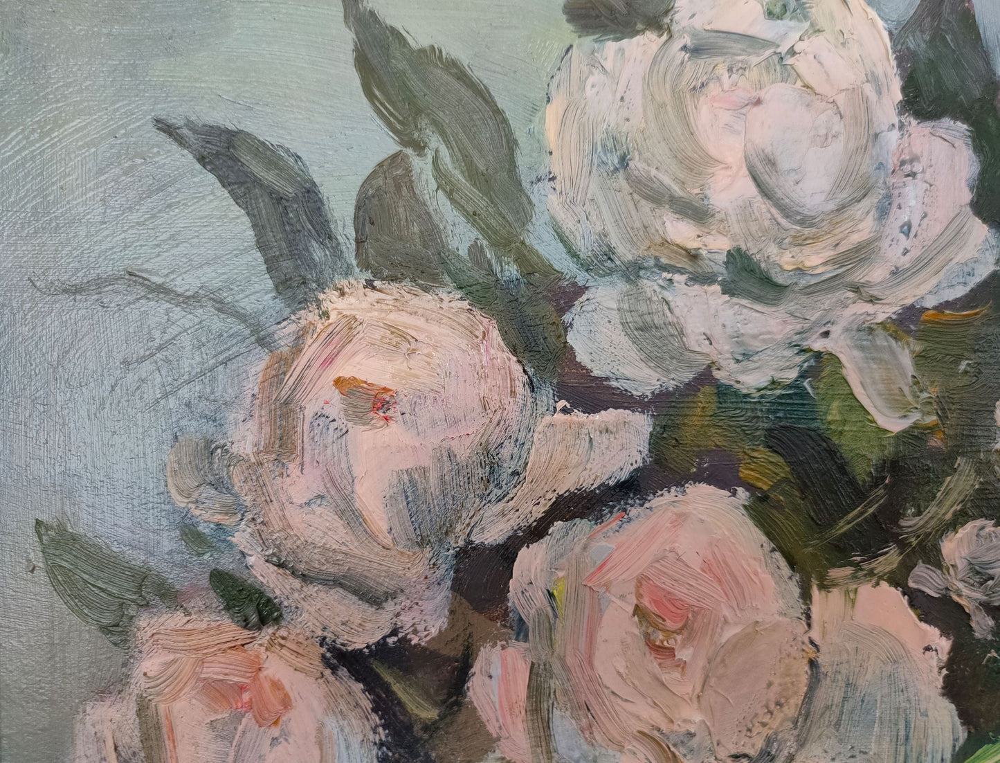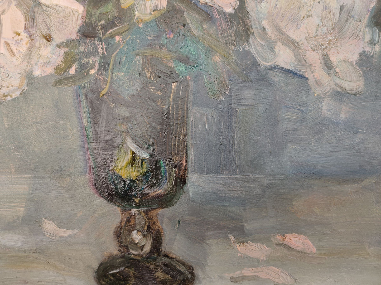 Through "White Peonies," Myshurovsky explores themes of natural beauty, purity, and the fleeting moments of life. The painting celebrates the elegance and complex structure of the flowers, symbolizing peace and the transient nature of beauty. The simple composition—focusing solely on the flowers and vase—suggests a deeper meditation on finding beauty in the ordinary and appreciating the simple pleasures and ephemeral moments in everyday life.