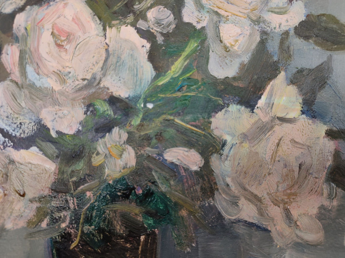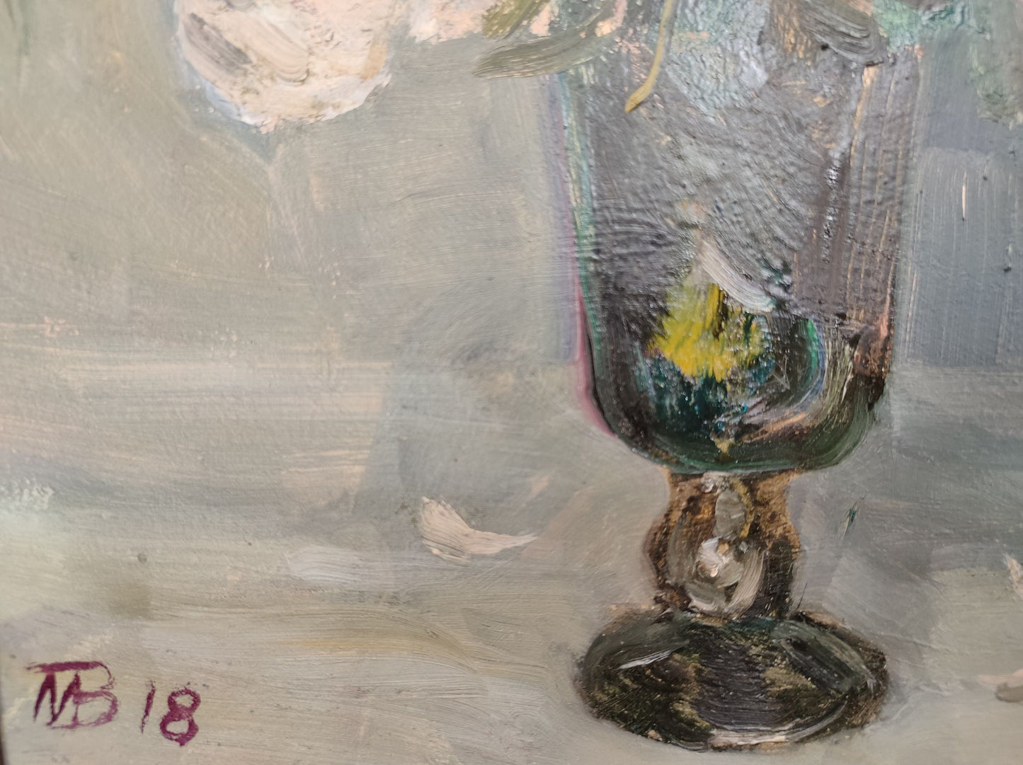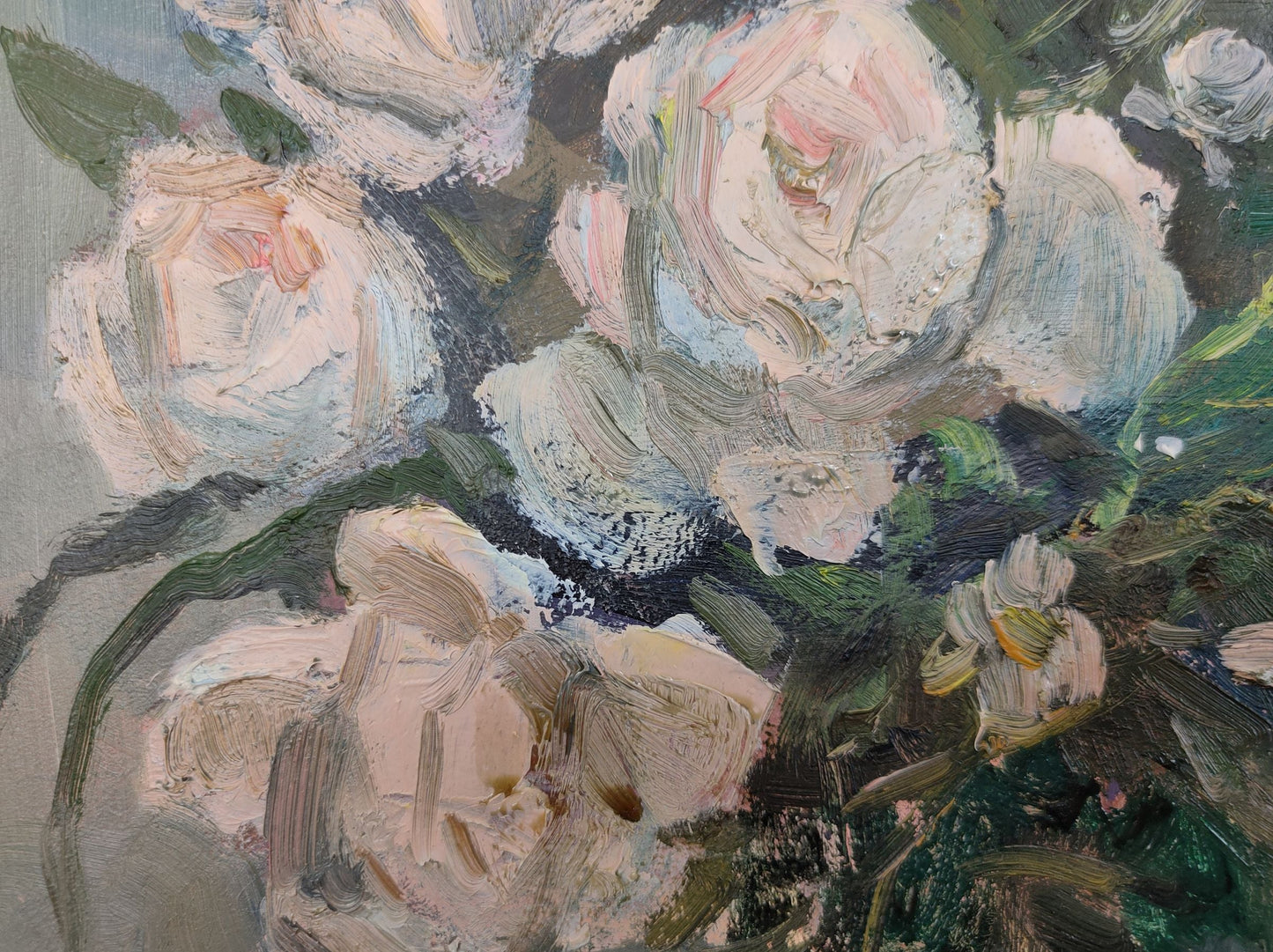 Through "White Peonies," Myshurovsky explores themes of natural beauty, purity, and the fleeting moments of life. The painting celebrates the elegance and complex structure of the flowers, symbolizing peace and the transient nature of beauty. The simple composition—focusing solely on the flowers and vase—suggests a deeper meditation on finding beauty in the ordinary and appreciating the simple pleasures and ephemeral moments in everyday life.