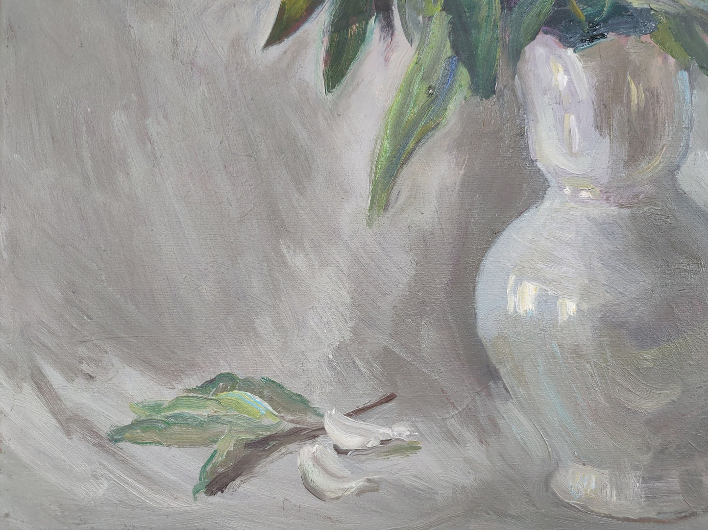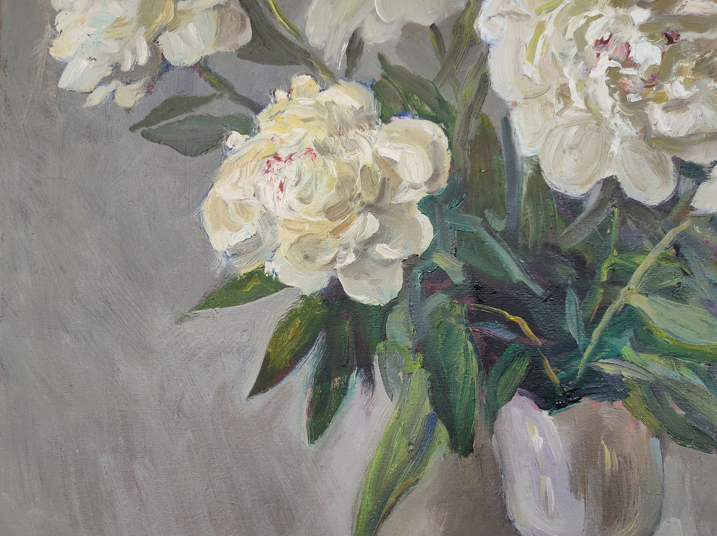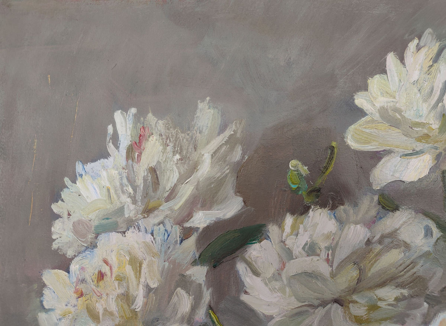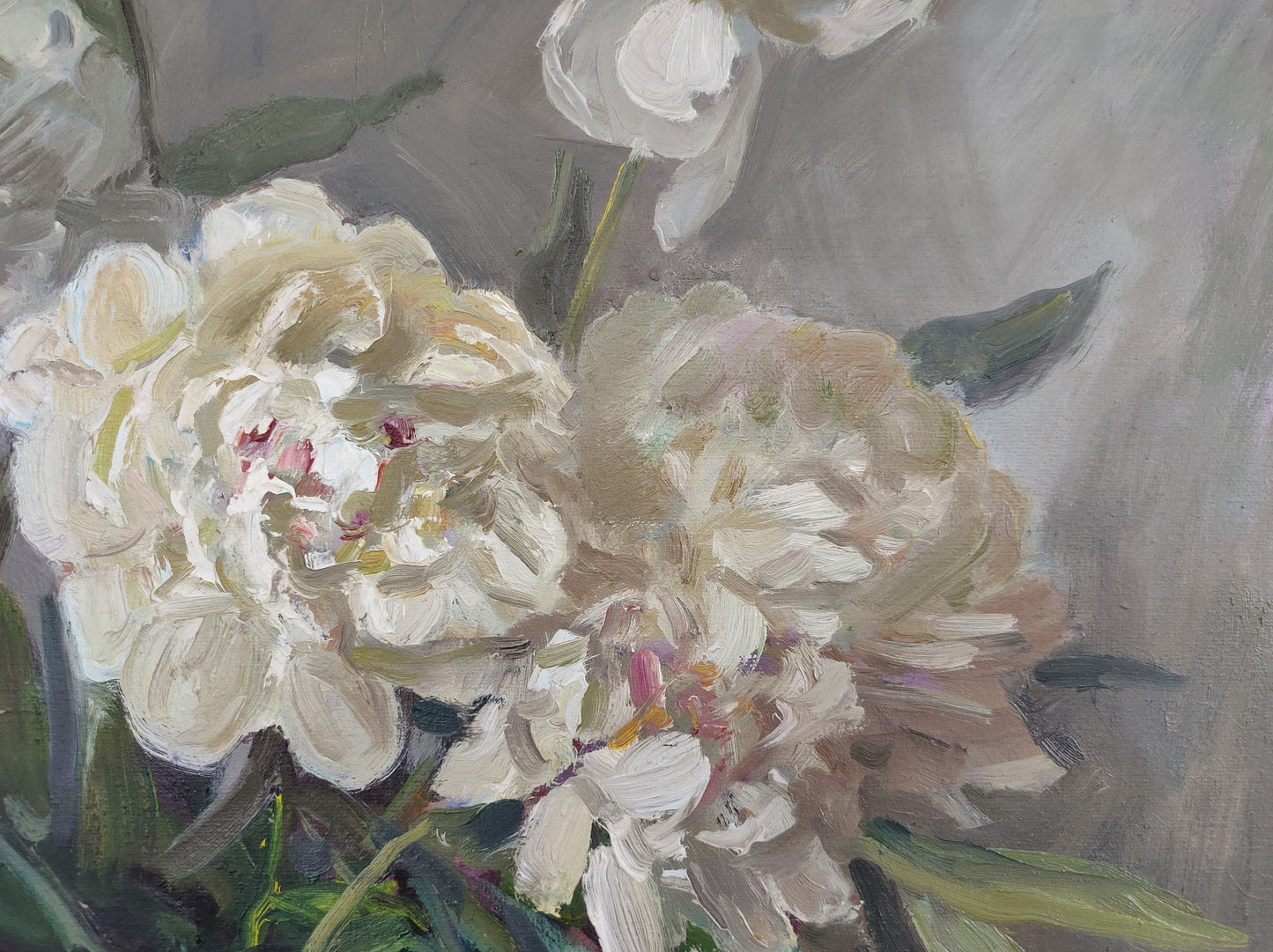 Oil painting White peonies on a silver background Mishurovsky V. V.