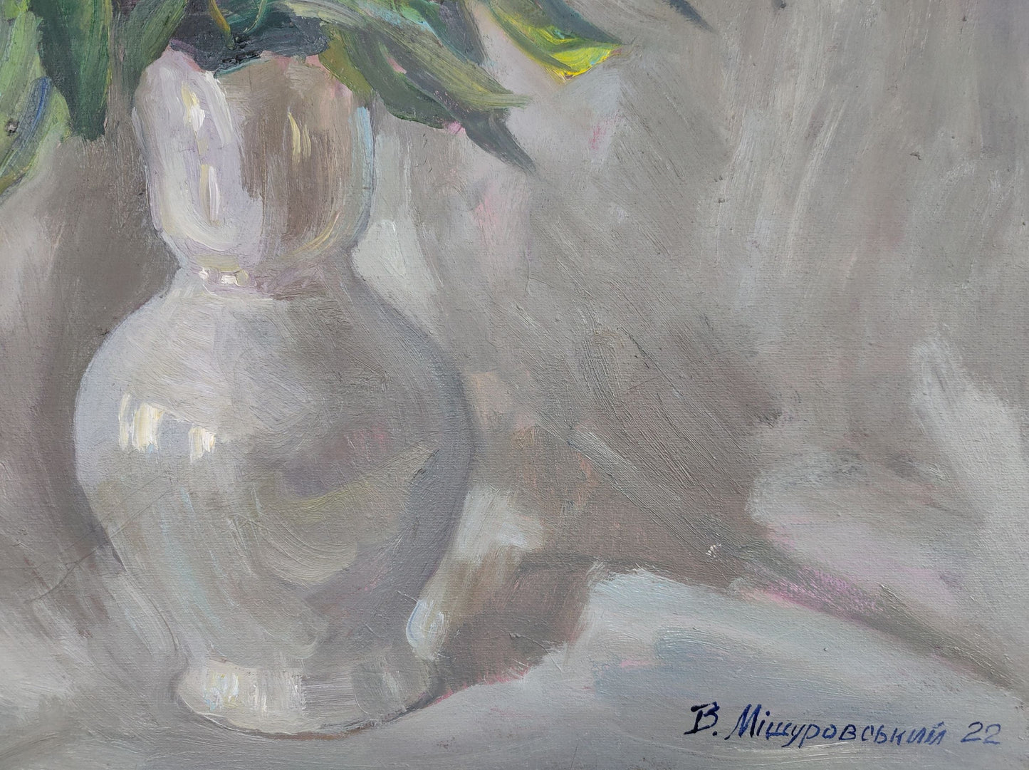 Through "White Peonies on a Silver Background," Myshurovsky seeks to convey the transient beauty of nature and the quiet elegance of simple subjects. The choice of peonies, often symbols of wealth and honor, set against a muted, silver backdrop may suggest themes of fleeting beauty and the dignified grace of natural forms. This work reflects a celebration of natural beauty, inviting viewers to pause and appreciate the quiet, understated elegance of the floral arrangement.