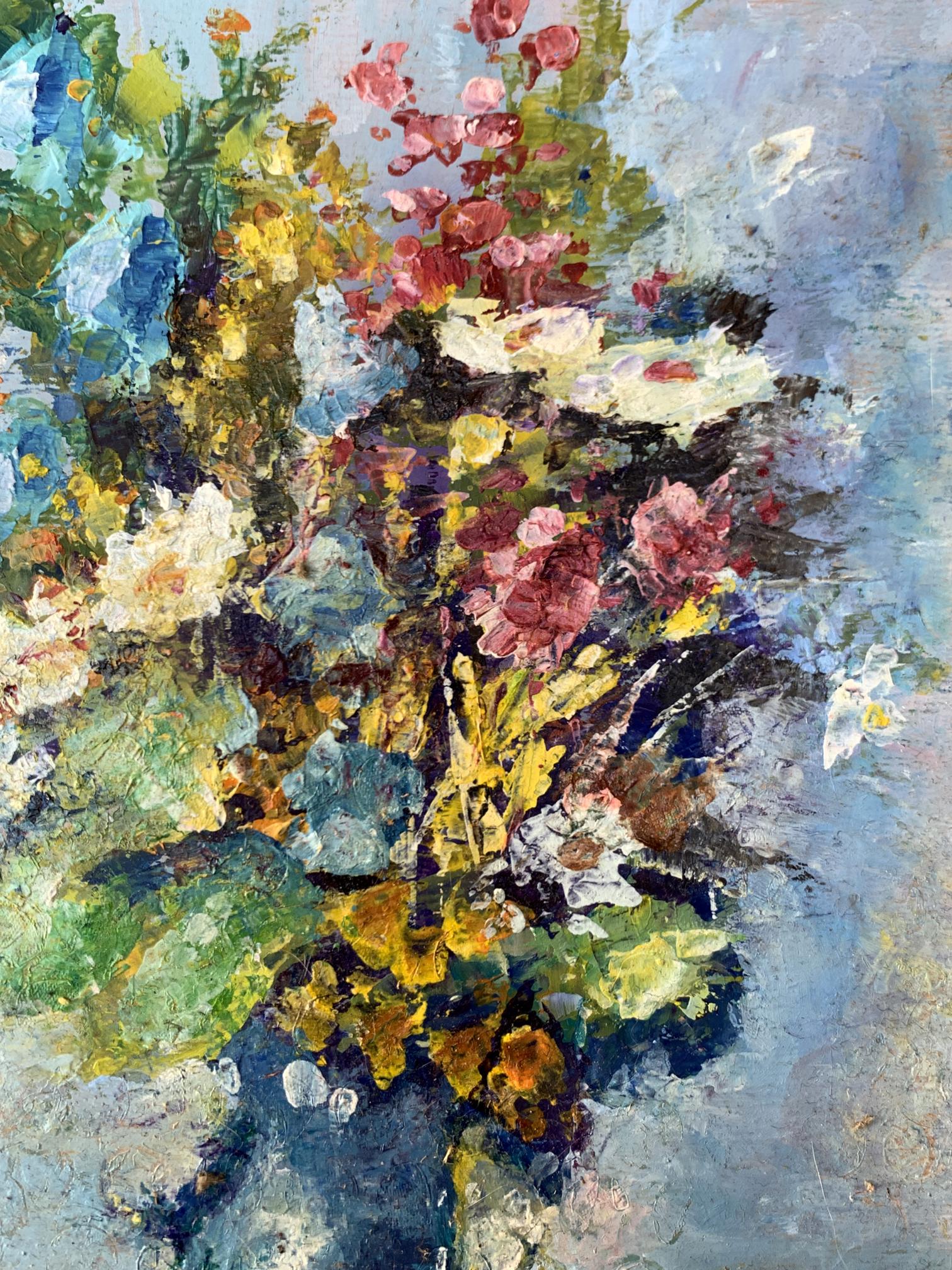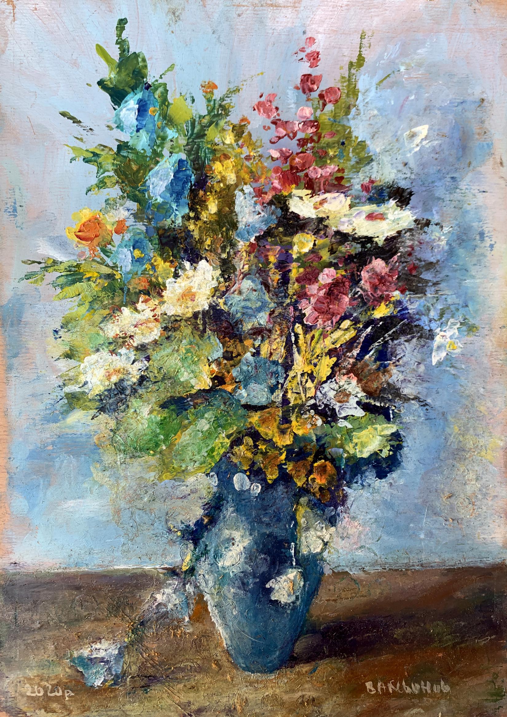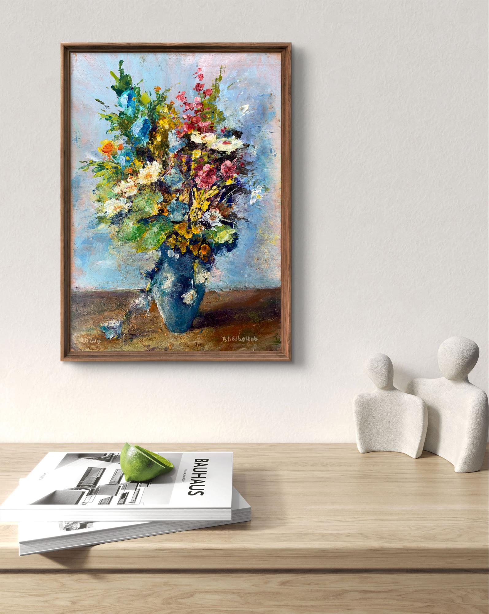 The painting titled "Wild Flowers in a Blue Vase" is a vivid and lively celebration of the beauty and diversity of nature, captured through an intricate arrangement of wildflowers in a deep blue vase. Executed in oil on cardboard, the piece radiates a sense of joy, spontaneity, and the untamed charm of nature's bounty.The central focus of the painting is the bouquet itself, bursting with a kaleidoscope of colors and textures. The flowers, painted with expressive and layered brushstrokes, vary in shape and hue, ranging from soft whites and vibrant yellows to deep blues and fiery reds. Each bloom seems to have its own personality, contributing to the dynamic energy of the composition. The artist skillfully conveys the delicate balance of chaos and harmony found in a field of wildflowers, allowing the bouquet to appear both meticulously arranged and naturally free-flowing.The blue vase serves as a grounding element, its deep and rich tones providing contrast to the bright and varied colors of the flowers. Its simple yet elegant design draws attention to the organic beauty above while anchoring the composition within the earthy wooden surface on which it rests. Subtle highlights and reflections on the vase give it depth and realism, while small imperfections, such as scattered petals or leaves, add a touch of authenticity.The background is painted in soft, muted tones of blue and beige, creating a serene and unobtrusive setting that allows the flowers to take center stage. The hazy blending of colors in the background evokes a dreamy atmosphere, reminiscent of a sunny morning or a tranquil afternoon.Through "Wild Flowers in a Blue Vase," the artist seeks to capture the fleeting beauty of nature, preserving a moment of untamed vitality and color. The wildflowers symbolize the resilience and abundance of life, while the blue vase acts as a metaphor for humanity’s attempt to contain and appreciate nature's wonders. The painting invites viewers to pause, reflect, and find joy in the simple yet profound beauty of the natural world, reminding us of the importance of cherishing life's ephemeral moments.