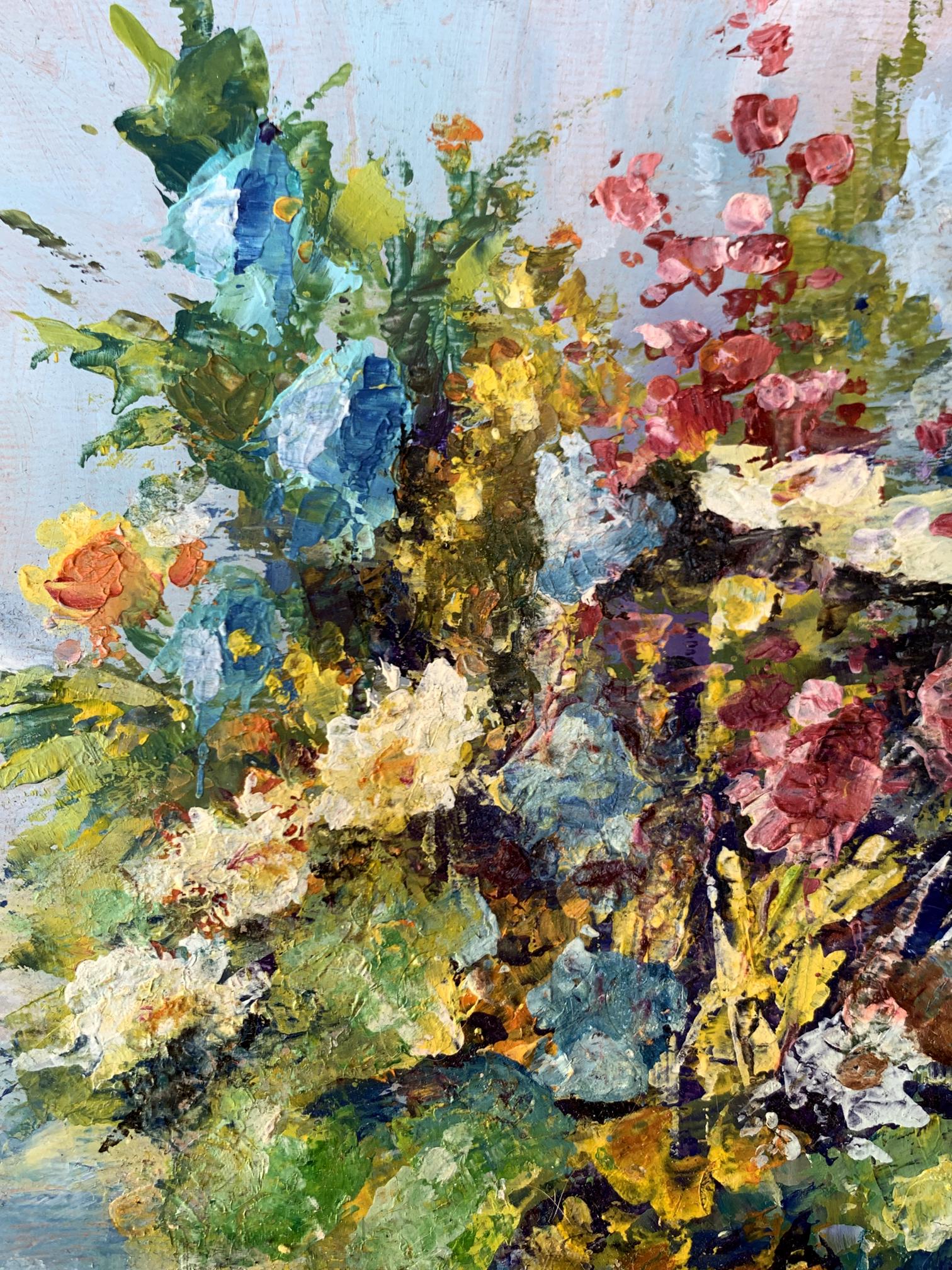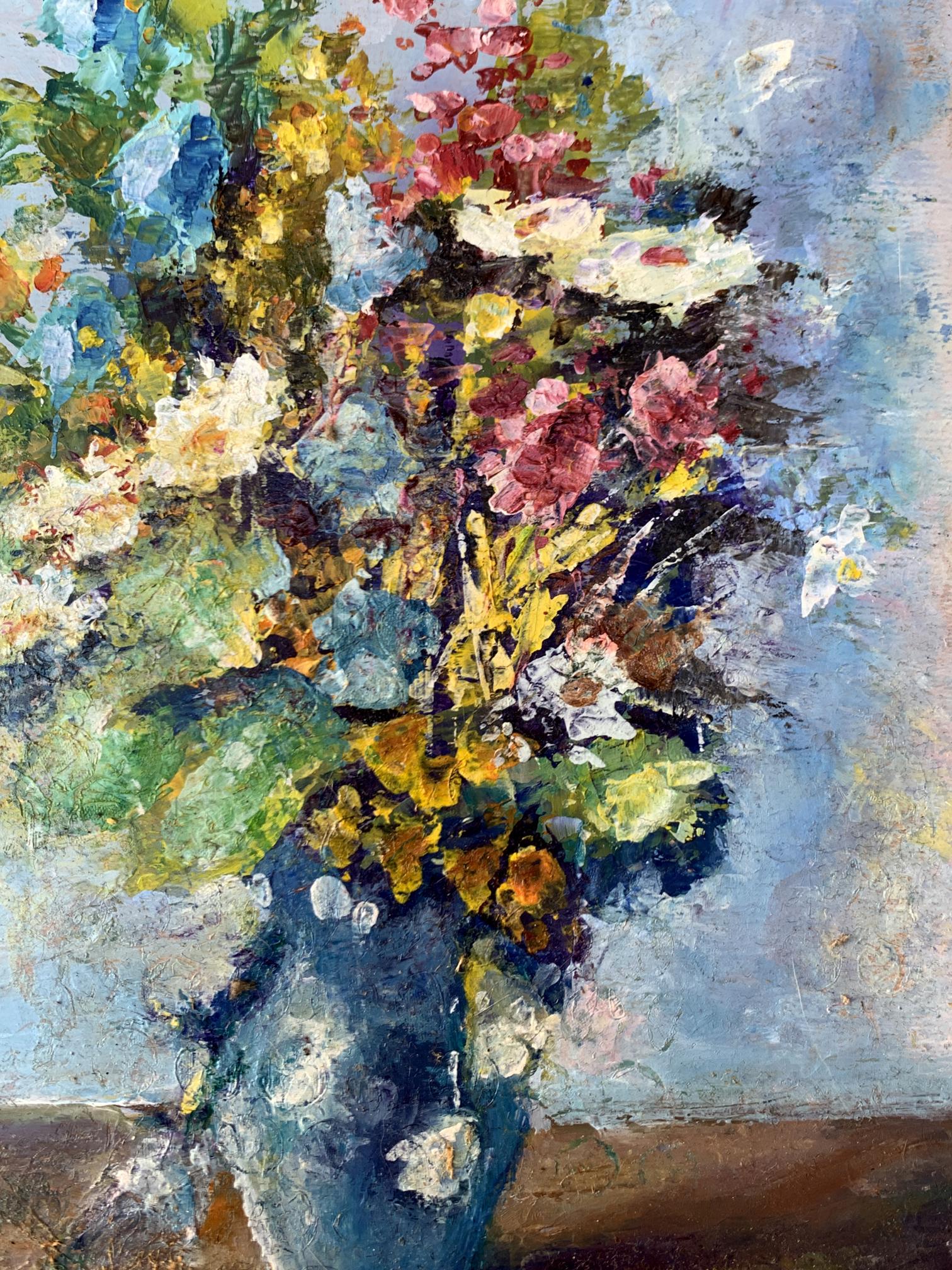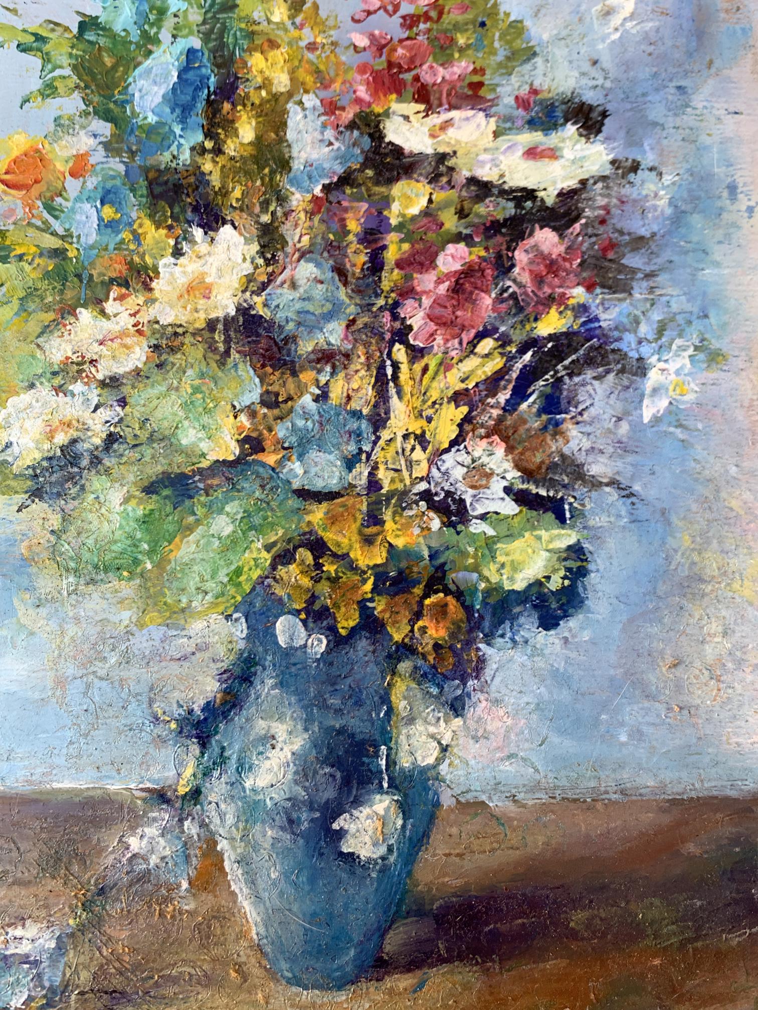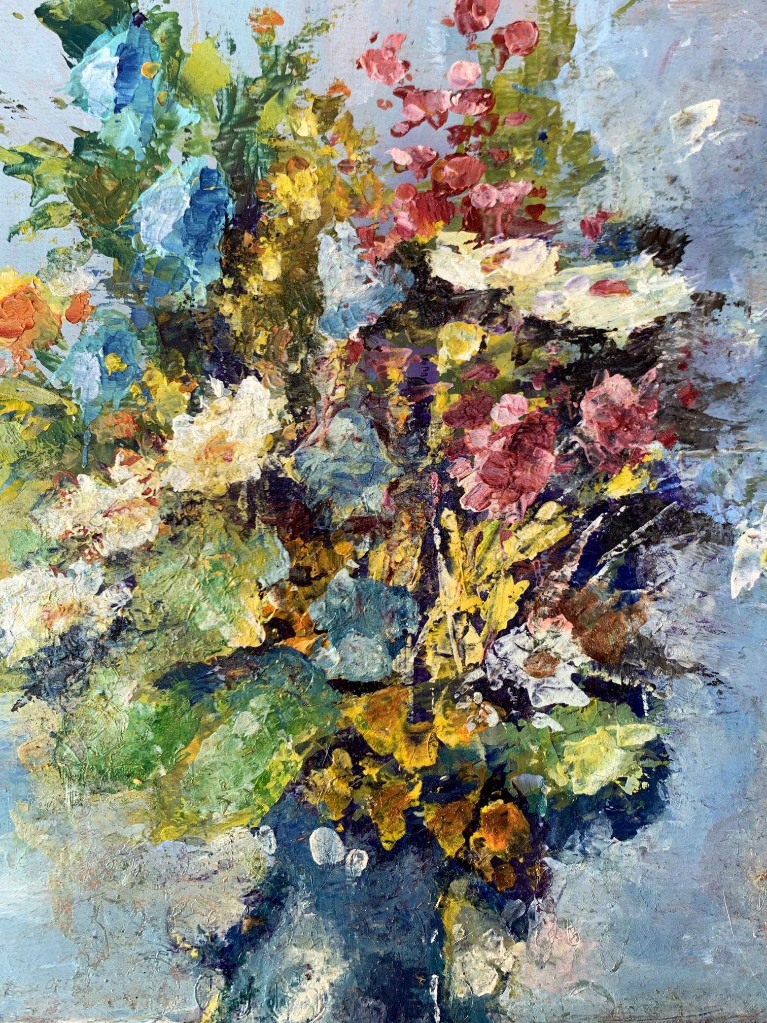 The painting titled "Wild Flowers in a Blue Vase" is a vivid and lively celebration of the beauty and diversity of nature, captured through an intricate arrangement of wildflowers in a deep blue vase. Executed in oil on cardboard, the piece radiates a sense of joy, spontaneity, and the untamed charm of nature's bounty.The central focus of the painting is the bouquet itself, bursting with a kaleidoscope of colors and textures. The flowers, painted with expressive and layered brushstrokes, vary in shape and hue, ranging from soft whites and vibrant yellows to deep blues and fiery reds. Each bloom seems to have its own personality, contributing to the dynamic energy of the composition. The artist skillfully conveys the delicate balance of chaos and harmony found in a field of wildflowers, allowing the bouquet to appear both meticulously arranged and naturally free-flowing.The blue vase serves as a grounding element, its deep and rich tones providing contrast to the bright and varied colors of the flowers. Its simple yet elegant design draws attention to the organic beauty above while anchoring the composition within the earthy wooden surface on which it rests. Subtle highlights and reflections on the vase give it depth and realism, while small imperfections, such as scattered petals or leaves, add a touch of authenticity.The background is painted in soft, muted tones of blue and beige, creating a serene and unobtrusive setting that allows the flowers to take center stage. The hazy blending of colors in the background evokes a dreamy atmosphere, reminiscent of a sunny morning or a tranquil afternoon.Through "Wild Flowers in a Blue Vase," the artist seeks to capture the fleeting beauty of nature, preserving a moment of untamed vitality and color. The wildflowers symbolize the resilience and abundance of life, while the blue vase acts as a metaphor for humanity’s attempt to contain and appreciate nature's wonders. The painting invites viewers to pause, reflect, and find joy in the simple yet profound beauty of the natural world, reminding us of the importance of cherishing life's ephemeral moments.