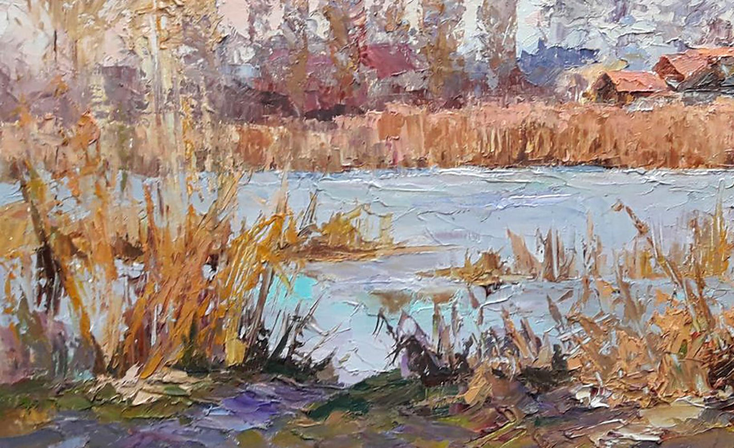 Immerse yourself in the tranquil solitude of winter with "Winter Fishing," a captivating oil painting by Serdyuk Boris Petrovich. This piece beautifully captures a moment of quiet contemplation and connection with nature, portraying a small, frozen pond on the outskirts of a village. The stark, serene beauty of the landscape is highlighted by the tall dried reeds lining the pond and the solitary figure of a fisherman standing on the ice, engrossed in his silent pursuit. In the background, the simple charm of rural houses adds a warm touch to the cold scene.