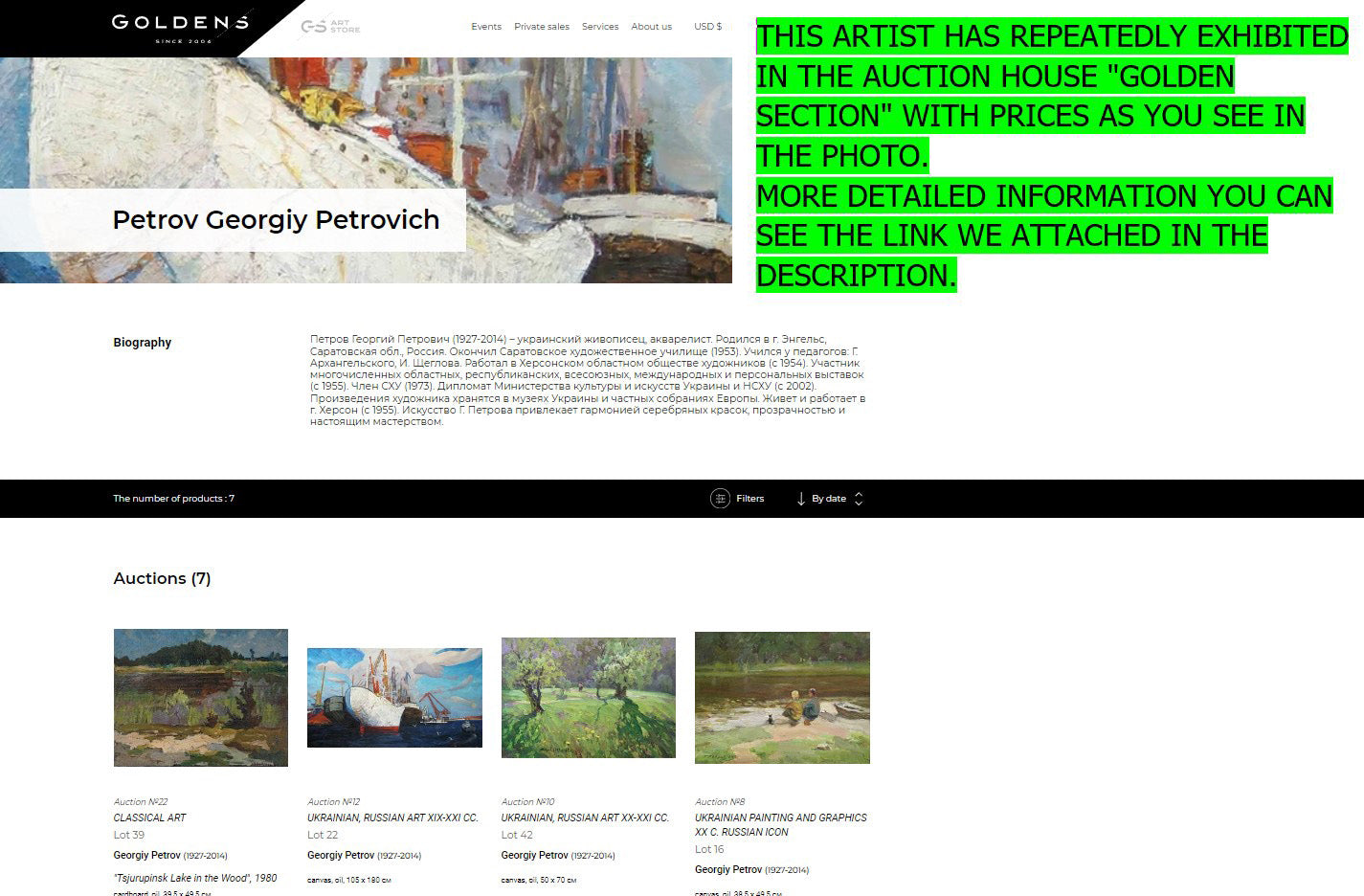 About the artists: Petrov Georgiy Petrovich (1927-2014) – Ukrainian painter, watercolorist. Born in Engels, Saratov region, Russia. Graduated from the Saratov Art School (1953). Studied with teachers: G. Arkhangelsky, I. Shcheglov. He worked in the Kherson Regional Society of Artists (since 1954). Participant of numerous regional, republican, all-Union, international and personal exhibitions (since 1955). Member of the Union of Artists (1973). Diplomat of the Ministry of Culture and Arts of Ukraine and the National Agricultural University (since 2002). The artist’s works are kept in museums in Ukraine and private collections in Europe. Lives and works in Kherson (since 1955). The art of G. Petrov attracts with the harmony of silver colors, transparency and real craftsmanship.