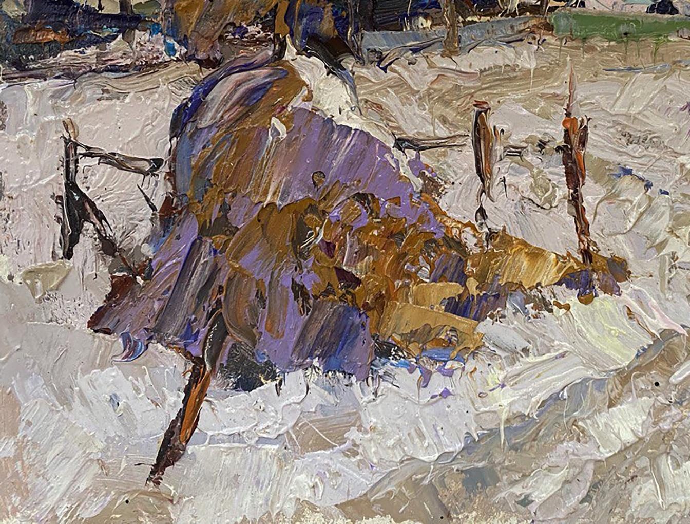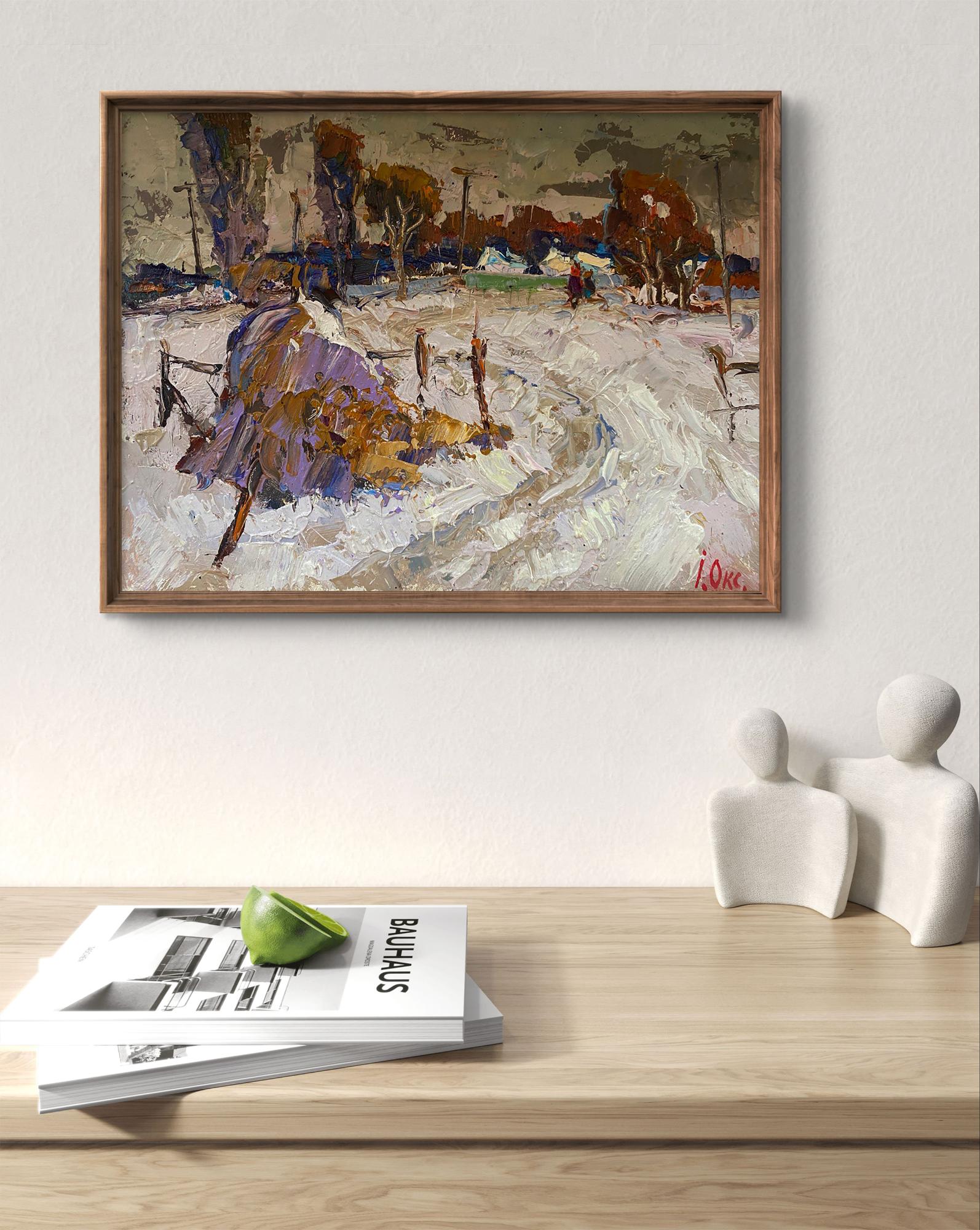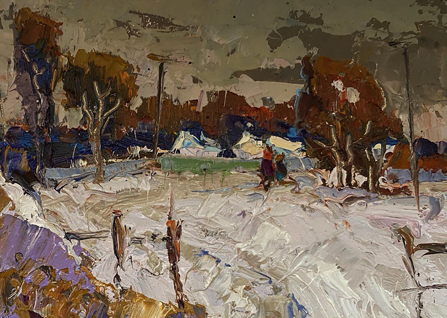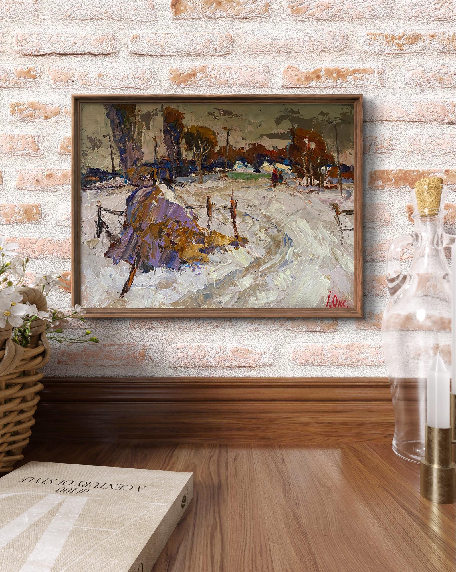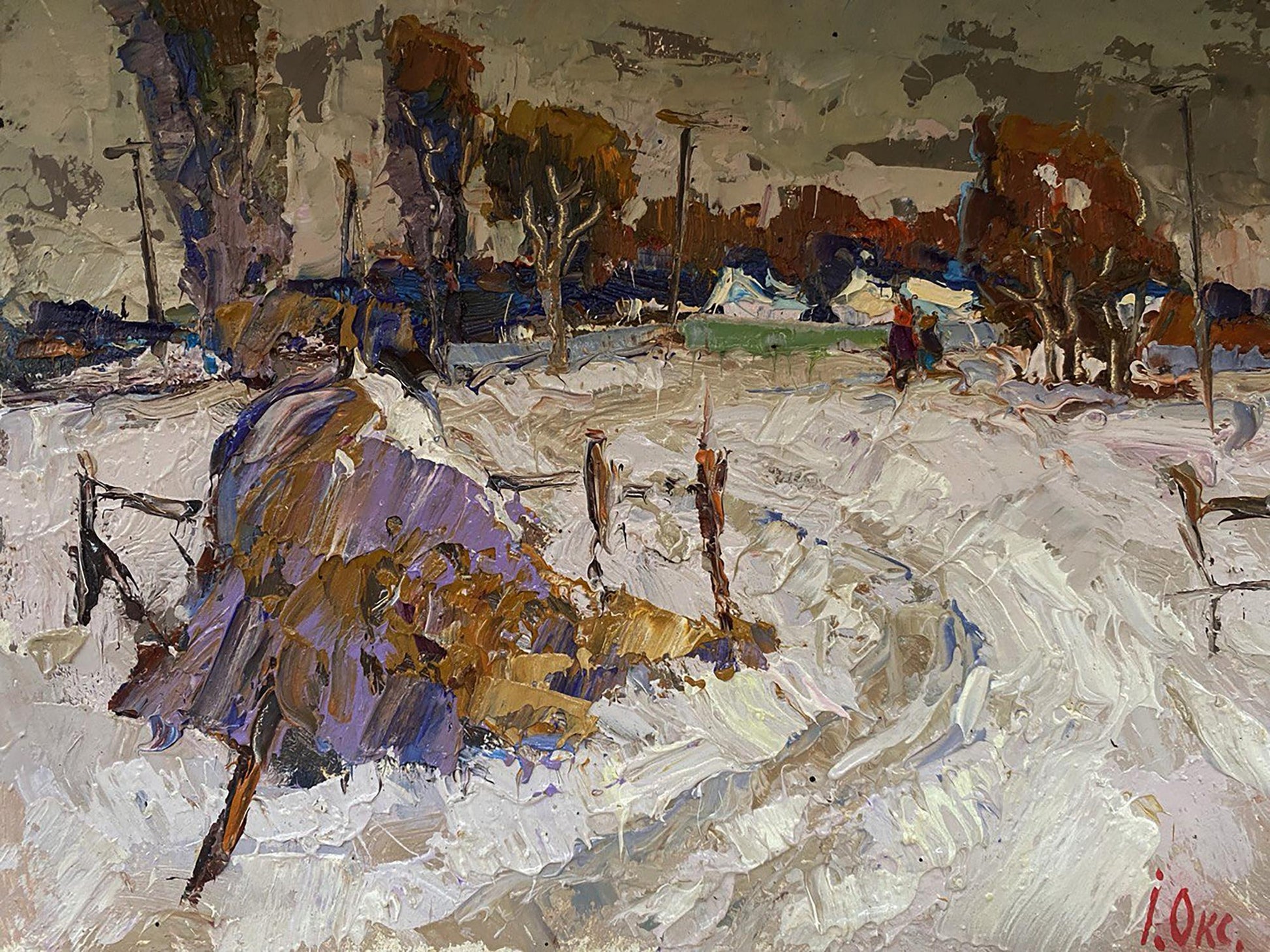 The painting titled "Winter Road Home" beautifully captures the quiet charm of a rural winter landscape. The scene portrays a snow-covered path leading to a distant village, evoking a sense of nostalgia and peace. The artist's use of bold brushstrokes and earthy tones combined with cool whites and blues adds depth and emotional resonance to the composition. The foreground features a haystack partially covered in snow, standing alone in the open field. The haystack's earthy hues of brown, gold, and purple stand out against the whiteness of the snow, providing a striking contrast. The thick, textured brushstrokes used to depict the haystack add a three-dimensional quality, making it feel almost tangible. The snow-covered ground is rendered with soft shades of white, grey, and blue, capturing the frosty texture of winter. The path through the snow is slightly uneven, suggesting the natural wear of footsteps and the passage of time. In the middle ground, the snowy road winds toward a cluster of houses nestled among bare trees. The village appears peaceful and serene, with smoke rising from chimneys, hinting at the warmth and coziness inside the homes. The bare trees stand tall, their dark branches reaching upward, contrasting with the light-colored sky. A fence made of wooden stakes lines the path, emphasizing the rural character of the scene. The fenceposts, covered in snow, add a rustic charm to the landscape. The background shows a soft grey sky, suggesting an overcast winter day. The muted tones of the sky add to the melancholic yet peaceful mood of the painting. The distant horizon fades gently into the sky, creating a sense of depth and vastness. The houses with colorful rooftops peeking through the trees add hints of life and warmth, breaking up the monotony of the winter landscape. In the distance, a solitary figure in a red coat walks along the road, adding a human element to the scene. The figure seems to be heading home, reinforcing the painting's theme of returning to warmth and safety. "Winter Road Home" is a captivating depiction of a rural winter landscape, filled with rich textures and thoughtful details. The painting conveys a sense of peace, warmth, and nostalgia, inviting the viewer to imagine the quiet beauty of winter life in a small village. Through its vivid brushstrokes and subtle color contrasts, the artwork evokes a feeling of serenity and connection to nature.