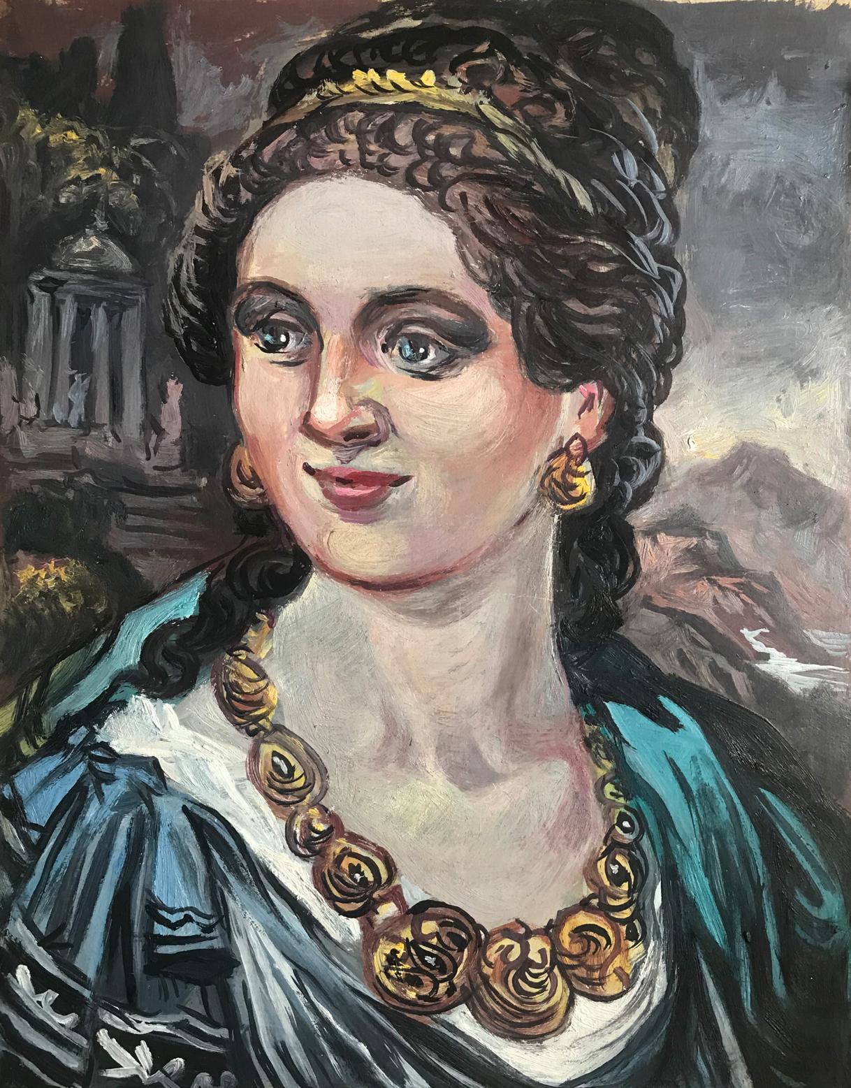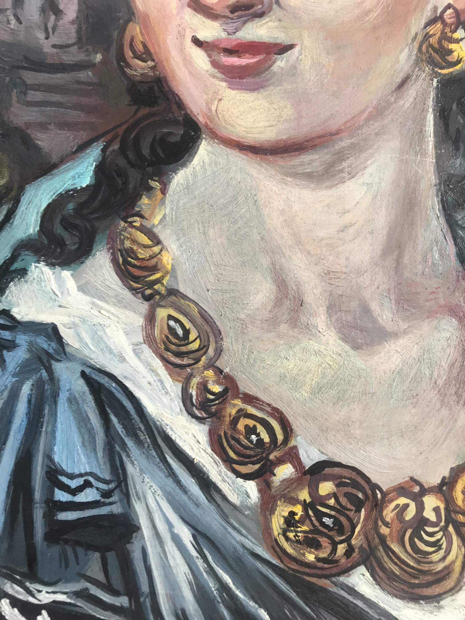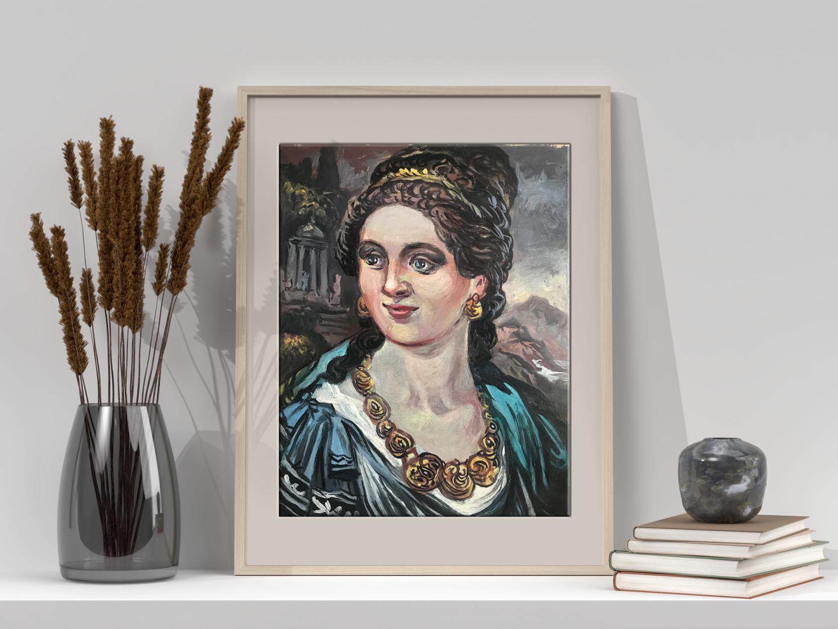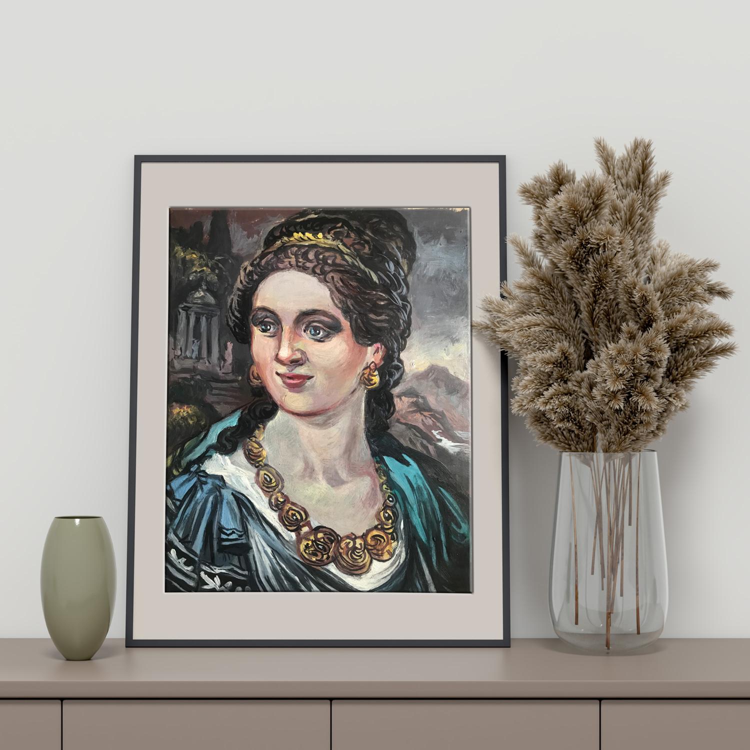 Introducing the "Woman with gold necklace" oil painting - an elegant and timeless piece that is sure to add a touch of class to any home or office. This beautiful painting features a young woman in an antique image, adorned with exquisite gold jewelry. The perfect addition to any art collection, this stunning oil painting is sure to impress anyone who sees it.