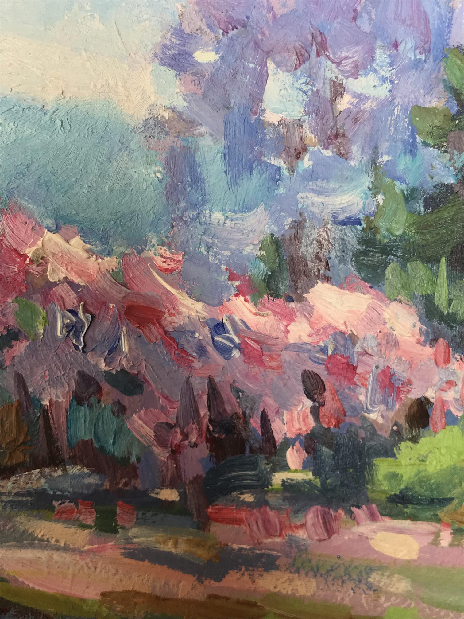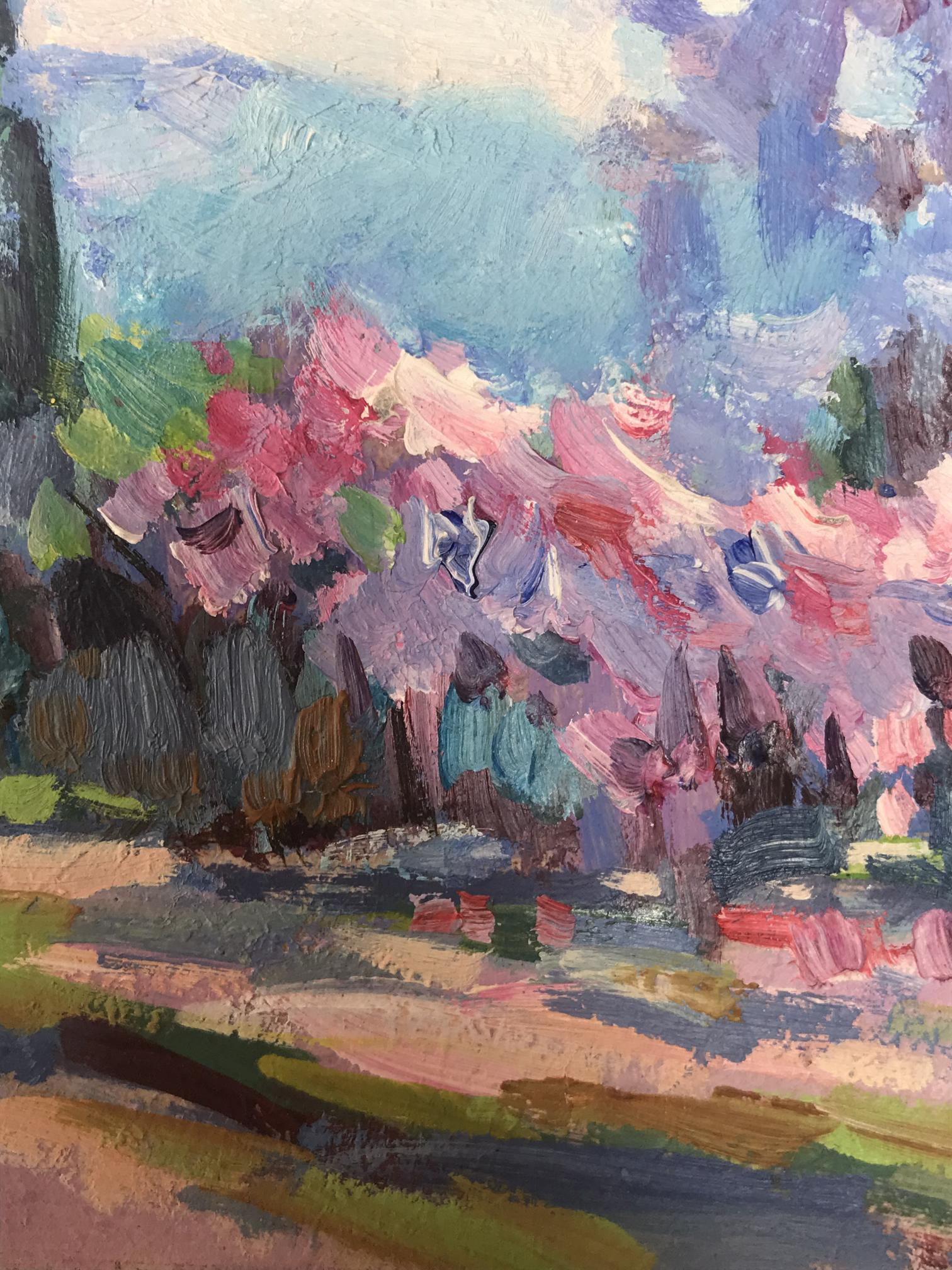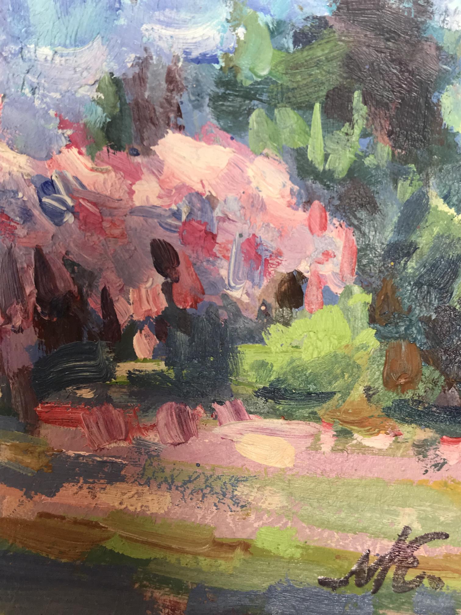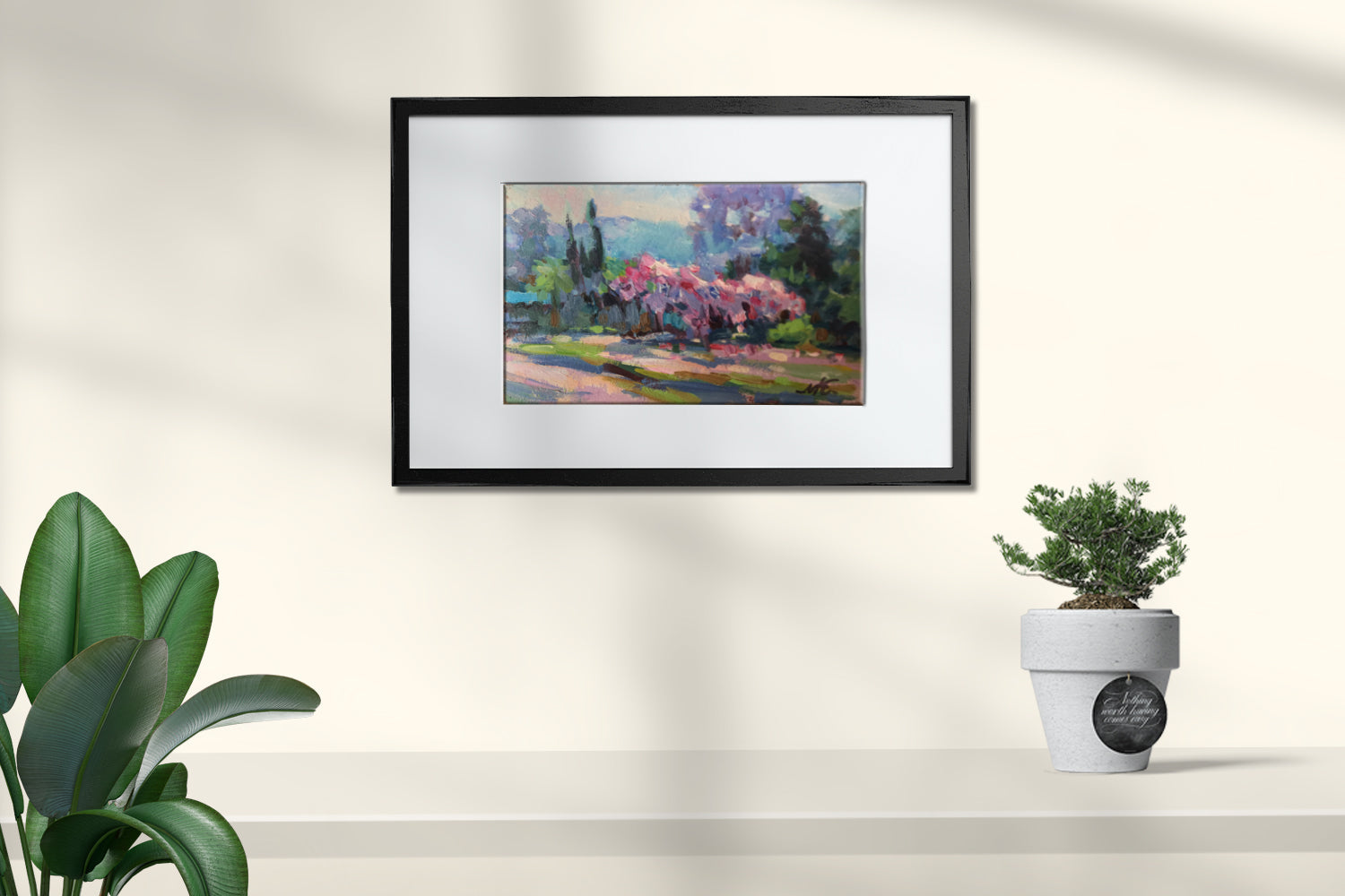 Marvel at the natural beauty of Yalta with this amazing oil painting. "Yaltan landscape" depicts the city park in all its glory, with flowering trees and exotic plants set against the backdrop of mountains. The sunlight give the scene a warm and inviting feeling, making it the perfect addition to any home.