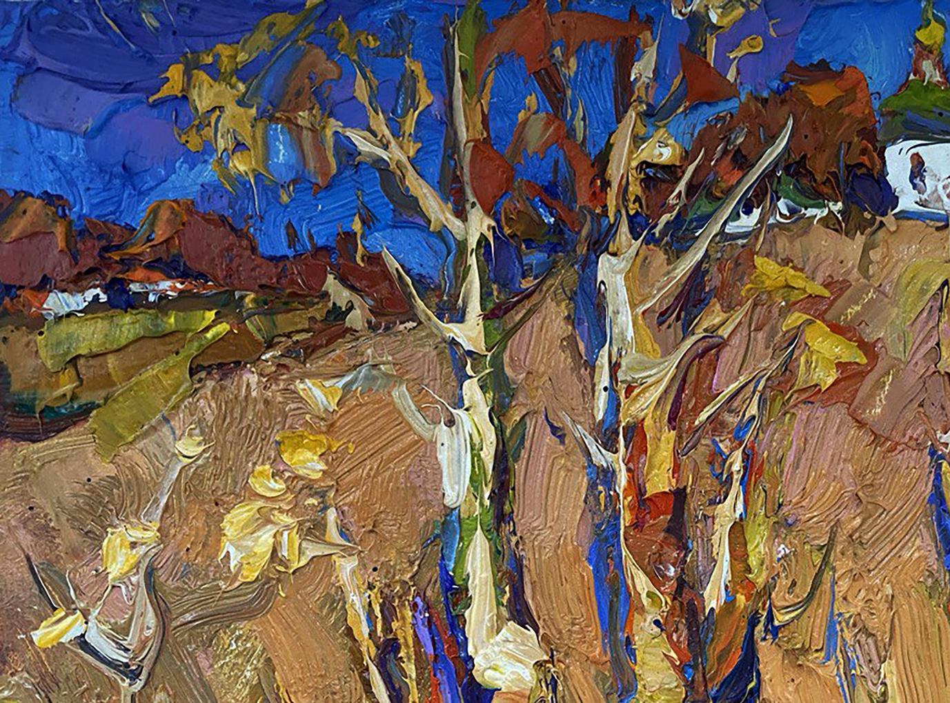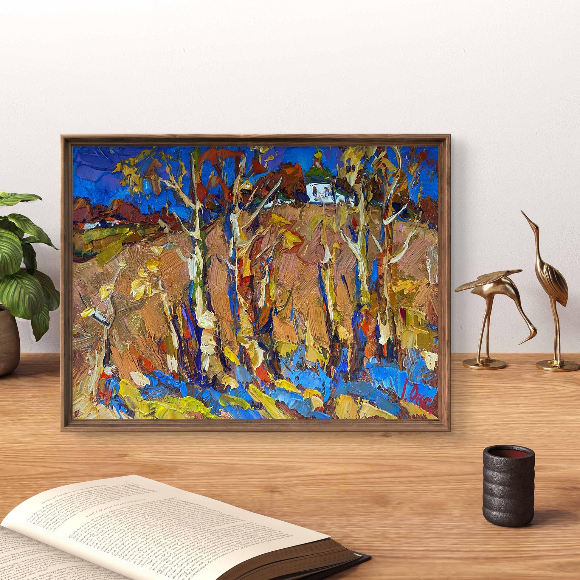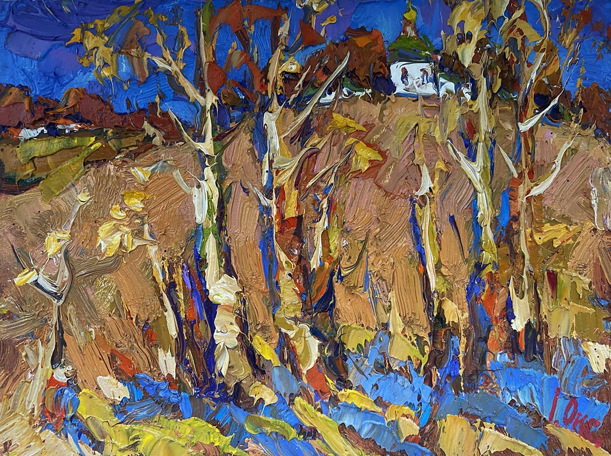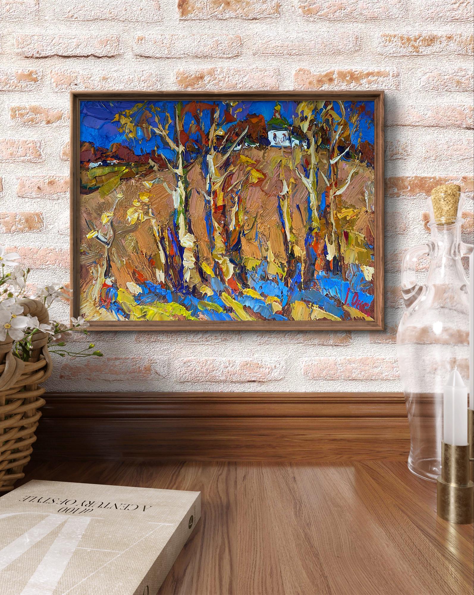 The painting "Yellow Autumn" is a vibrant depiction of a rural autumn landscape, capturing the golden hues of fall foliage against a deep blue sky. The artist uses dynamic brushstrokes and a rich color palette to convey the energy and warmth of the autumn season. The scene evokes a sense of nostalgia and tranquility, inviting the viewer to appreciate the changing beauty of nature. The foreground is filled with tall, slender trees, their bare branches and remaining yellow leaves painted with bold, textured strokes. The trees seem to sway gently in the autumn breeze, their golden and amber leaves blending harmoniously with the earthy tones of the landscape. The ground is covered in a mix of blue and brown tones, creating a contrast between the warmth of the autumn colors and the coolness of the shadows. The thick, layered brushstrokes add texture and depth, giving the impression of fallen leaves scattered across the ground. In the middle ground, the trees continue to spread out across the field, their branches intertwining and creating a natural pattern against the sky. The warm tones of yellow, orange, and brown dominate this area, symbolizing the peak of the autumn season. The trees' trunks are painted with a combination of light and dark shades, emphasizing the play of light and shadow in the landscape. The movement of the brushstrokes gives a sense of life and motion, making the scene feel alive with the essence of autumn. In the background, a small white building with a green roof is visible, nestled among the trees. The building, likely a village church or a house, adds a sense of human presence to the otherwise natural landscape. The green roof stands out against the warm autumn tones, providing a cool contrast that balances the composition. The sky above is painted in shades of deep blue and purple, with soft, swirling clouds in pink and white. The contrast between the warm tones of the field and the cool sky creates a sense of depth and atmosphere, emphasizing the vastness of the autumn landscape. "Yellow Autumn" is a richly textured, visually striking painting that captures the essence of the autumn season in a rural setting. Through the use of bold colors and dynamic brushstrokes, the artist conveys a sense of motion, warmth, and serenity, inviting viewers to appreciate the beauty and impermanence of nature. The painting is a celebration of the changing seasons, reminding us of the importance of pausing to admire the world around us.