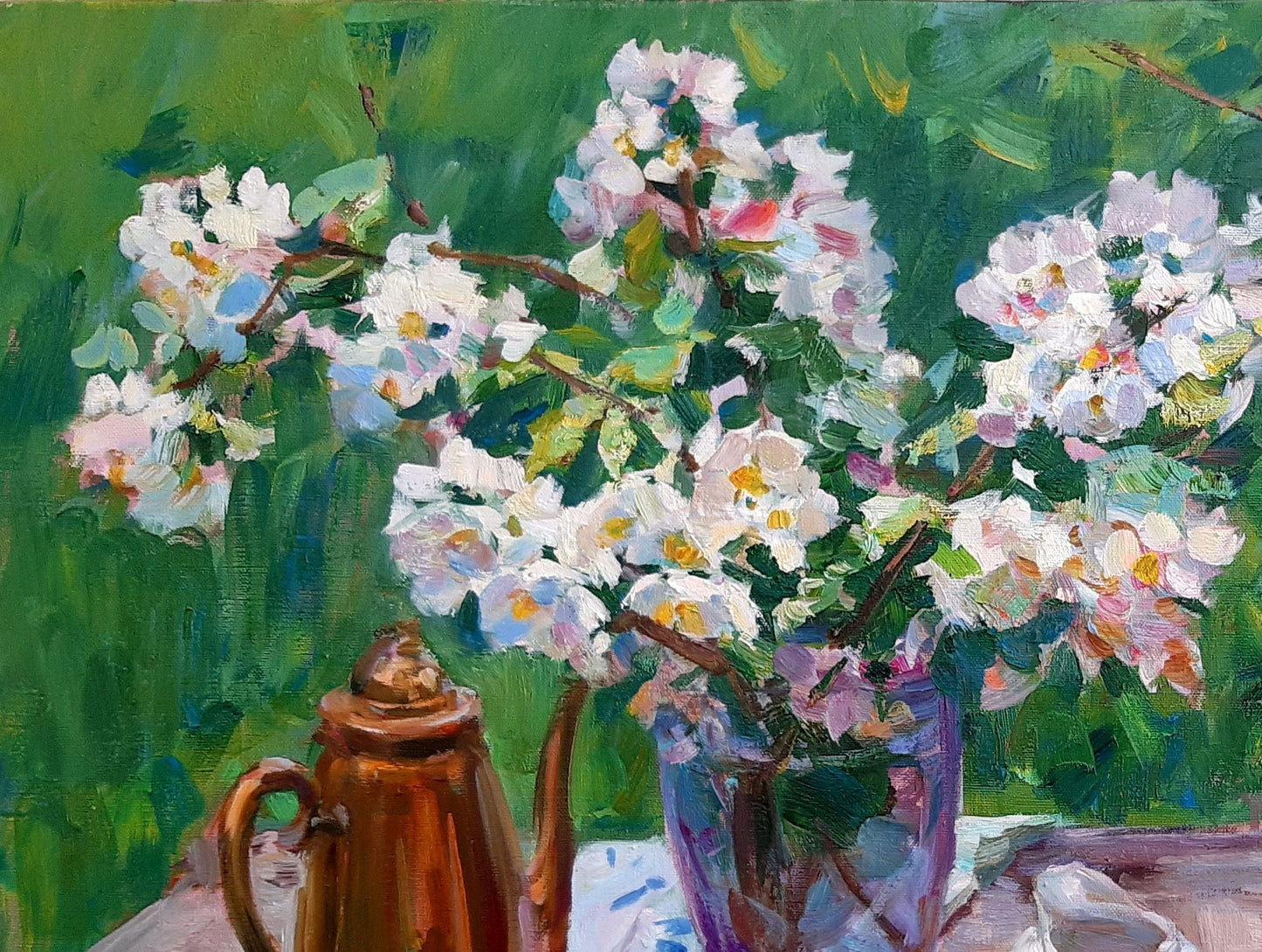 "Apricot Twigs" by Ukrainian artist Pereta Vyacheslav presents a peaceful and refreshing still life, where delicate apricot branches in full bloom take center stage. The soft white flowers contrast beautifully with the lush green background, creating a harmonious and calming composition. The wooden table, a simple yet charming element, adds warmth, while a copper teapot and a small jug contribute to the cozy, homely atmosphere of the scene.