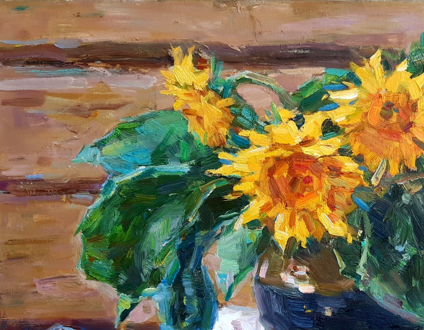 "Sunflowers" by Ukrainian artist Pereta Vyacheslav beautifully captures the warmth and vibrancy of a simple yet striking still life. The sunflowers, with their bright yellow petals and deep green leaves, are arranged in a rustic, dark vase at the center of the composition. Accompanied by apples and a small pot, this scene evokes a sense of rural life, simplicity, and connection to nature. The artist’s bold brushstrokes and vibrant colors bring life to everyday objects, transforming them into symbols of abundance and joy.