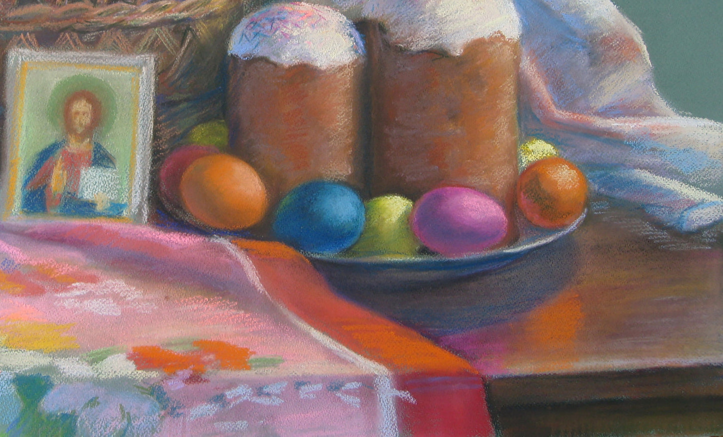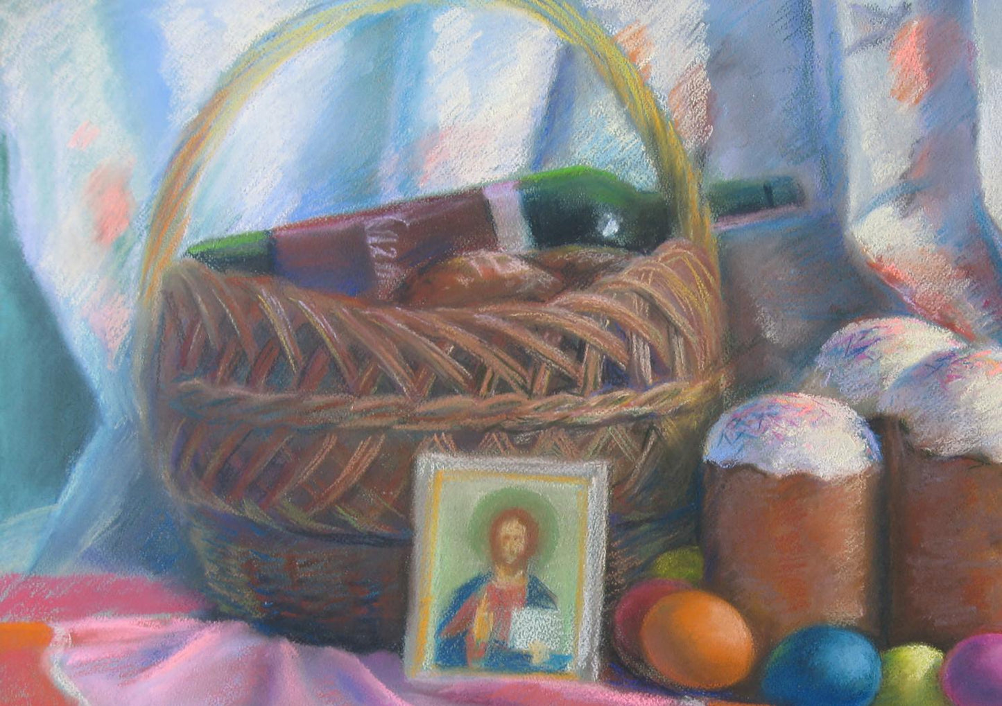 The background of the painting, executed in soft pastel tones, ensures that the focus remains on the richness of the Easter tradition represented in the basket, cakes, eggs, and icon. The choice of medium—pastel on paper—enhances the softness and light of the scene, inviting the viewer into a moment of peaceful reflection.