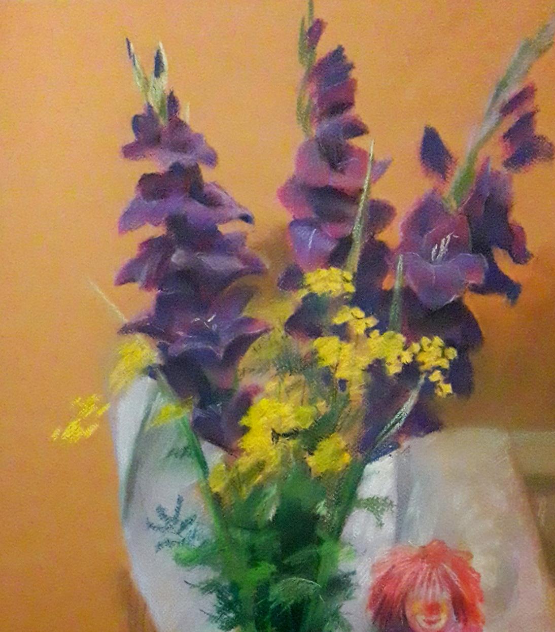 Dive into the vibrant world of "Still Life with a Clown," a pastel on paper masterpiece by Serdyuk Boris Petrovich. This painting, a significant addition to our Collection of Still Lifes and Collection of Flowers, offers a captivating scene that combines the natural beauty of tall purple gladioli and delicate yellow wildflowers with the whimsical charm of a toy clown dressed in a multi-colored suit. Accompanied by sweets on a plate, this still life is a feast for the senses, inviting viewers into a moment of joy and color.