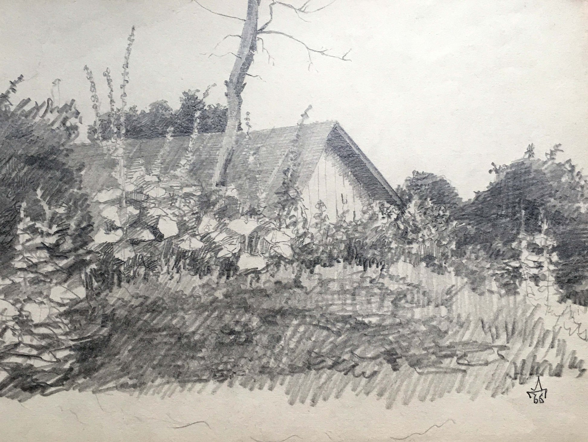 Pencil painting The garden near the house is overgrown Dmitry Lednev
