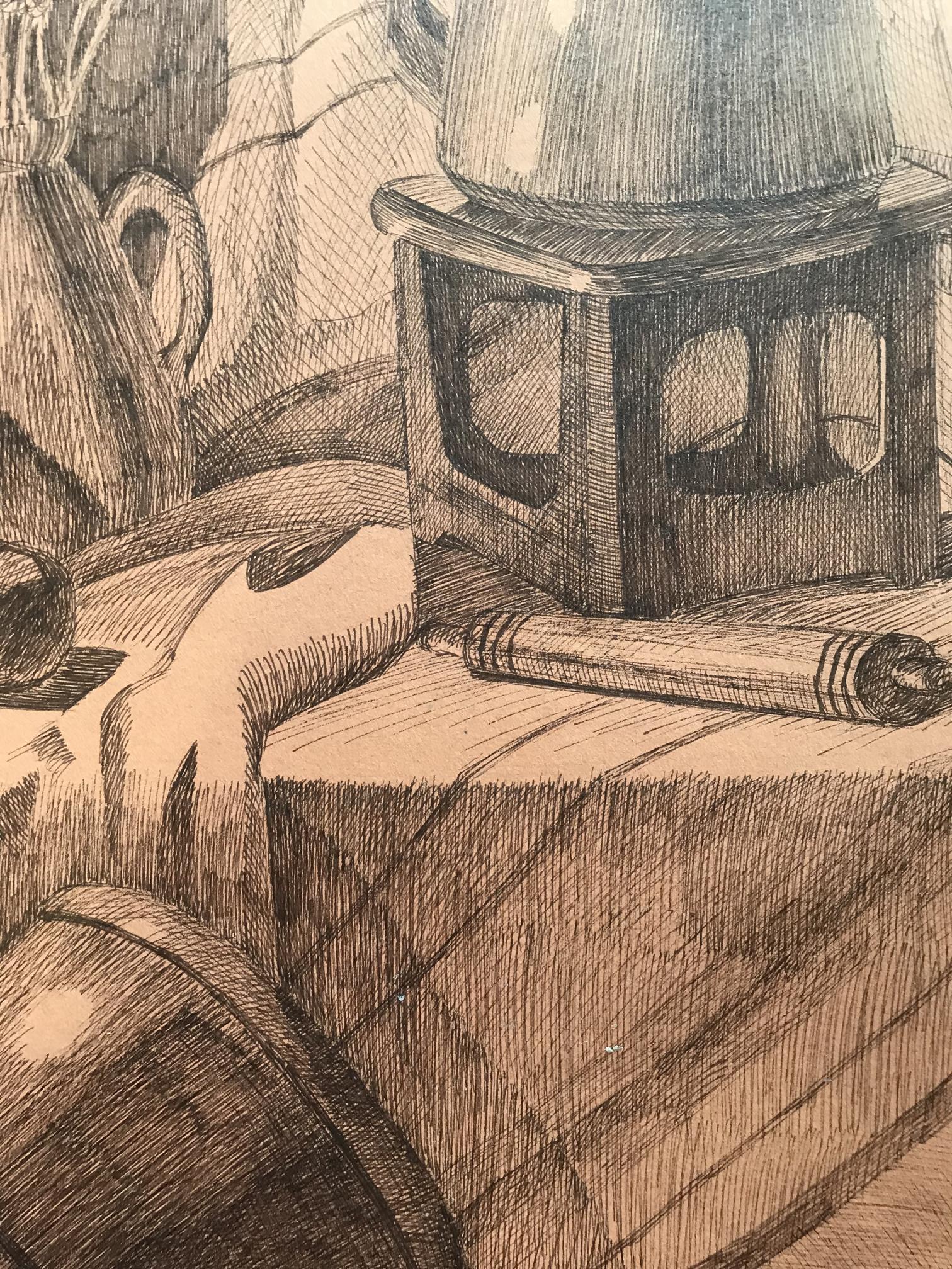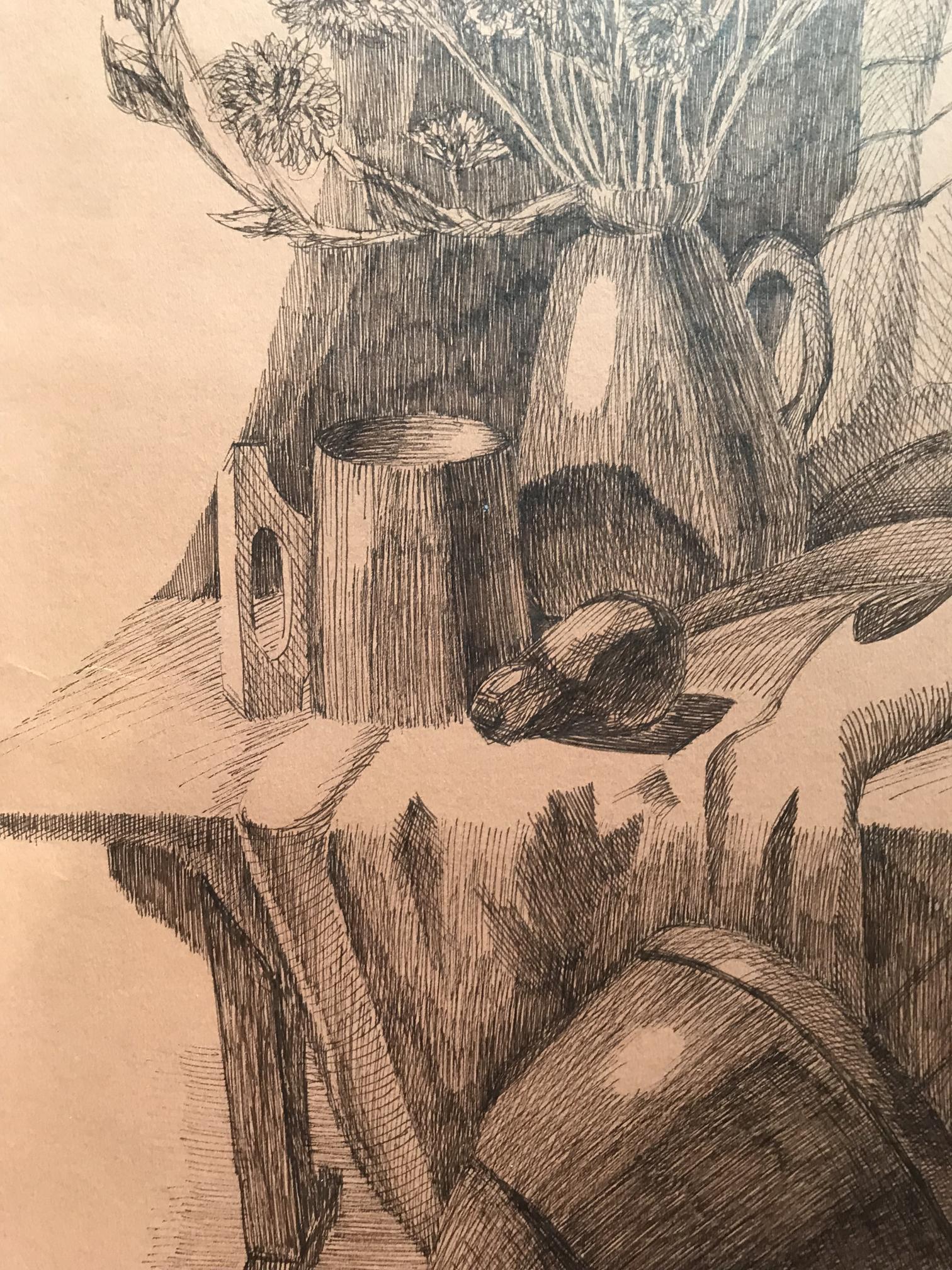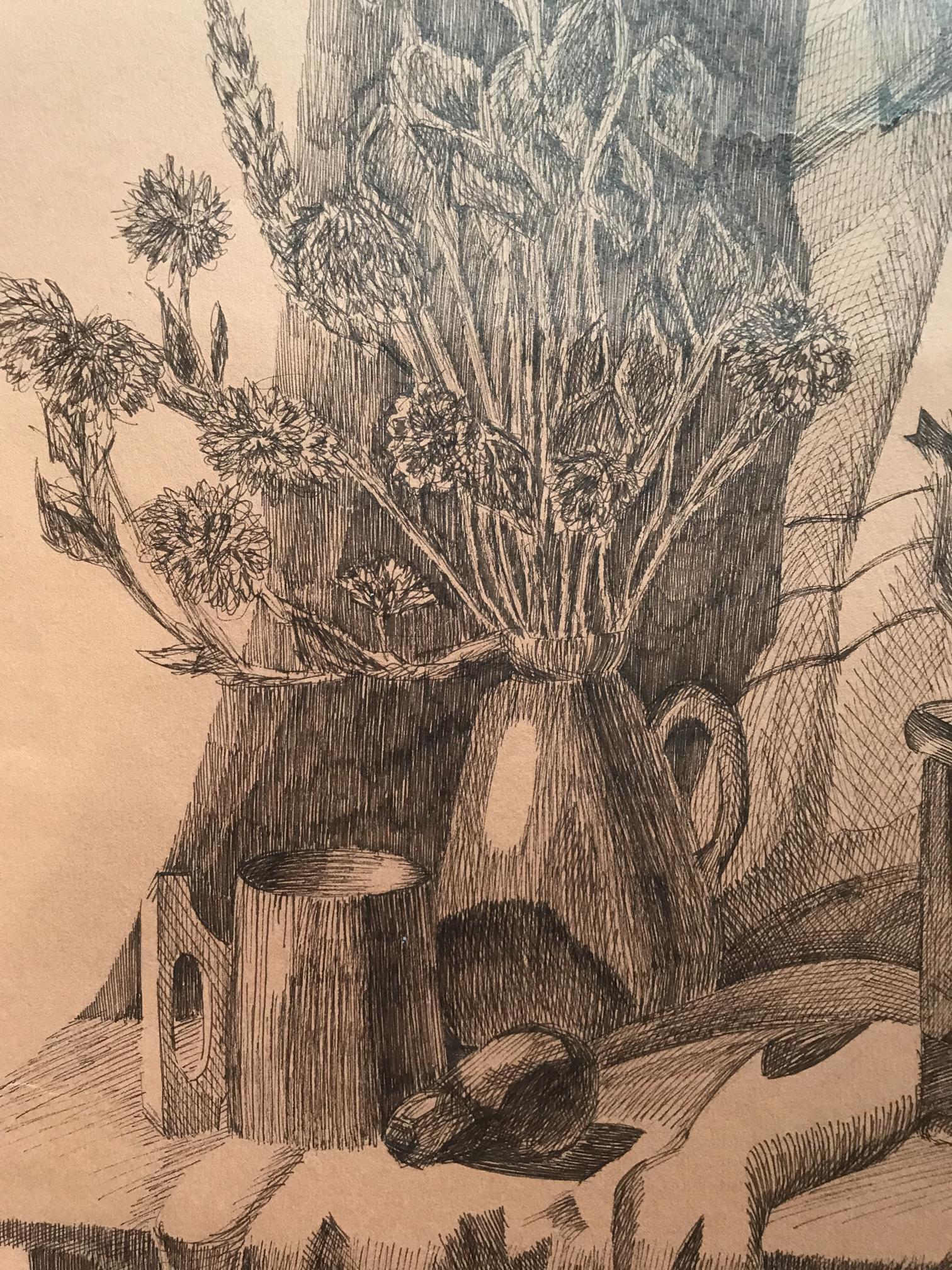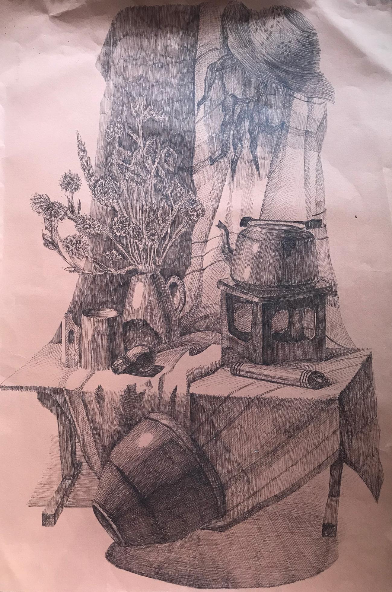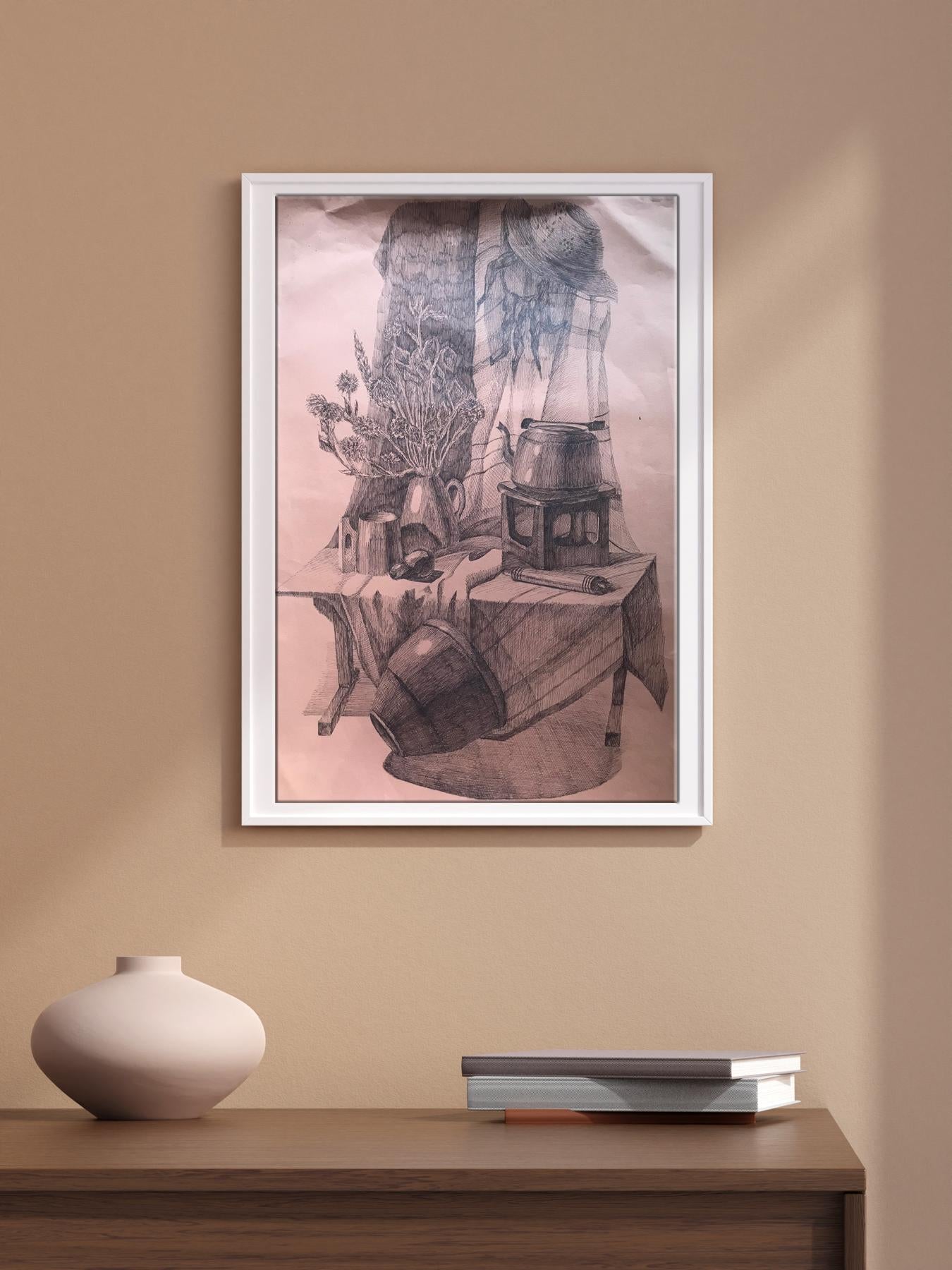 This beautiful painting features an abstract still life with a kettle, bouquet, and hat. The muted colors and simple composition create a feeling of relaxation and serenity, making it the perfect addition to any home. Whether you're looking to add a touch of elegance to your living room or want to create a tranquil oasis in your bedroom, this painting is sure to do the trick. With its timeless subject matter and calming atmosphere, it's sure to be a favorite for years to come.